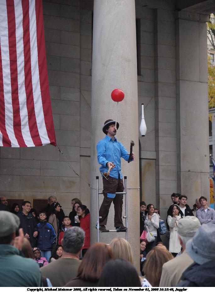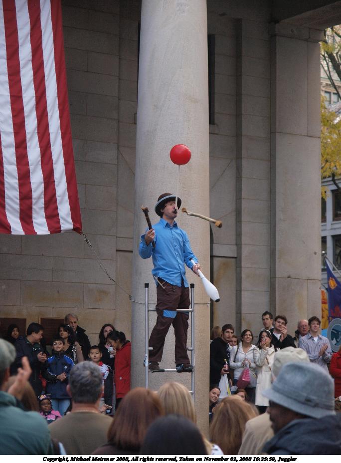 Picture #110: Juggler #3 684x928, 96,099 bytes (94K), (html file) Copyright, Michael Meissner 2008, All rights reserved Olympus E-3 camera with Olympus 14-54mm f/2.8-3.5 lens f/3.5, ISO 400, 1/250 sec, 54.0mm, shutter priority, natural color, auto gradation, matrix metering, IS1 (All Direction Shake IS) 35mm equivalent focal length 108.0mm Programs used: rotate Taken by Michael Meissner on November 01, 2008 16:25:50 Last modified on November 02, 2008 at 21:31 |