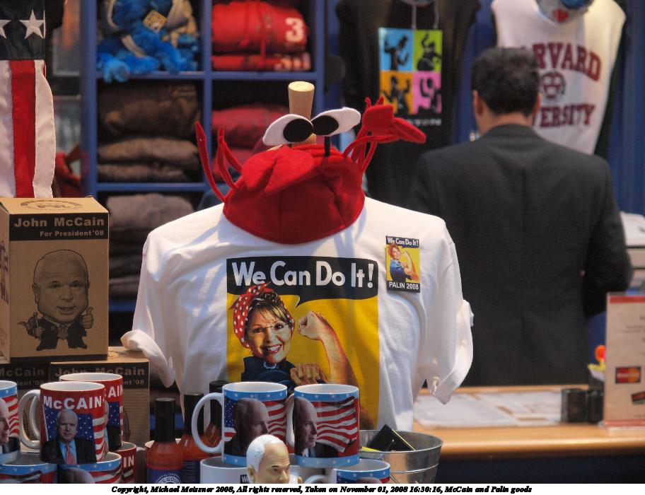 Picture #109: McCain and Palin goods 912x700, 103,996 bytes (102K), (html file) Copyright, Michael Meissner 2008, All rights reserved Olympus E-3 camera with Olympus 14-54mm f/2.8-3.5 lens f/3.5, ISO 640, 1/100 sec, 54.0mm, auto mode, natural color, auto gradation, matrix metering, IS1 (All Direction Shake IS) 35mm equivalent focal length 108.0mm Taken by Michael Meissner on November 01, 2008 16:30:16 Last modified on November 02, 2008 at 21:32 |
