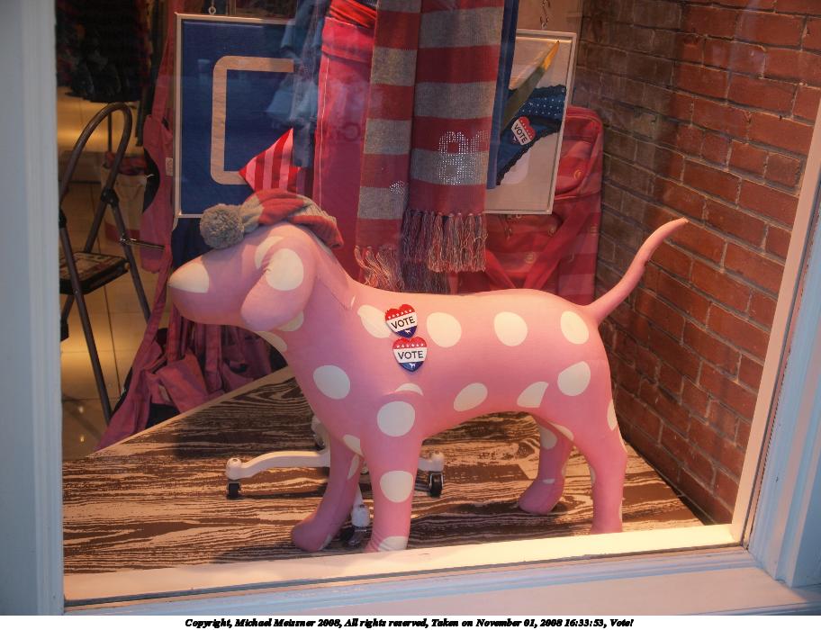 Picture #107: Vote! 912x700, 106,254 bytes (104K), (html file) Copyright, Michael Meissner 2008, All rights reserved Olympus E-3 camera with Olympus 14-54mm f/2.8-3.5 lens f/3.2, ISO 160, 1/60 sec, 23.0mm, auto mode, natural color, auto gradation, matrix metering, IS1 (All Direction Shake IS) 35mm equivalent focal length 46.0mm Taken by Michael Meissner on November 01, 2008 16:33:53 Last modified on November 02, 2008 at 21:33 |