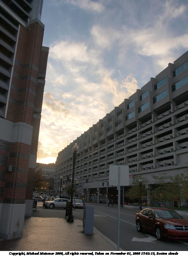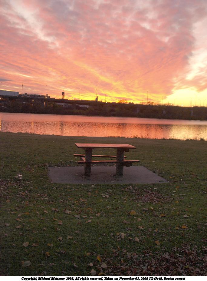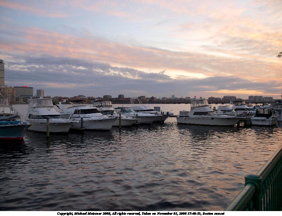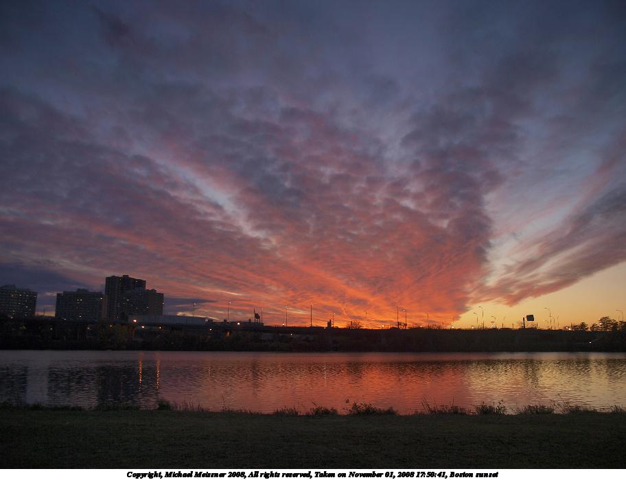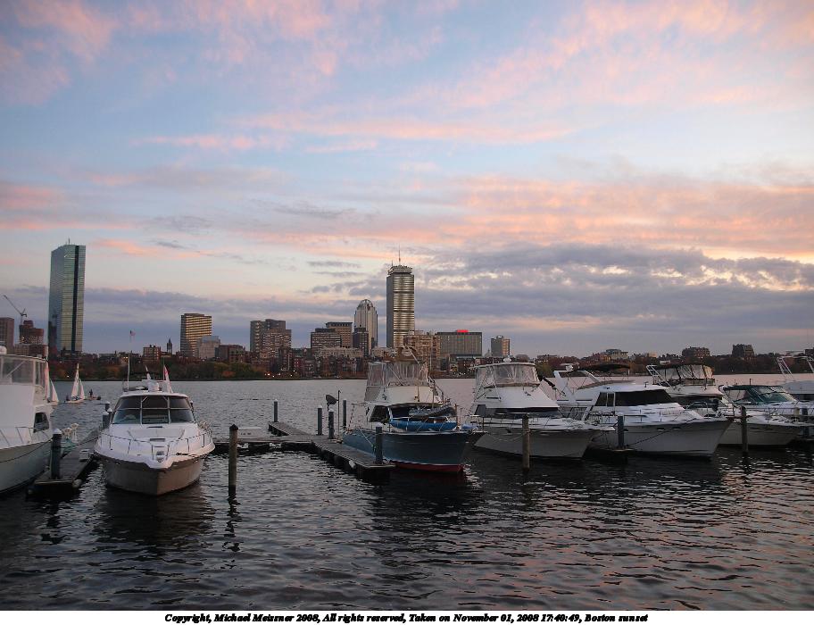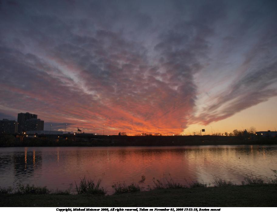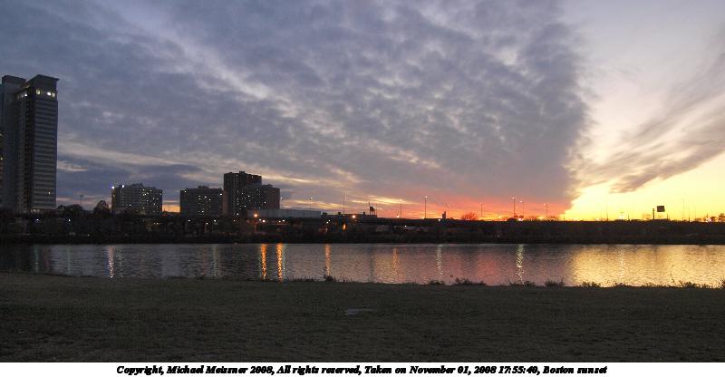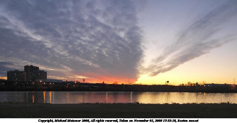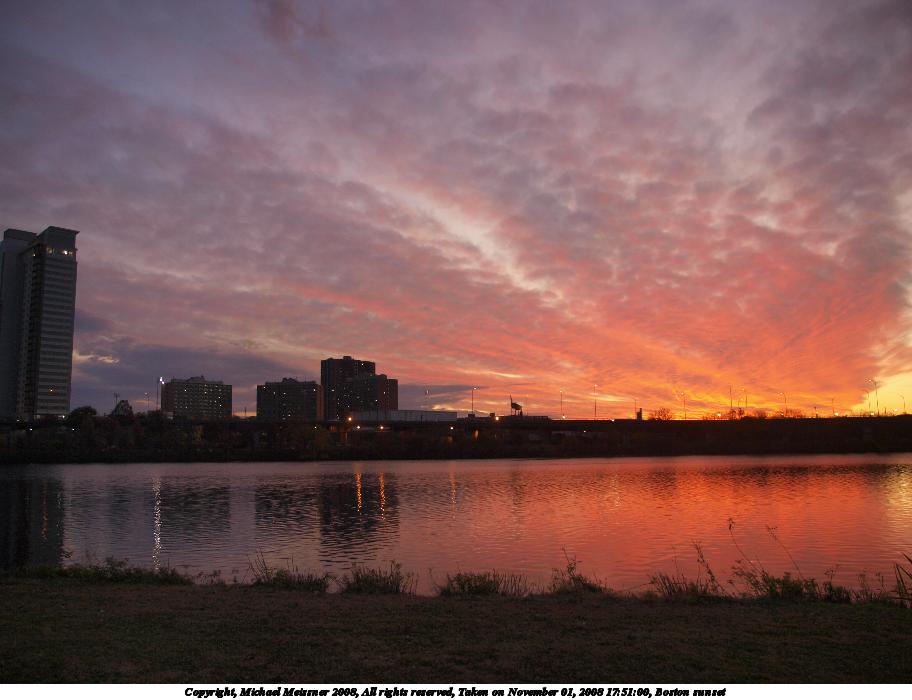 Picture #87: Boston sunset #5 912x700, 70,007 bytes (69K), (html file) Copyright, Michael Meissner 2008, All rights reserved Olympus E-3 camera with Olympus 14-54mm f/2.8-3.5 lens f/2.8, ISO 100, 1/80 sec, 14.0mm, auto mode, natural color, auto gradation, matrix metering, IS1 (All Direction Shake IS), exposure bracketing (shot 1) 35mm equivalent focal length 28.0mm Programs used: gimp Taken by Michael Meissner on November 01, 2008 17:50:41 Last modified on November 03, 2008 at 07:48 This picture is one of my favorites. |