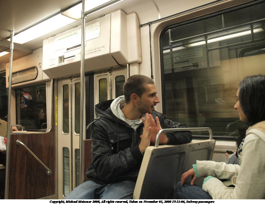 Picture #99: Subway passengers #2 912x700, 105,197 bytes (103K), (html file) Copyright, Michael Meissner 2008, All rights reserved Olympus E-3 camera with Olympus 14-54mm f/2.8-3.5 lens f/2.8, ISO 800, 1/30 sec, 17.0mm, auto mode, natural color, auto gradation, matrix metering, IS1 (All Direction Shake IS) 35mm equivalent focal length 34.0mm Taken by Michael Meissner on November 01, 2008 17:11:06 Last modified on November 02, 2008 at 21:39 |