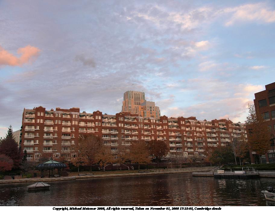 Picture #95: Cambridge clouds #2 912x700, 108,441 bytes (106K), (html file) Copyright, Michael Meissner 2008, All rights reserved Olympus E-3 camera with Olympus 14-54mm f/2.8-3.5 lens f/3.5, ISO 100, 1/125 sec, 14.0mm, auto mode, natural color, auto gradation, matrix metering, IS1 (All Direction Shake IS) 35mm equivalent focal length 28.0mm Programs used: gimp Taken by Michael Meissner on November 01, 2008 17:25:05 Last modified on November 02, 2008 at 21:47 |