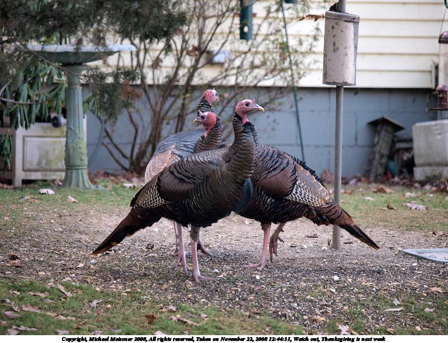 Picture #51: Watch out, Thanksgiving is next week 912x700, 171,967 bytes (168K), (html file) Copyright, Michael Meissner 2008, All rights reserved Olympus E-3 camera with Olympus 50-200mm f/2.8-3.5 lens f/3.2, ISO 320, 1/250 sec, 158.0mm, auto mode, natural color, auto gradation, matrix metering, IS1 (All Direction Shake IS) 35mm equivalent focal length 317.0mm Programs used: gimp Taken by Michael Meissner on November 22, 2008 12:44:31 Last modified on November 23, 2008 at 13:57 |
