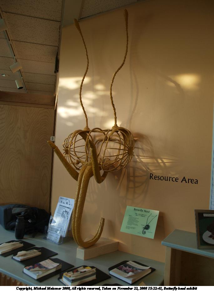 Picture #26: Butterfly head exhibit 684x928, 75,054 bytes (74K), (html file) Copyright, Michael Meissner 2008, All rights reserved Olympus E-3 camera with Olympus 14-54mm f/2.8-3.5 lens f/2.8, ISO 100, 1/80 sec, 14.0mm, auto mode, natural color, auto gradation, matrix metering, IS1 (All Direction Shake IS) 35mm equivalent focal length 28.0mm Programs used: rotate Taken by Michael Meissner on November 22, 2008 15:22:41 Last modified on December 05, 2008 at 09:36 |