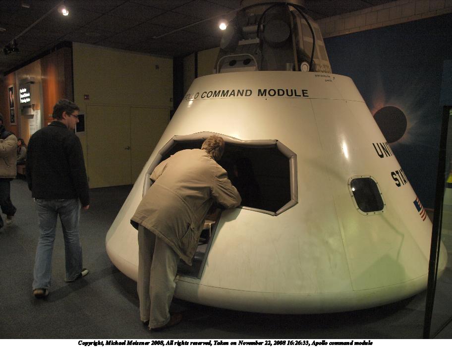 Picture #19: Apollo command module 912x700, 80,987 bytes (80K), (html file) Copyright, Michael Meissner 2008, All rights reserved Olympus E-3 camera with Olympus 14-54mm f/2.8-3.5 lens f/2.8, ISO 800, 1/60 sec, 14.0mm, auto mode, natural color, auto gradation, matrix metering, IS1 (All Direction Shake IS) 35mm equivalent focal length 28.0mm Taken by Michael Meissner on November 22, 2008 16:26:33 Last modified on December 17, 2008 at 10:00 |