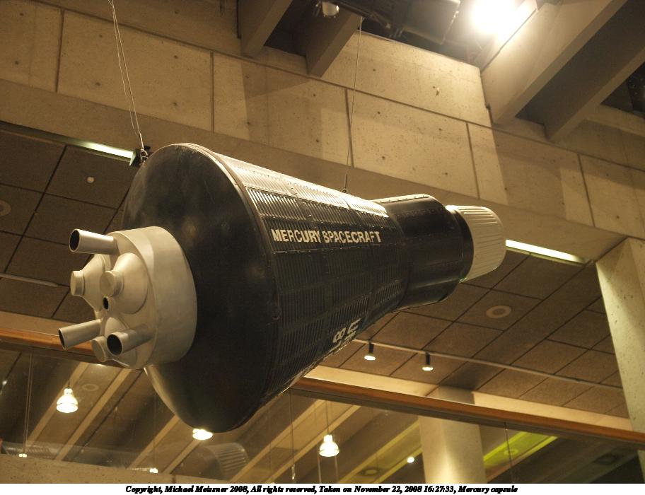 Picture #17: Mercury capsule 912x700, 87,400 bytes (86K), (html file) Copyright, Michael Meissner 2008, All rights reserved Olympus E-3 camera with Olympus 14-54mm f/2.8-3.5 lens f/3.2, ISO 800, 1/8 sec, 32.0mm, auto mode, natural color, auto gradation, matrix metering, IS1 (All Direction Shake IS) 35mm equivalent focal length 64.0mm Taken by Michael Meissner on November 22, 2008 16:27:33 Last modified on December 17, 2008 at 10:01 |