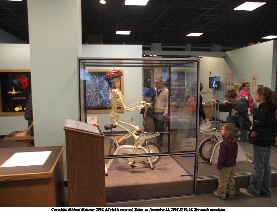 Picture #16: Too much exercising 912x700, 92,629 bytes (91K), (html file) Copyright, Michael Meissner 2008, All rights reserved Olympus E-3 camera with Olympus 14-54mm f/2.8-3.5 lens f/2.8, ISO 800, 1/60 sec, 14.0mm, auto mode, natural color, auto gradation, matrix metering, IS1 (All Direction Shake IS) 35mm equivalent focal length 28.0mm Taken by Michael Meissner on November 22, 2008 17:02:28 Last modified on December 17, 2008 at 10:01 |
