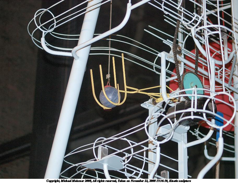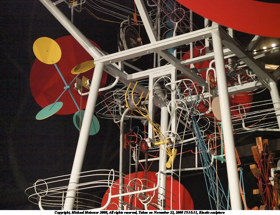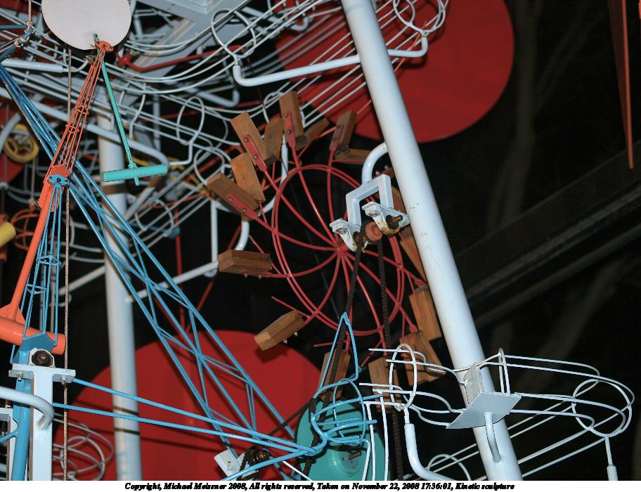 Picture #8: Kinetic sculpture #4 912x700, 151,832 bytes (149K), (html file) Copyright, Michael Meissner 2008, All rights reserved Olympus E-3 camera with Olympus 50mm f/2.0 lens f/2.0, ISO 125, flash, 1/100 sec, 50.0mm, auto mode, natural color, auto gradation, matrix metering, IS1 (All Direction Shake IS) 35mm equivalent focal length 100.0mm Extra equipment used: flash Programs used: gimp Taken by Michael Meissner on November 22, 2008 17:36:10 Last modified on December 17, 2008 at 10:11 |