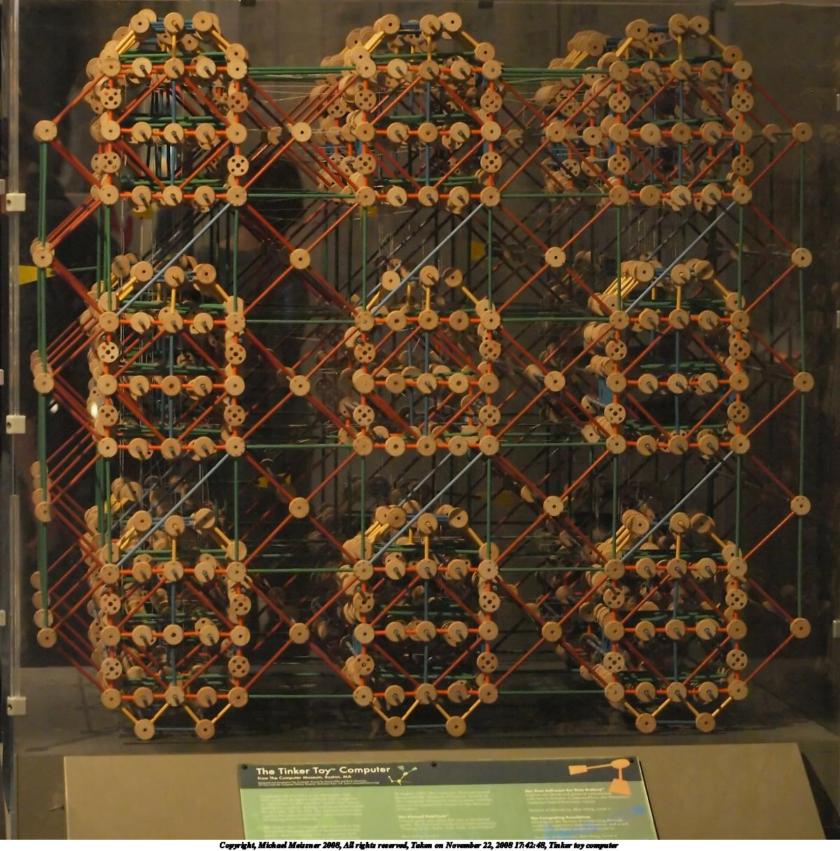 Picture #6: Tinker toy computer 1200x1216, 256,327 bytes (251K), (html file) Copyright, Michael Meissner 2008, All rights reserved Olympus E-3 camera with Olympus 50mm f/2.0 lens f/2.2, ISO 2000, 1/60 sec, 50.0mm, auto mode, natural color, auto gradation, matrix metering, IS1 (All Direction Shake IS) 35mm equivalent focal length 100.0mm Programs used: NoiseNinja, gimp, rotate Taken by Michael Meissner on November 22, 2008 17:42:48 Last modified on December 17, 2008 at 10:19 |