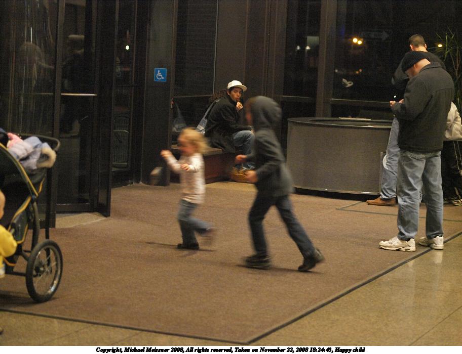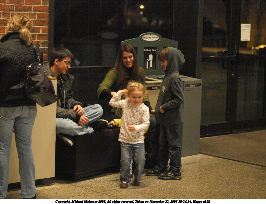 Picture #3: Happy child #3 912x700, 120,912 bytes (119K), (html file) Copyright, Michael Meissner 2008, All rights reserved Olympus E-3 camera with Olympus 50mm f/2.0 lens f/2.0, ISO 2000, 1/80 sec, 50.0mm, auto mode, natural color, auto gradation, matrix metering, IS1 (All Direction Shake IS) 35mm equivalent focal length 100.0mm Taken by Michael Meissner on November 22, 2008 18:25:14 Last modified on December 17, 2008 at 10:44 |