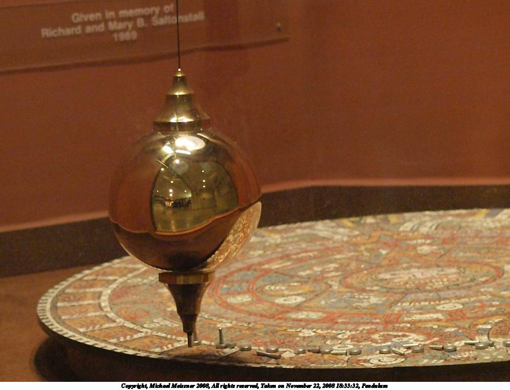 Picture #2: Pendulum 1000x766, 108,983 bytes (107K), (html file) Copyright, Michael Meissner 2008, All rights reserved Olympus E-3 camera with Olympus 50mm f/2.0 lens f/2.0, ISO 1600, 1/100 sec, 50.0mm, auto mode, natural color, auto gradation, matrix metering, IS1 (All Direction Shake IS) 35mm equivalent focal length 100.0mm Programs used: gimp Taken by Michael Meissner on November 22, 2008 18:33:32 Last modified on December 17, 2008 at 10:50 |