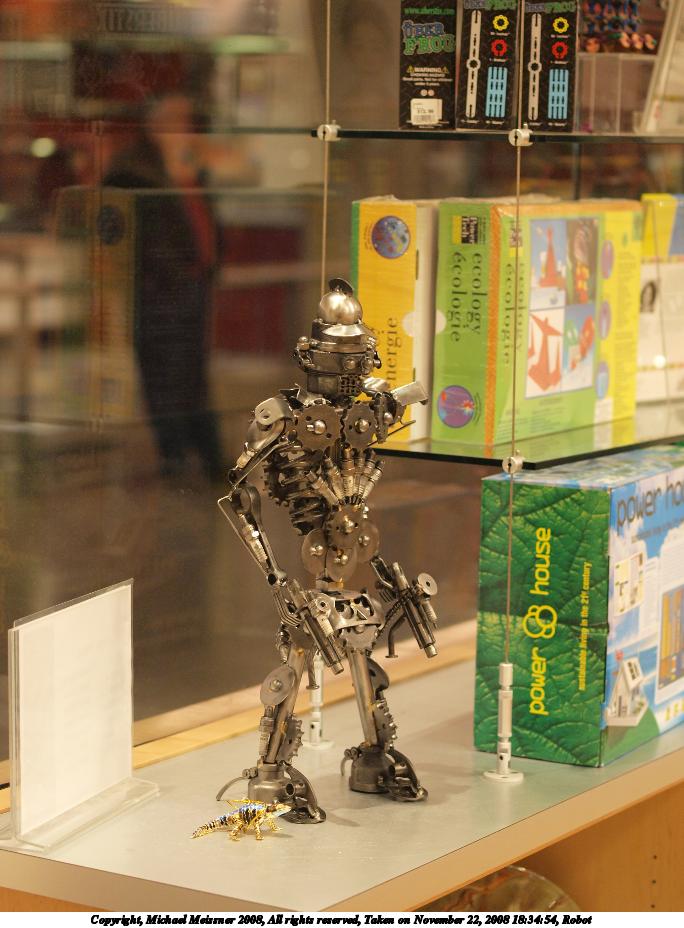 Picture #1: Robot 684x928, 116,269 bytes (114K), (html file) Copyright, Michael Meissner 2008, All rights reserved Olympus E-3 camera with Olympus 50mm f/2.0 lens f/2.0, ISO 800, 1/100 sec, 50.0mm, auto mode, natural color, auto gradation, matrix metering, IS1 (All Direction Shake IS) 35mm equivalent focal length 100.0mm Programs used: rotate Taken by Michael Meissner on November 22, 2008 18:34:54 Last modified on December 17, 2008 at 10:50 |