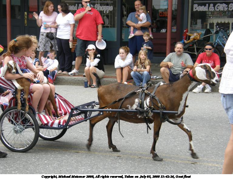Picture #32: Goat float 768x592, 106,394 bytes (104K), (html file) Copyright, Michael Meissner 2008, All rights reserved Olympus SP-550UZ camera f/3.9, ISO 50, 1/100 sec, 15.3mm, auto mode, HQ, matrix metering 35mm equivalent focal length 92.0mm Taken by Michael Meissner on July 05, 2008 13:42:26 Last modified on July 09, 2008 at 12:31 |