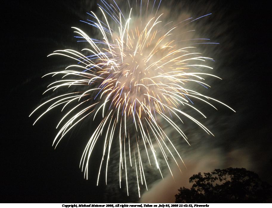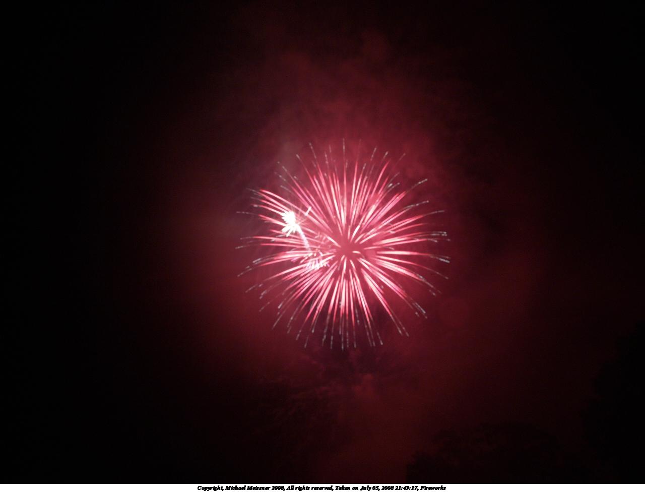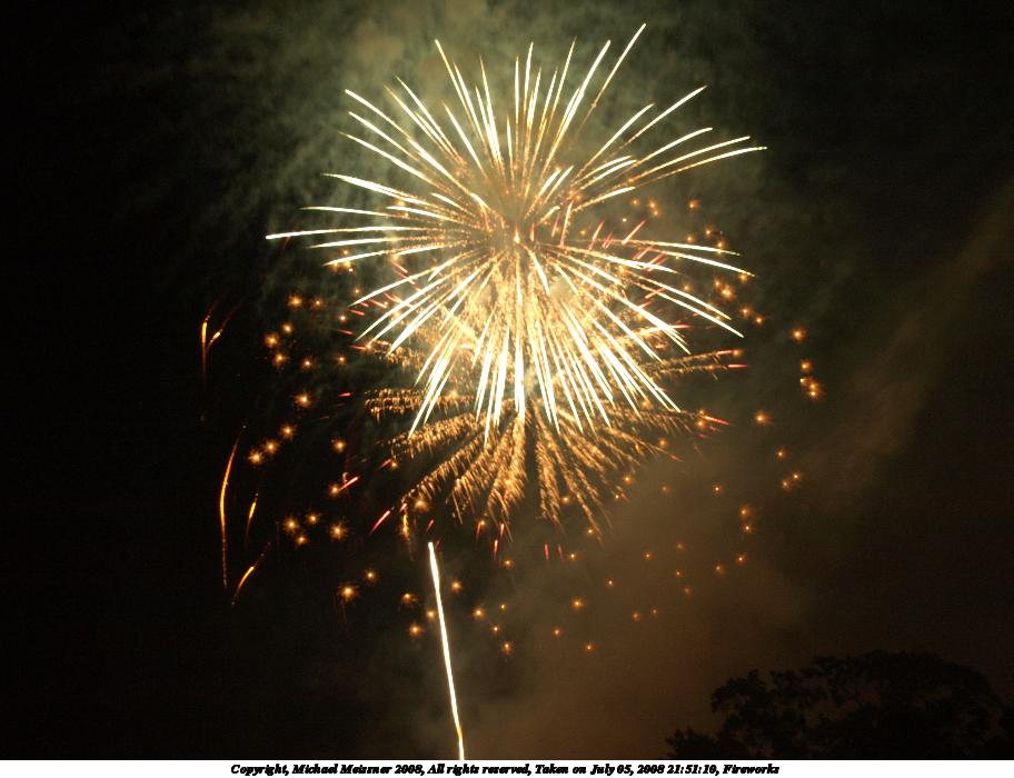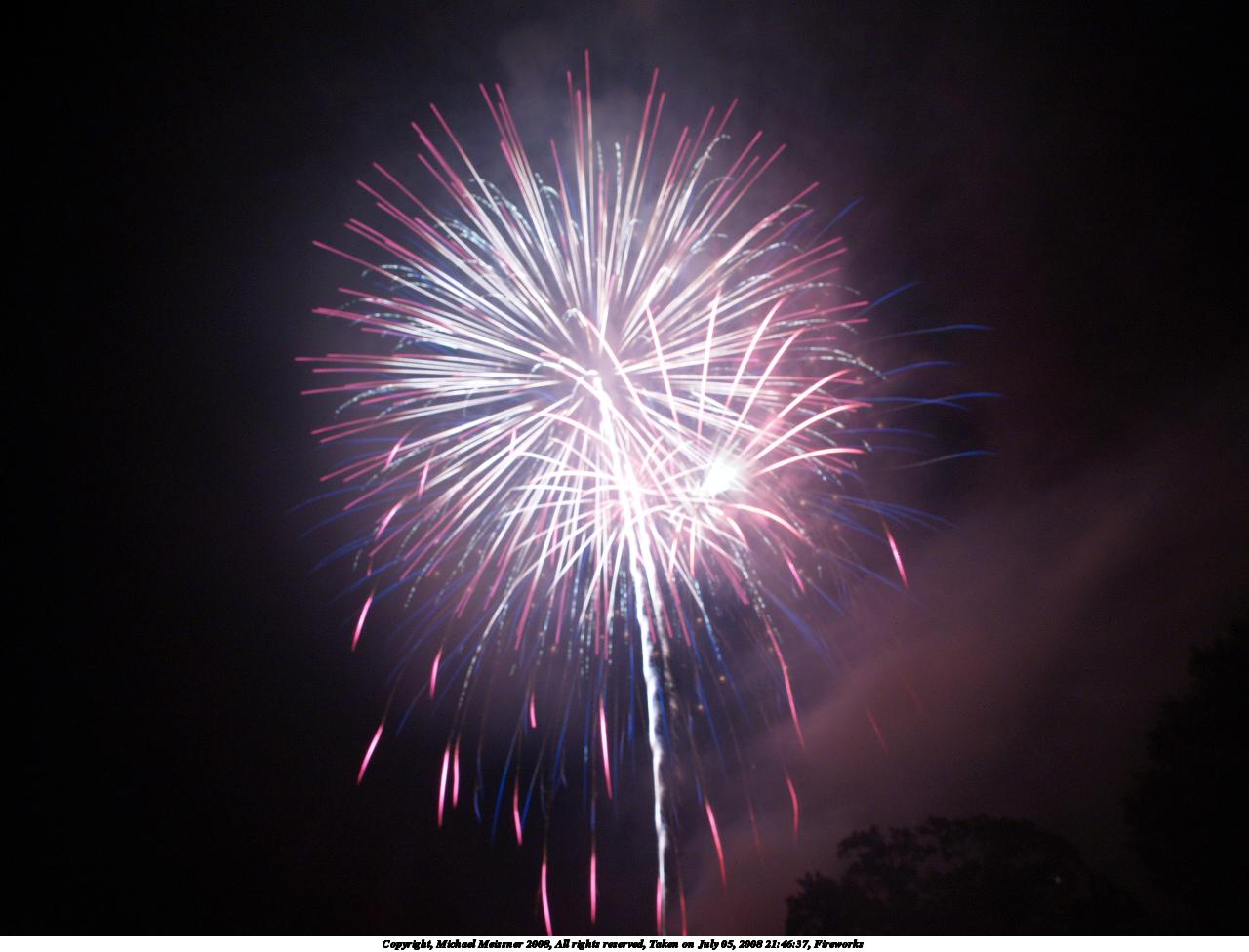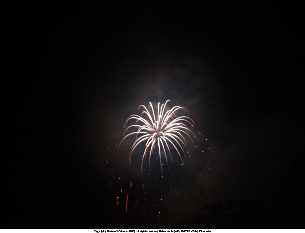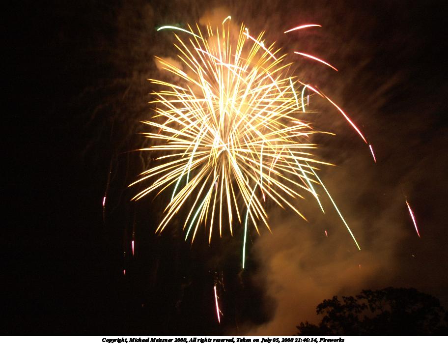Picture #3: Fireworks #3 1280x976, 133,222 bytes (131K), (html file) Copyright, Michael Meissner 2008, All rights reserved Olympus E-1 camera with Olympus 14-54mm f/2.8-3.5 lens f/8.0, ISO 400, 6.6 sec, 14.0mm, manual mode, SHQ, matrix metering, +2 sharpening, manual focus, noise reduction 35mm equivalent focal length 28.0mm Extra equipment used: tripod, wired shutter release Taken by Michael Meissner on July 05, 2008 21:42:25 Last modified on July 09, 2008 at 12:47 This picture is one of my favorites. |