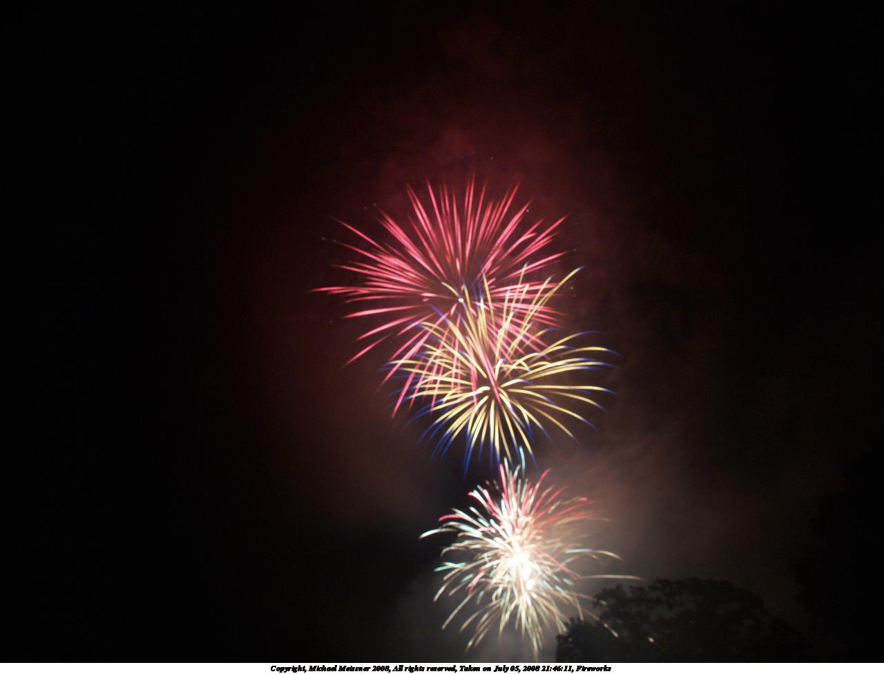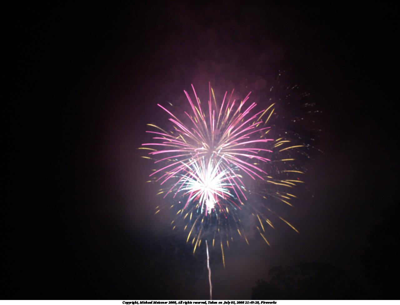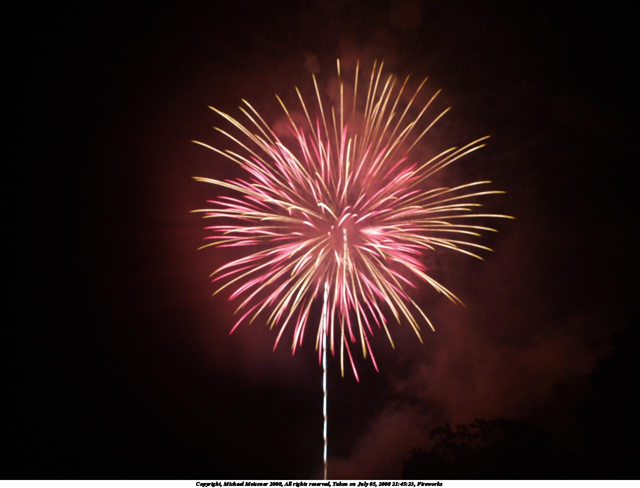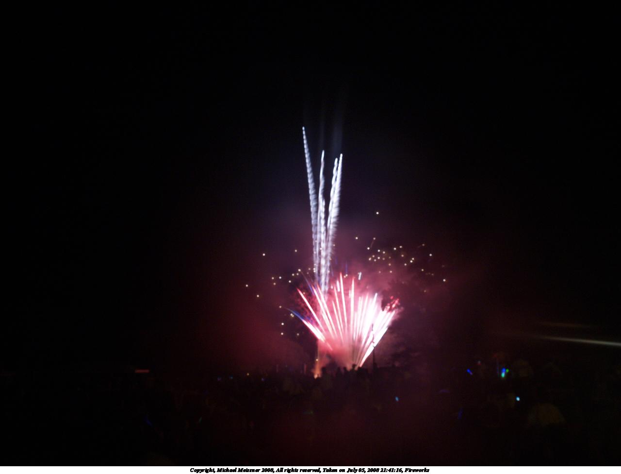 Picture #3: Fireworks #3 1280x976, 133,222 bytes (131K), (html file) Copyright, Michael Meissner 2008, All rights reserved Olympus E-1 camera with Olympus 14-54mm f/2.8-3.5 lens f/8.0, ISO 400, 6.6 sec, 14.0mm, manual mode, SHQ, matrix metering, +2 sharpening, manual focus, noise reduction 35mm equivalent focal length 28.0mm Extra equipment used: tripod, wired shutter release Taken by Michael Meissner on July 05, 2008 21:42:25 Last modified on July 09, 2008 at 12:47 This picture is one of my favorites. |
