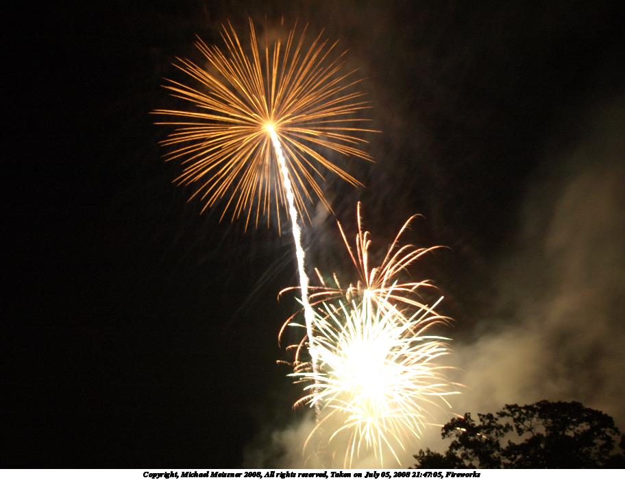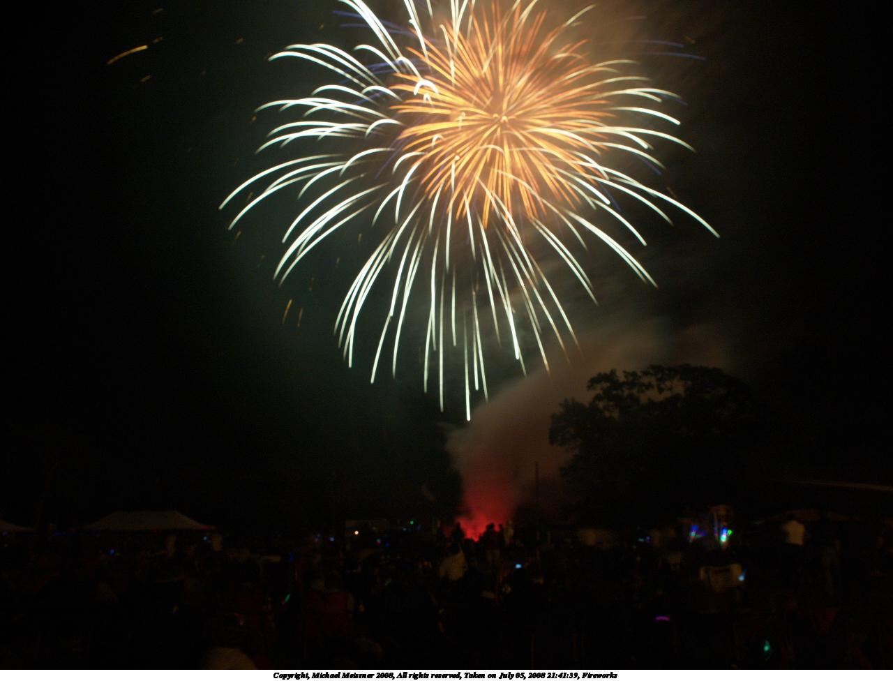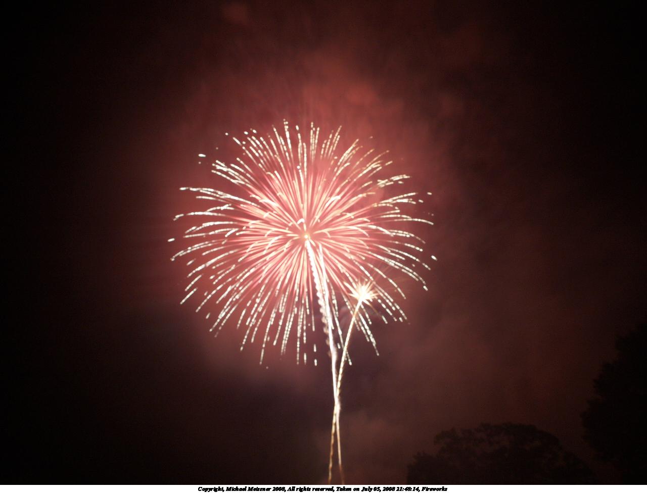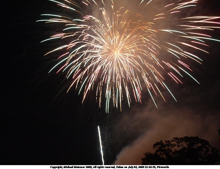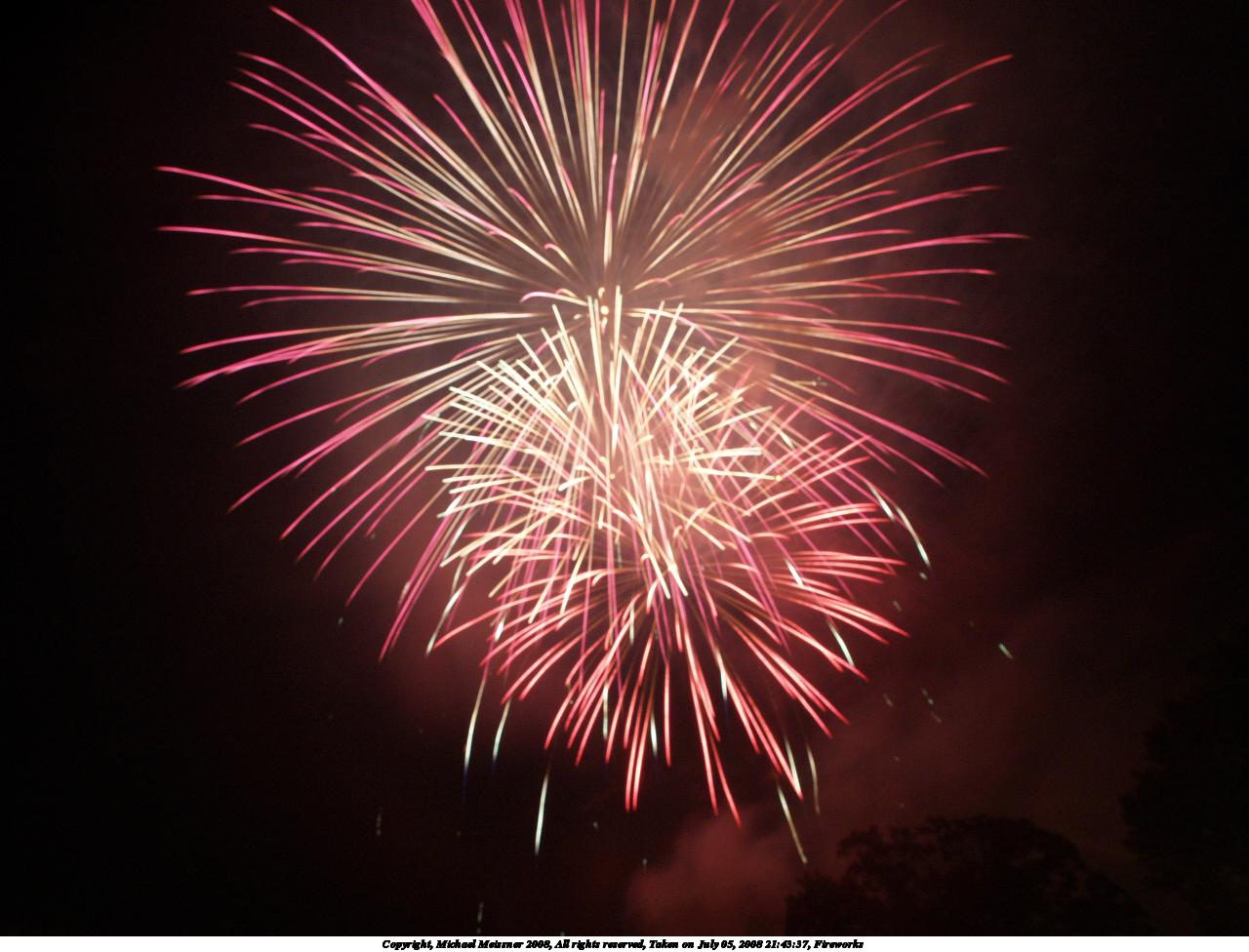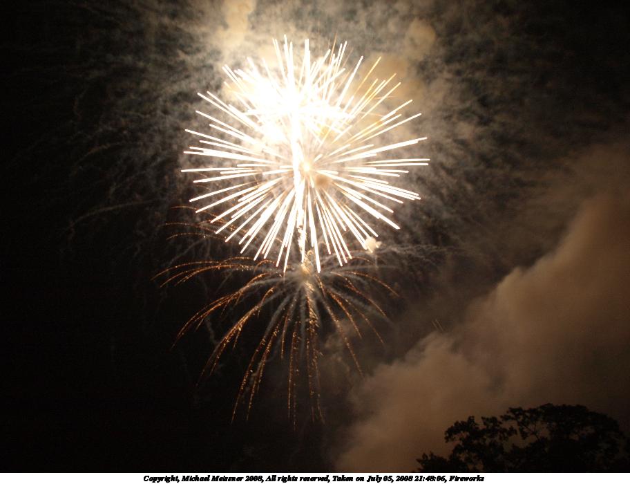 Picture #3: Fireworks #3 1280x976, 133,222 bytes (131K), (html file) Copyright, Michael Meissner 2008, All rights reserved Olympus E-1 camera with Olympus 14-54mm f/2.8-3.5 lens f/8.0, ISO 400, 6.6 sec, 14.0mm, manual mode, SHQ, matrix metering, +2 sharpening, manual focus, noise reduction 35mm equivalent focal length 28.0mm Extra equipment used: tripod, wired shutter release Taken by Michael Meissner on July 05, 2008 21:42:25 Last modified on July 09, 2008 at 12:47 This picture is one of my favorites. |
