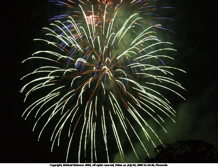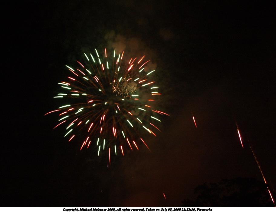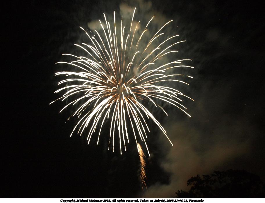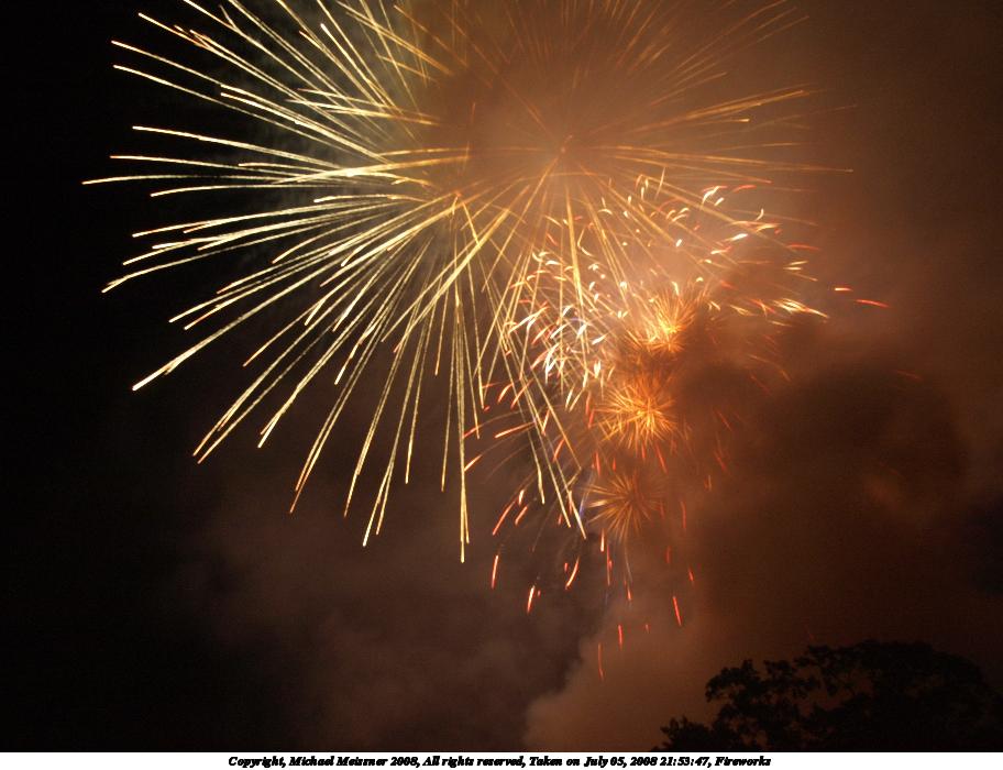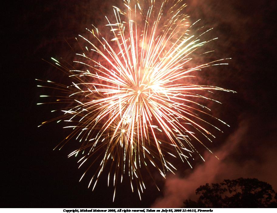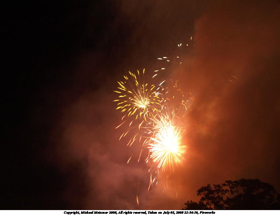 Picture #30: Fireworks #30 912x700, 92,179 bytes (91K), (html file) Copyright, Michael Meissner 2008, All rights reserved Olympus E-510 camera with Olympus 11-22mm f/2.8-3.5 lens f/8.0, ISO 400, 0.9 sec, 22.0mm, manual mode, natural color, SHQ, matrix metering, -1 sharpening, manual focus, IS1 (All Direction Shake IS), noise reduction, noise filter low 35mm equivalent focal length 44.0mm Extra equipment used: tripod, wired shutter release Taken by Michael Meissner on July 05, 2008 21:50:38 Last modified on July 09, 2008 at 12:53 This picture is one of my favorites. |