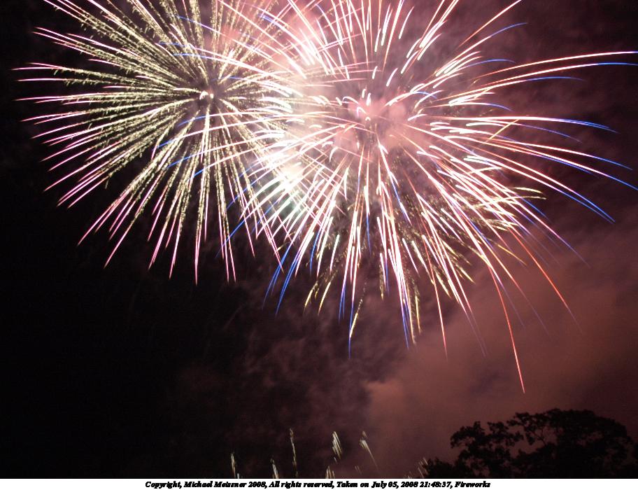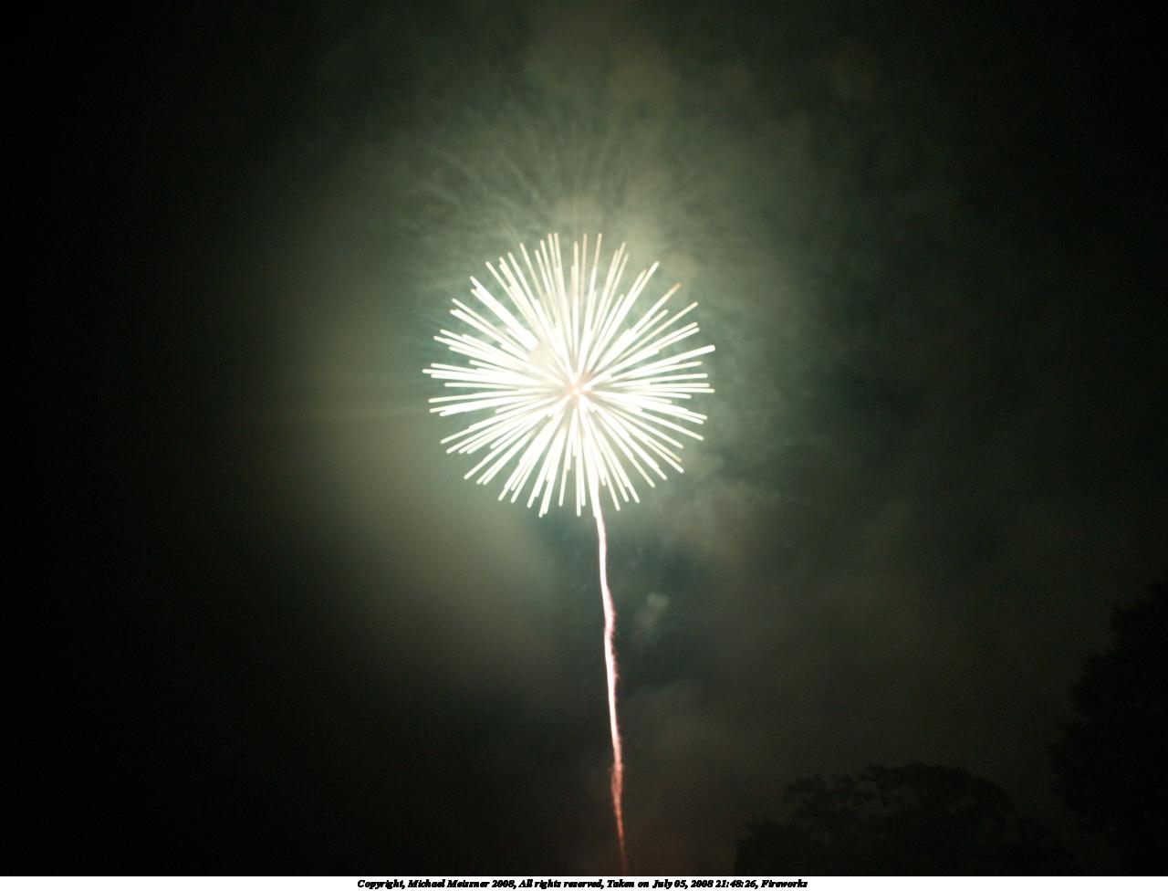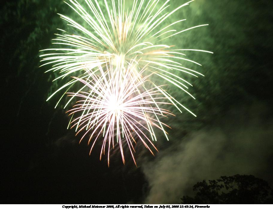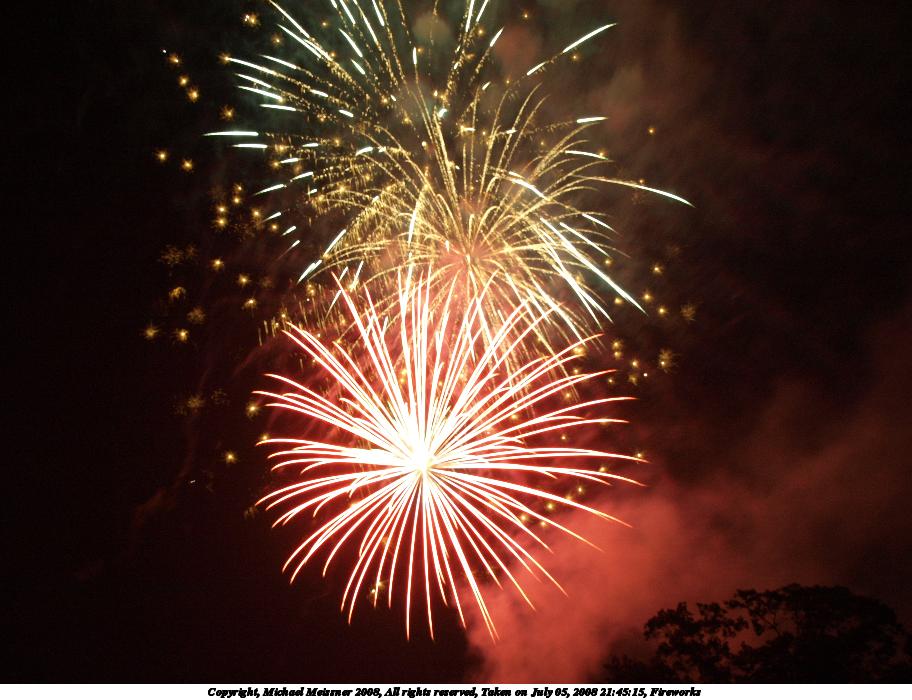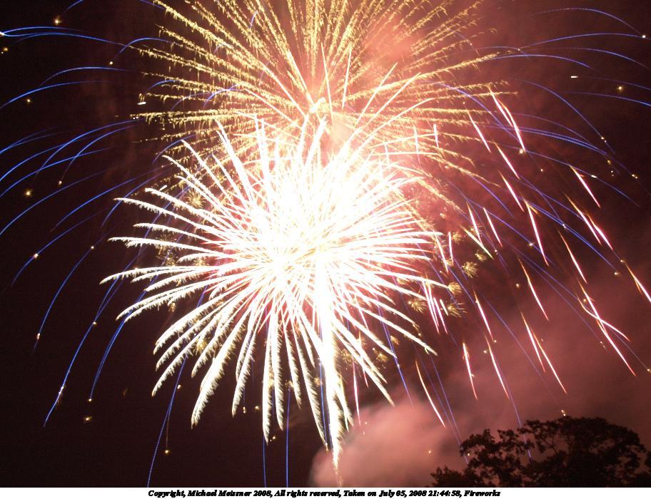 Picture #30: Fireworks #30 912x700, 92,179 bytes (91K), (html file) Copyright, Michael Meissner 2008, All rights reserved Olympus E-510 camera with Olympus 11-22mm f/2.8-3.5 lens f/8.0, ISO 400, 0.9 sec, 22.0mm, manual mode, natural color, SHQ, matrix metering, -1 sharpening, manual focus, IS1 (All Direction Shake IS), noise reduction, noise filter low 35mm equivalent focal length 44.0mm Extra equipment used: tripod, wired shutter release Taken by Michael Meissner on July 05, 2008 21:50:38 Last modified on July 09, 2008 at 12:53 This picture is one of my favorites. |