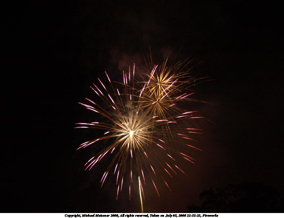 Picture #10: Fireworks #10 1280x976, 95,959 bytes (94K), (html file) Copyright, Michael Meissner 2008, All rights reserved Olympus E-1 camera with Olympus 14-54mm f/2.8-3.5 lens f/8.0, ISO 400, 1.9 sec, 14.0mm, manual mode, SHQ, matrix metering, +2 sharpening, manual focus, noise reduction 35mm equivalent focal length 28.0mm Extra equipment used: tripod, wired shutter release Taken by Michael Meissner on July 05, 2008 21:45:23 Last modified on July 09, 2008 at 12:49 This picture is one of my favorites. |