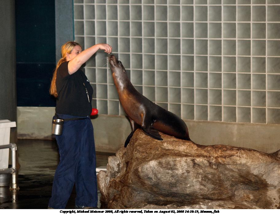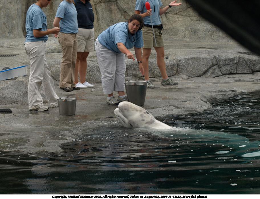 Picture #11: More fish please! 912x700, 121,552 bytes (119K), (html file) Copyright, Michael Meissner 2008, All rights reserved Olympus E-510 camera with Olympus 50-200mm f/2.8-3.5 lens and Olympus EC-14 (1.4x) f/8.0, ISO 400, 1/160 sec, 95.0mm, aperture priority, natural color, SHQ, matrix metering, -1 sharpening, auto + manual focus, IS1 (All Direction Shake IS), noise filter low 35mm equivalent focal length 190.0mm, EC-14 Taken by Michael Meissner on August 02, 2008 13:18:52 Last modified on September 21, 2008 at 17:02 |