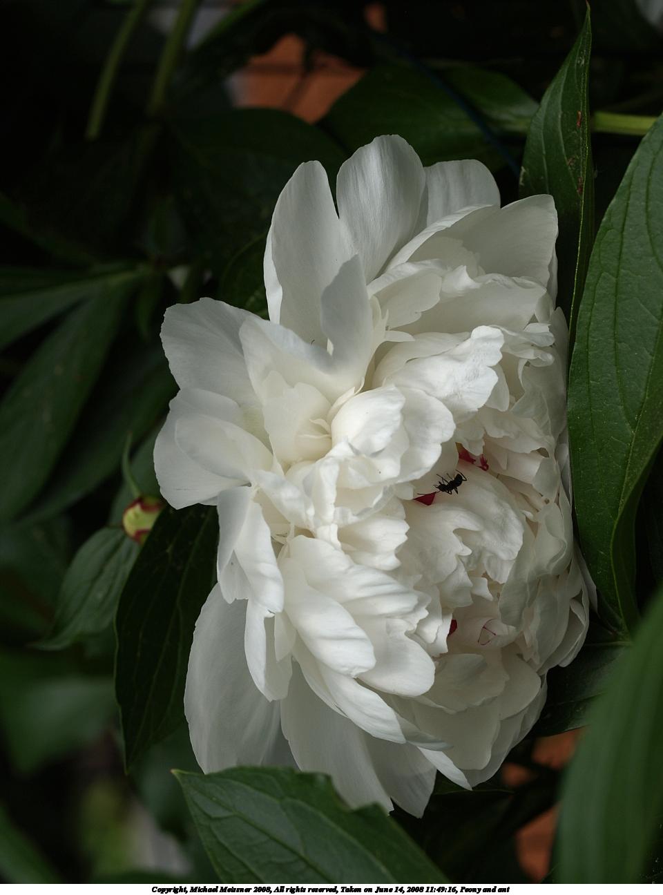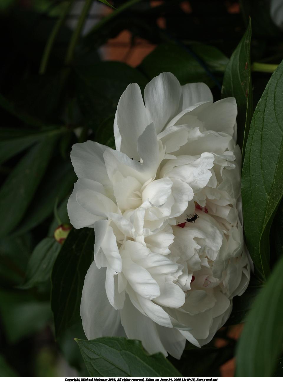 Picture #17: Peony and ant #2 960x1296, 99,466 bytes (98K), (html file) Copyright, Michael Meissner 2008, All rights reserved Olympus E-1 camera with Olympus 50mm f/2.0 lens f/5.6, ISO 100, 1/800 sec, 50.0mm, auto mode, SHQ, matrix metering, +2 sharpening 35mm equivalent focal length 100.0mm Programs used: gimp Taken by Michael Meissner on June 14, 2008 11:49:16 Last modified on July 11, 2008 at 10:09 |