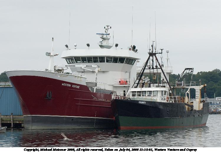 Picture #6: Western Venture and Osprey 750x516, 83,648 bytes (82K), (html file) Copyright, Michael Meissner 2008, All rights reserved Olympus E-510 camera with Olympus 50-200mm f/2.8-3.5 lens and Olympus EC-14 (1.4x) f/7.1, ISO 200, 1/500 sec, 79.0mm, auto mode, natural color, SHQ, matrix metering, -1 sharpening, IS1 (All Direction Shake IS), noise filter low 35mm equivalent focal length 158.0mm, EC-14 Programs used: gimp Taken by Michael Meissner on July 04, 2008 13:35:01 Last modified on July 05, 2008 at 10:32 |