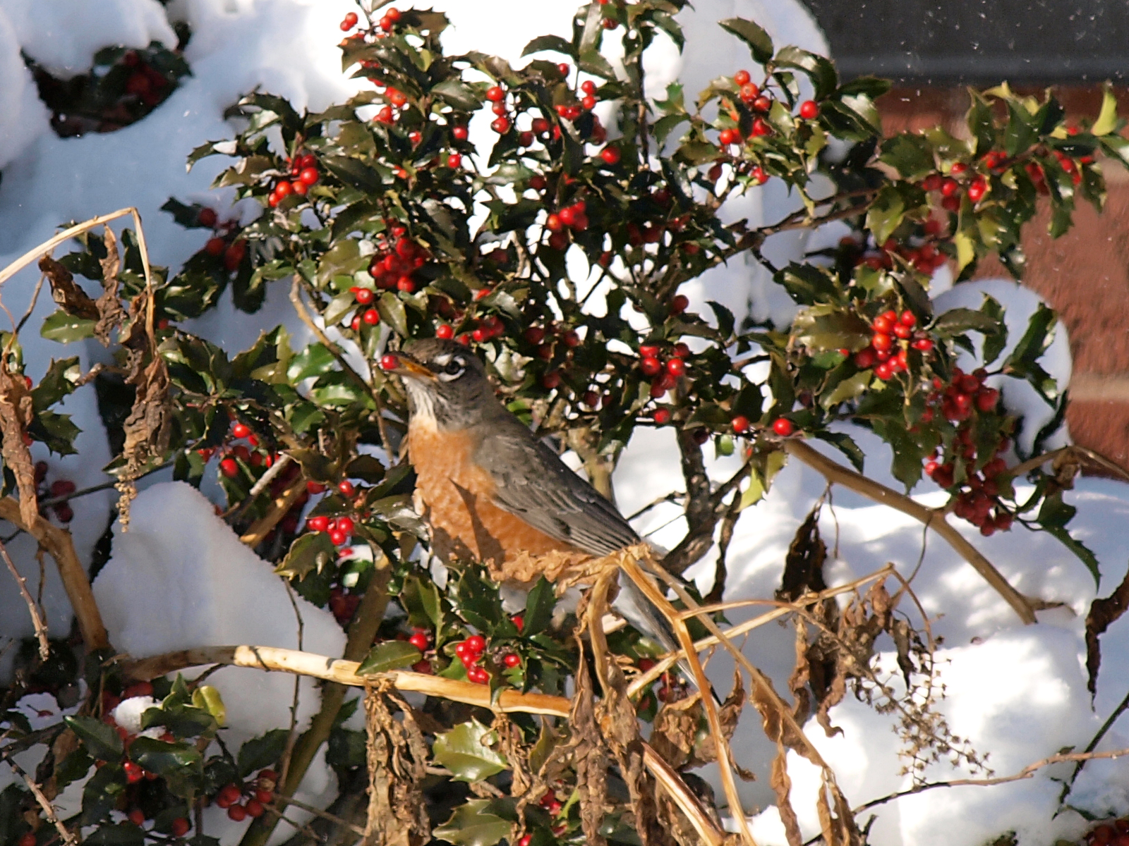 Picture #30: Robin with berry Small: 800x616, 128,479 bytes (126K), (html file) Large: 1600x1200, 1,961,321 bytes (1.9M), (html file) Copyright, Michael Meissner 2009, All rights reserved Olympus E-3 camera with Olympus 50-200mm f/2.8-3.5 lens f/4.5, ISO 100, 1/500 sec, 200.0mm, auto mode, natural color, auto gradation, matrix metering, IS1 (All Direction Shake IS) 35mm equivalent focal length 401.0mm Programs used: gimp Taken by Michael Meissner on January 01, 2009 13:45:19 Last modified on January 01, 2009 at 23:45 |