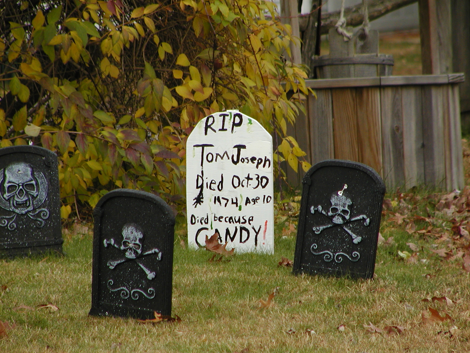 Picture #33: Halloween gravestones Small: 800x623, 126,897 bytes (124K), (html file) Large: 1600x1200, 1,322,444 bytes (1.3M), (html file) Copyright, Michael Meissner 2009, All rights reserved Olympus C-2100UZ camera f/2.8, ISO 100, 1/200 sec, 23.2mm, auto mode, SHQ, cloudy, matrix metering 35mm equivalent focal length 129.0mm Taken by Michael Meissner on November 05, 2009 09:30:25 Last modified on November 08, 2009 at 19:18 |