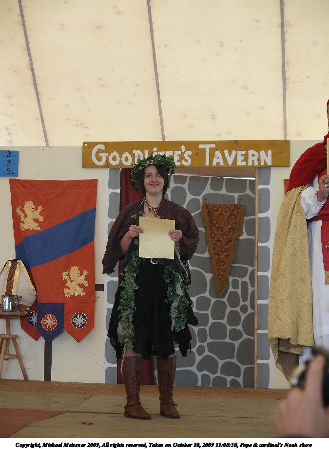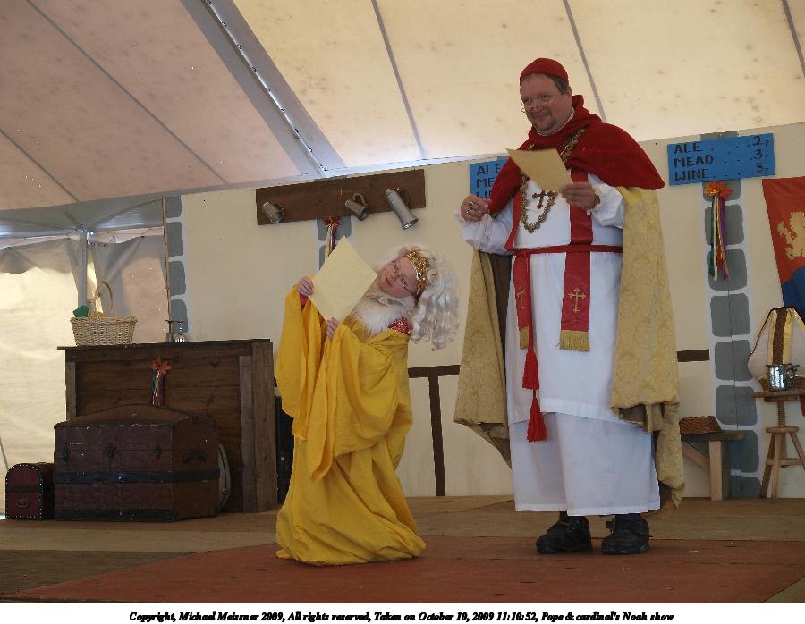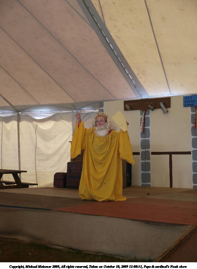 Picture #3: Pope & cardinal's Noah show #2 Small: 675x923, 92,848 bytes (91K), (html file) Large: 2700x3600, 7,915,351 bytes (7.5M), (html file) Copyright, Michael Meissner 2009, All rights reserved Olympus E-3 camera with Olympus 14-54mm f/2.8-3.5 lens f/3.3, ISO 640, 1/80 sec, 42.0mm, auto mode, natural color, SHQ, center weight metering, IS1 (All Direction Shake IS), noise filter low 35mm equivalent focal length 84.0mm Programs used: default crop, gimp Taken by Michael Meissner on October 10, 2009 11:08:38 Last modified on February 06, 2011 at 14:01 |