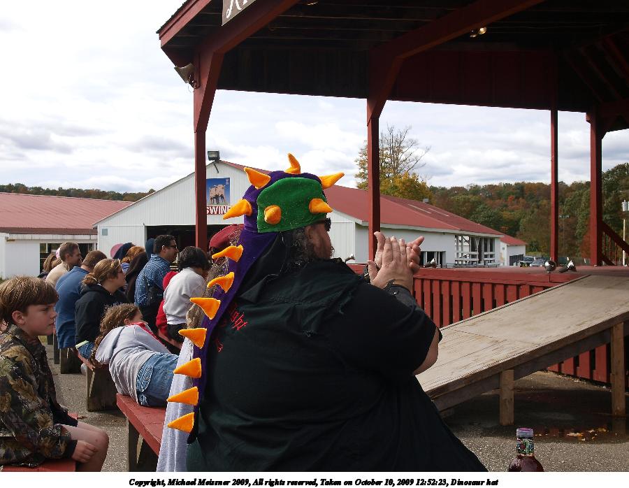 Picture #4: Dinosaur hat Small: 900x698, 111,700 bytes (110K), (html file) Large: 3600x2700, 7,640,101 bytes (7.3M), (html file) Copyright, Michael Meissner 2009, All rights reserved Olympus E-3 camera with Olympus 14-54mm f/2.8-3.5 lens f/5.6, ISO 100, 1/250 sec, 22.0mm, auto mode, natural color, SHQ, center weight metering, IS1 (All Direction Shake IS), noise filter low 35mm equivalent focal length 44.0mm Programs used: default crop, gimp Taken by Michael Meissner on October 10, 2009 12:52:23 Last modified on February 06, 2011 at 14:27 |