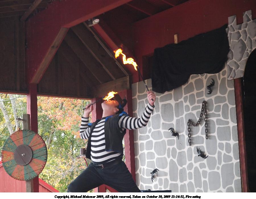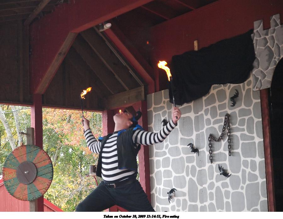 Picture #8: Fire eating Small: 900x698, 108,865 bytes (107K), (html file) Large: 3600x2700, 6,696,601 bytes (6.4M), (html file) Copyright, Michael Meissner 2009, All rights reserved Olympus E-3 camera with Olympus 14-54mm f/2.8-3.5 lens f/3.5, ISO 1250, 1/500 sec, 49.0mm, shutter priority, natural color, SHQ, center weight metering, IS1 (All Direction Shake IS), noise filter low 35mm equivalent focal length 98.0mm Programs used: default crop, gimp, neatimage Taken by Michael Meissner on October 10, 2009 13:14:51 Last modified on February 06, 2011 at 14:37 |