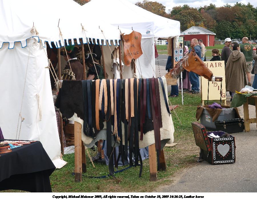 Picture #20: Leather horse Small: 900x698, 154,605 bytes (151K), (html file) Large: 3600x2700, 9,020,230 bytes (8.6M), (html file) Copyright, Michael Meissner 2009, All rights reserved Olympus E-3 camera with Olympus 14-54mm f/2.8-3.5 lens f/5.0, ISO 100, 1/200 sec, 41.0mm, auto mode, natural color, SHQ, center weight metering, IS1 (All Direction Shake IS), noise filter low 35mm equivalent focal length 82.0mm Programs used: default crop, gimp Taken by Michael Meissner on October 10, 2009 14:26:29 Last modified on February 06, 2011 at 18:13 |