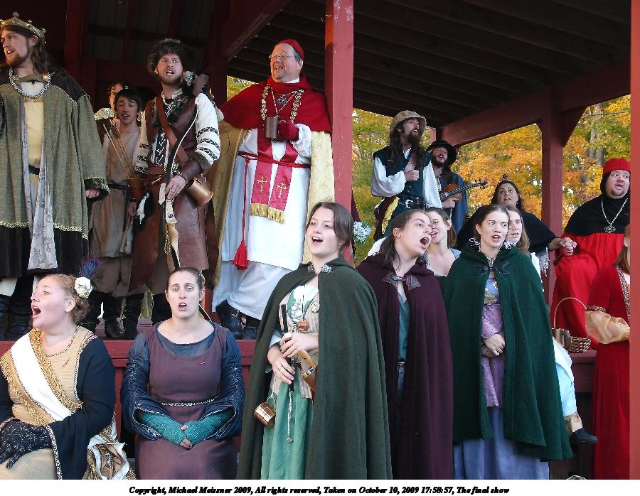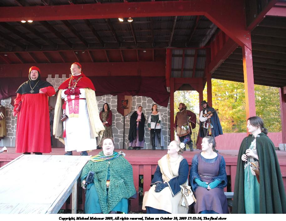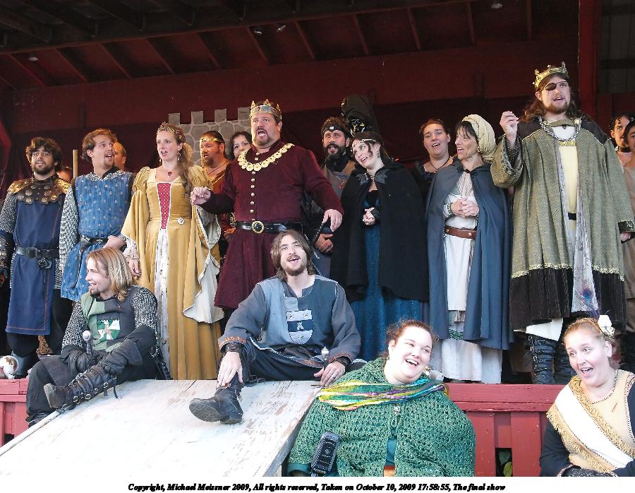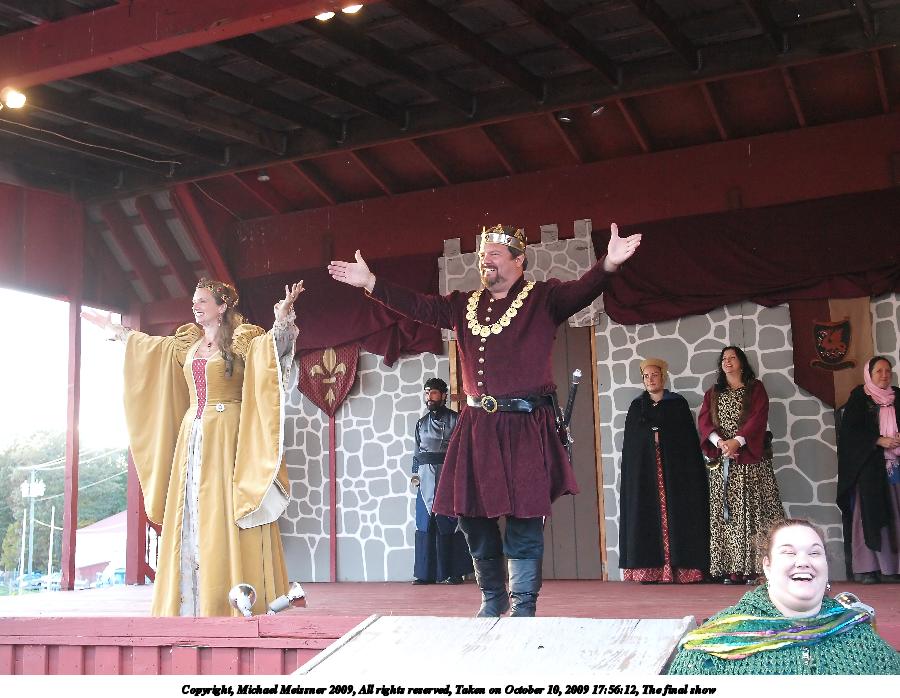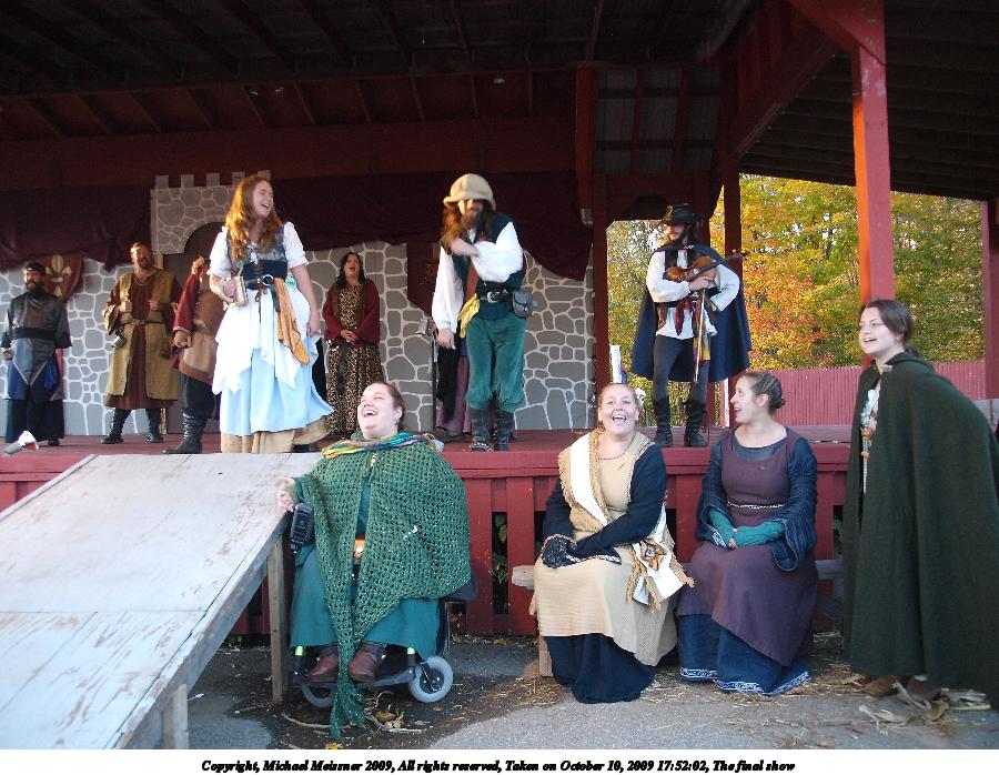 Picture #10: The final show Small: 912x707, 121,997 bytes (120K), (html file) Large: 3648x2736, 5,595,618 bytes (5.3M), (html file) Copyright, Michael Meissner 2009, All rights reserved Olympus E-3 camera with Olympus 14-54mm f/2.8-3.5 lens f/2.8, ISO 800, 1/60 sec, 14.0mm, auto mode, natural color, SHQ, center weight metering, IS1 (All Direction Shake IS), noise filter low 35mm equivalent focal length 28.0mm Programs used: neatimage Taken by Michael Meissner on October 10, 2009 17:51:03 Last modified on February 06, 2011 at 19:24 |