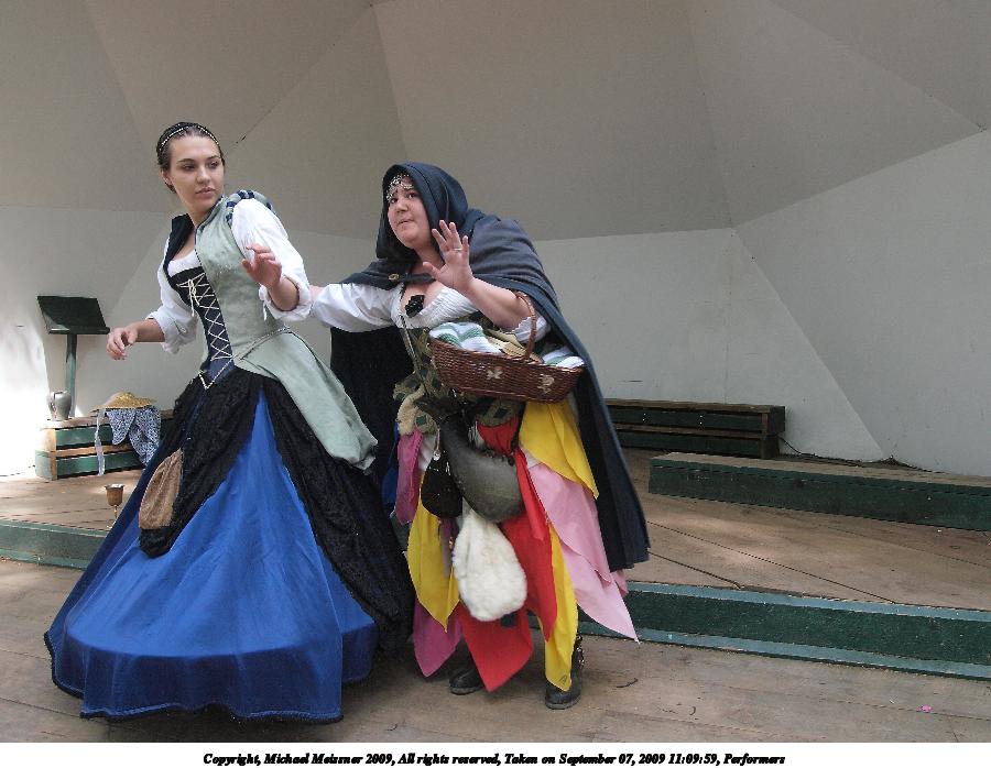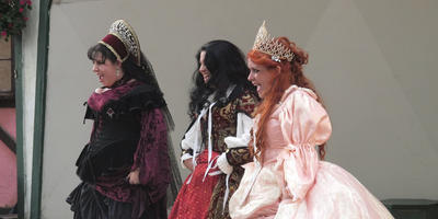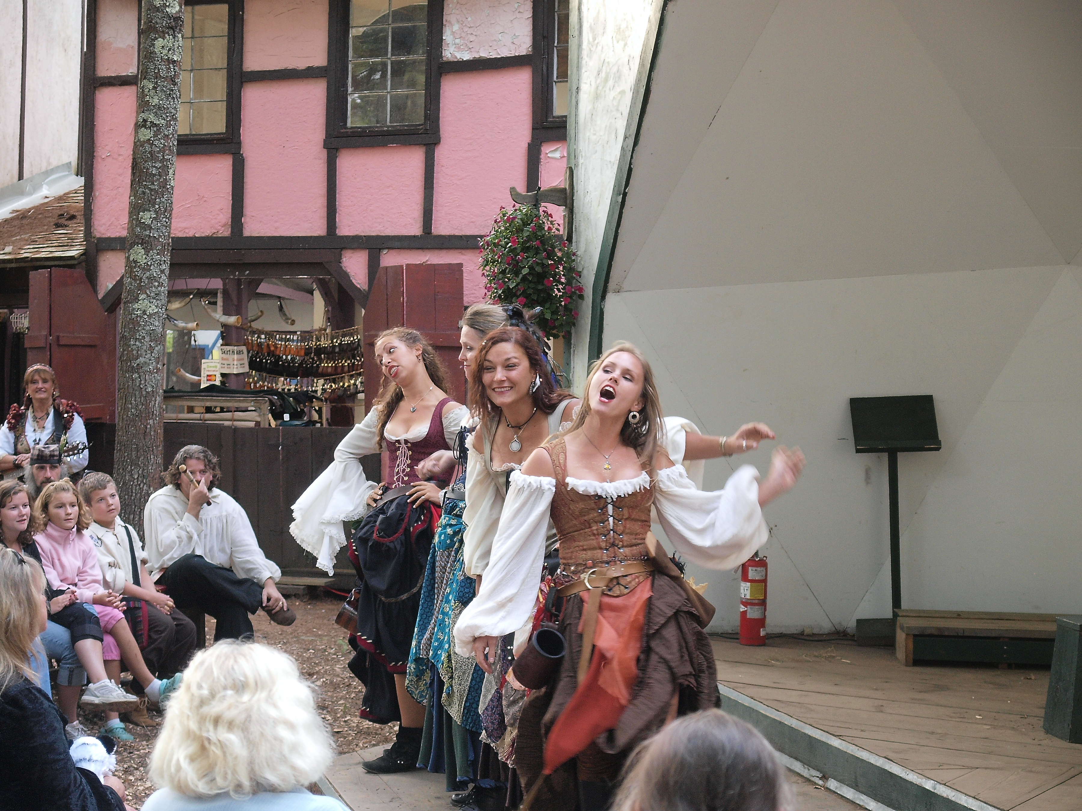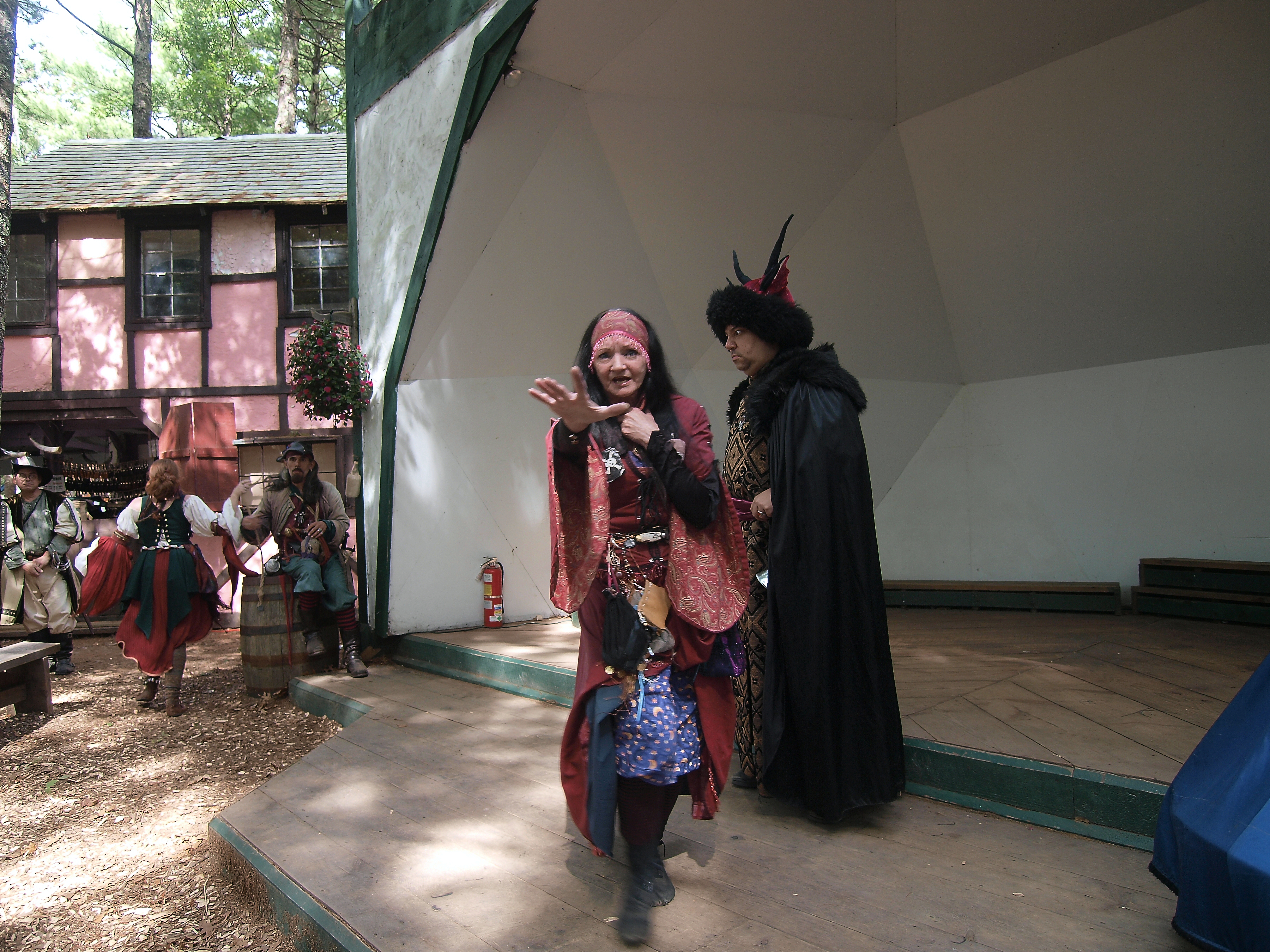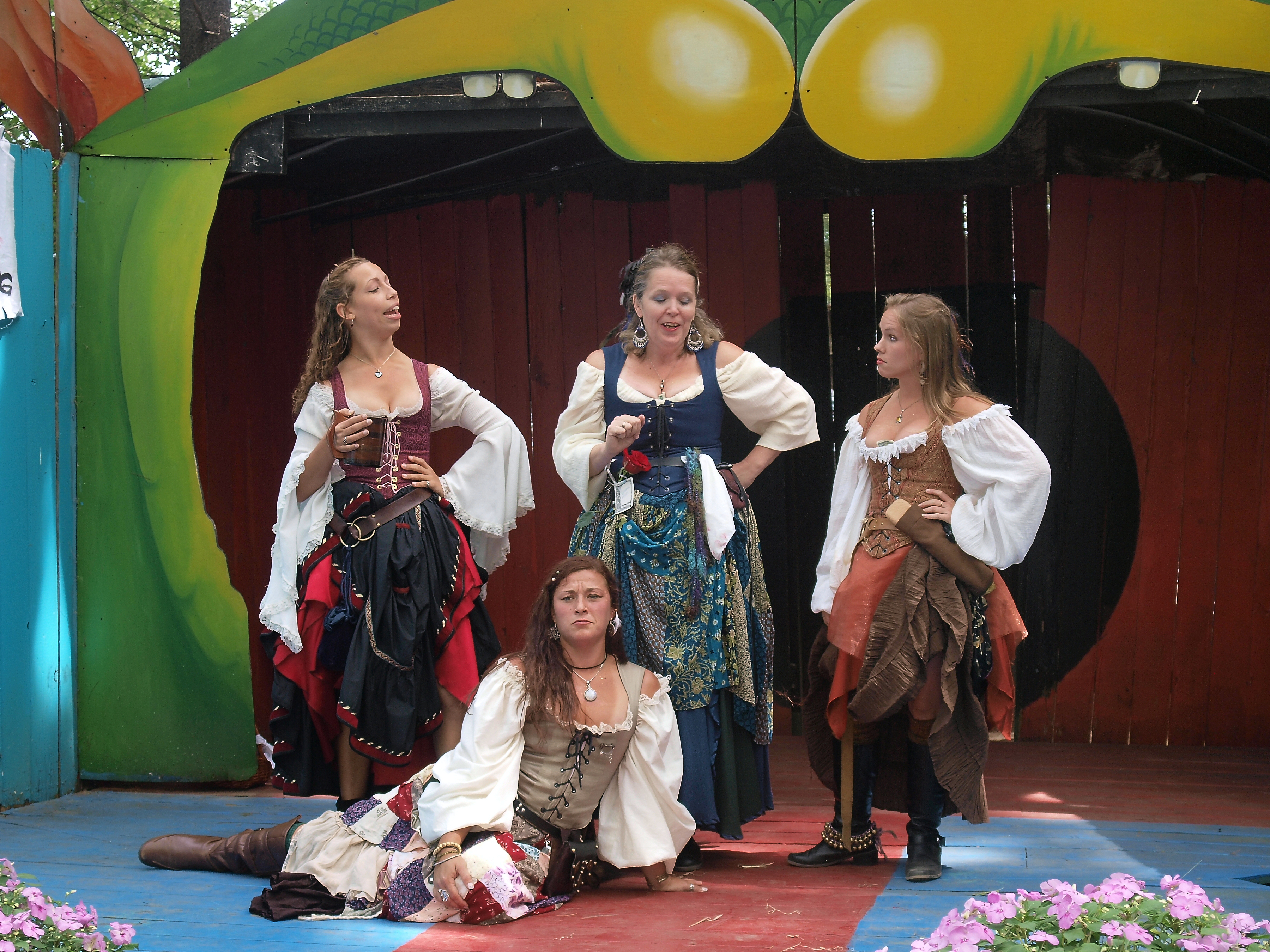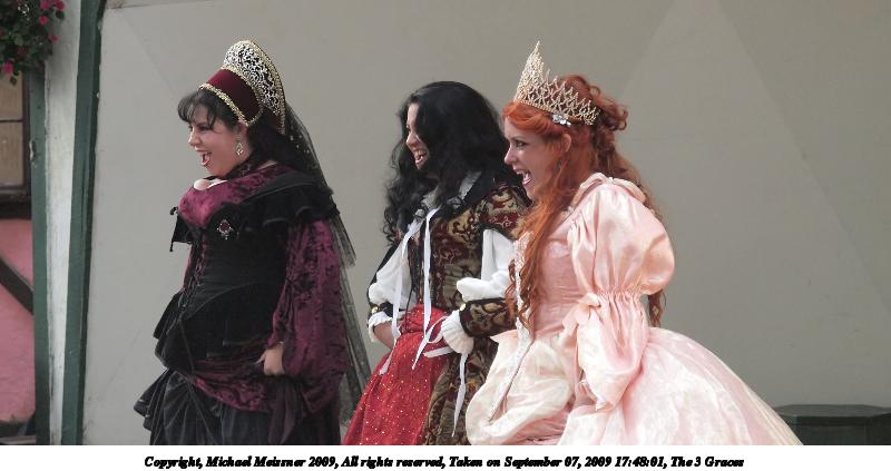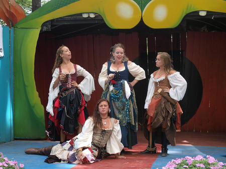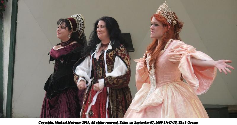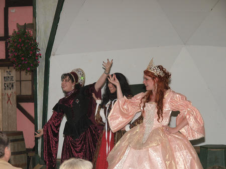Picture #2: The 3 Graces Thumb: 400x200, 29,676 bytes (29K) Small: 800x423, 59,790 bytes (59K), (html file) Large: 3200x1600, 3,150,127 bytes (3.0M), (html file) Copyright, Michael Meissner 2009, All rights reserved Olympus E-3 camera with Olympus 14-54mm f/2.8-3.5 lens f/3.5, ISO 800, 1/100 sec, 52.0mm, auto mode, natural color, auto gradation, SHQ, center weight metering, IS1 (All Direction Shake IS), noise filter low 35mm equivalent focal length 104.0mm Programs used: gimp, neatimage Taken by Michael Meissner on September 07, 2009 17:47:13 Last modified on January 31, 2011 at 22:05 The 3 Graces now perform at other faires. In 2009, the middle actor was no longer with King Richards, but she came as a patron and they were asked to come up to the finale to do a number. |