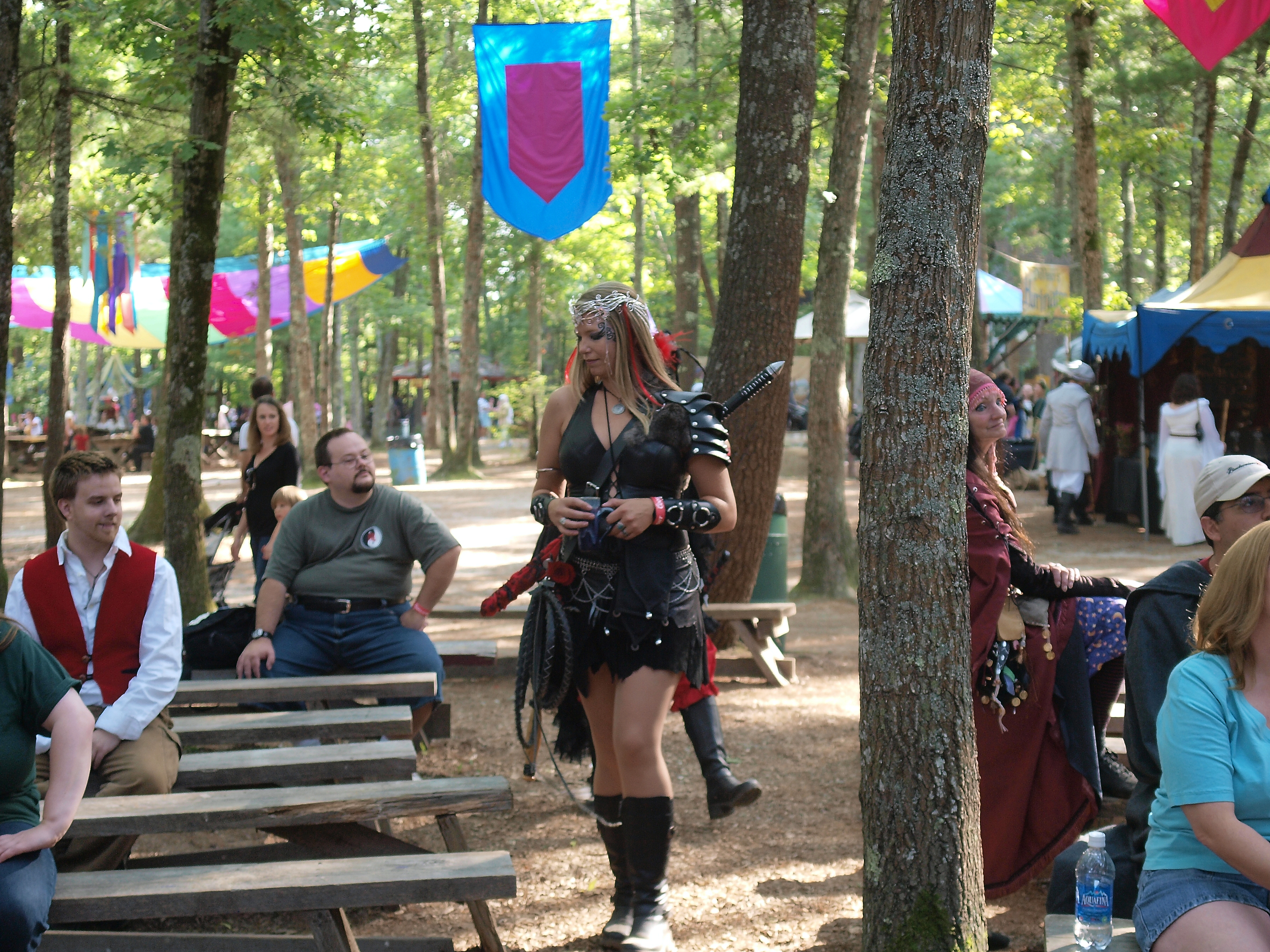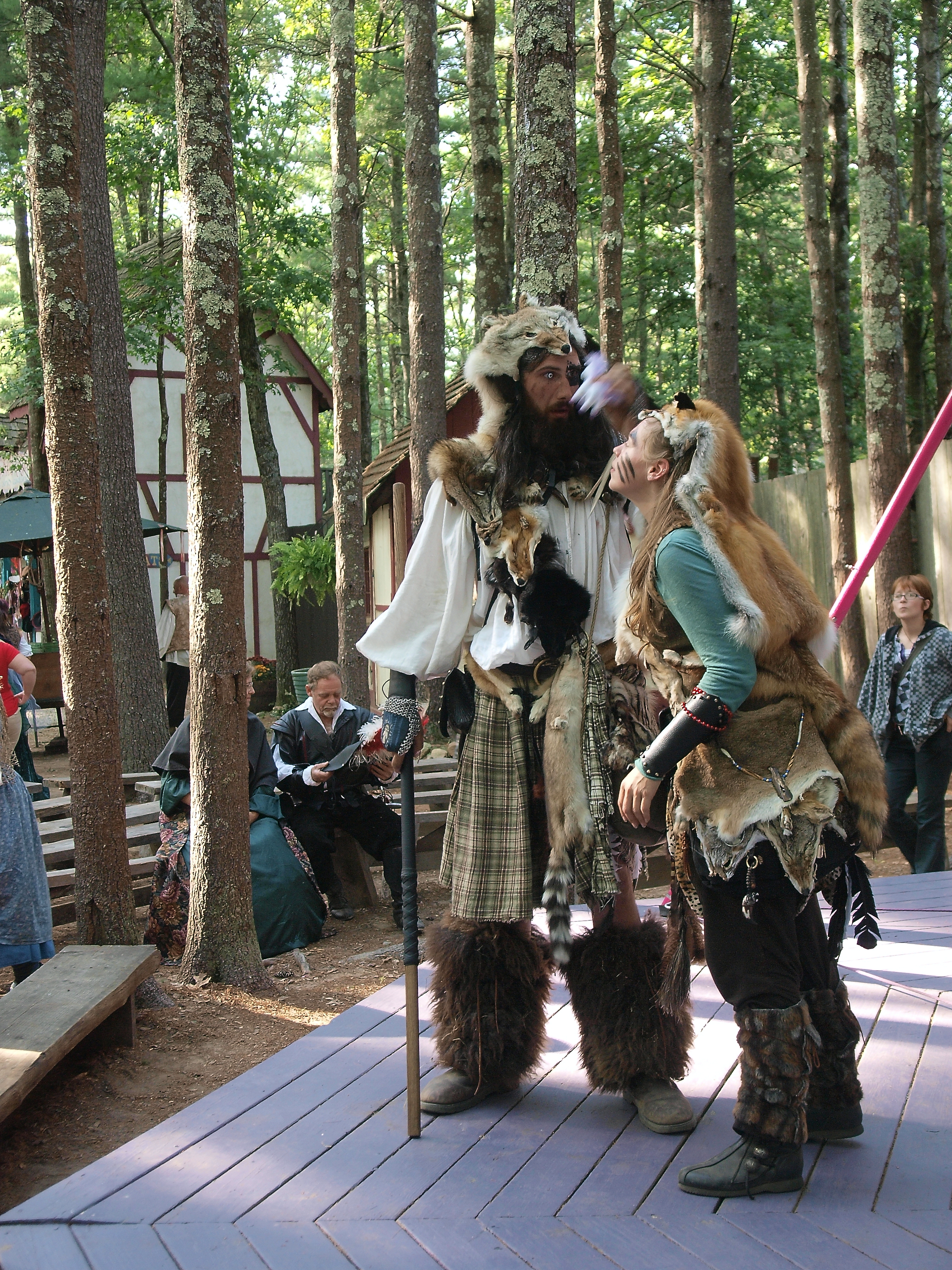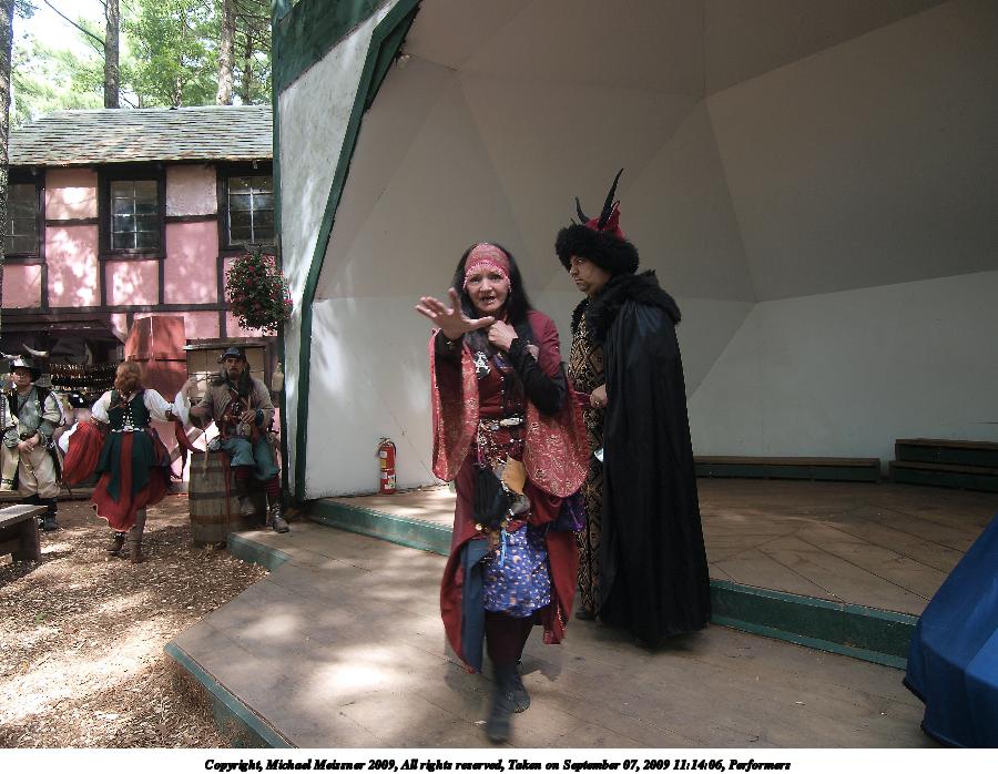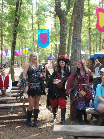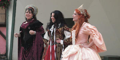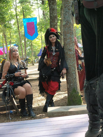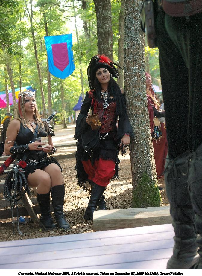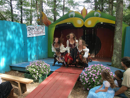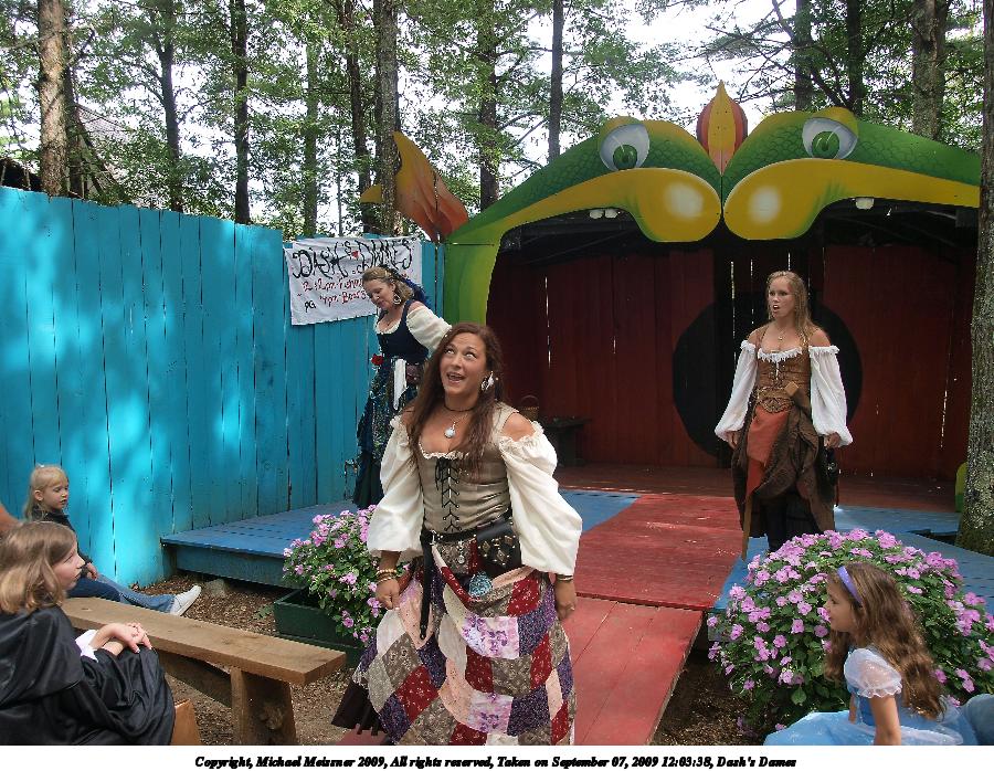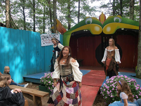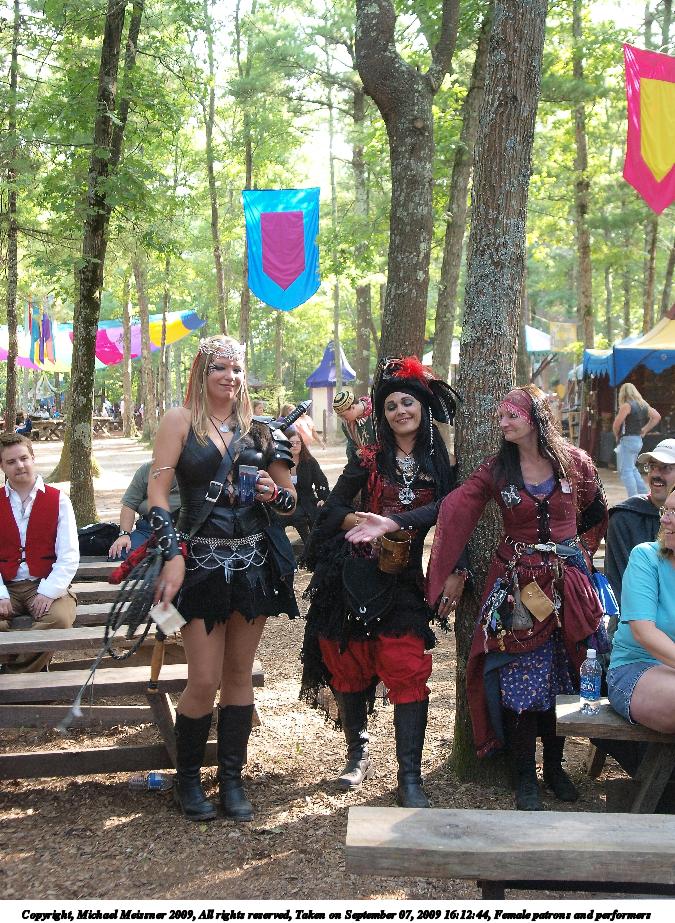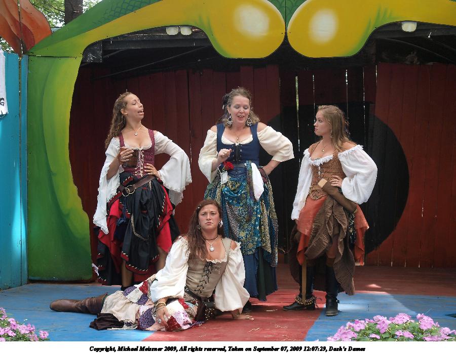 Picture #2: The 3 Graces Thumb: 400x200, 29,676 bytes (29K) Small: 800x423, 59,790 bytes (59K), (html file) Large: 3200x1600, 3,150,127 bytes (3.0M), (html file) Copyright, Michael Meissner 2009, All rights reserved Olympus E-3 camera with Olympus 14-54mm f/2.8-3.5 lens f/3.5, ISO 800, 1/100 sec, 52.0mm, auto mode, natural color, auto gradation, SHQ, center weight metering, IS1 (All Direction Shake IS), noise filter low 35mm equivalent focal length 104.0mm Programs used: gimp, neatimage Taken by Michael Meissner on September 07, 2009 17:47:13 Last modified on January 31, 2011 at 22:05 The 3 Graces now perform at other faires. In 2009, the middle actor was no longer with King Richards, but she came as a patron and they were asked to come up to the finale to do a number. |