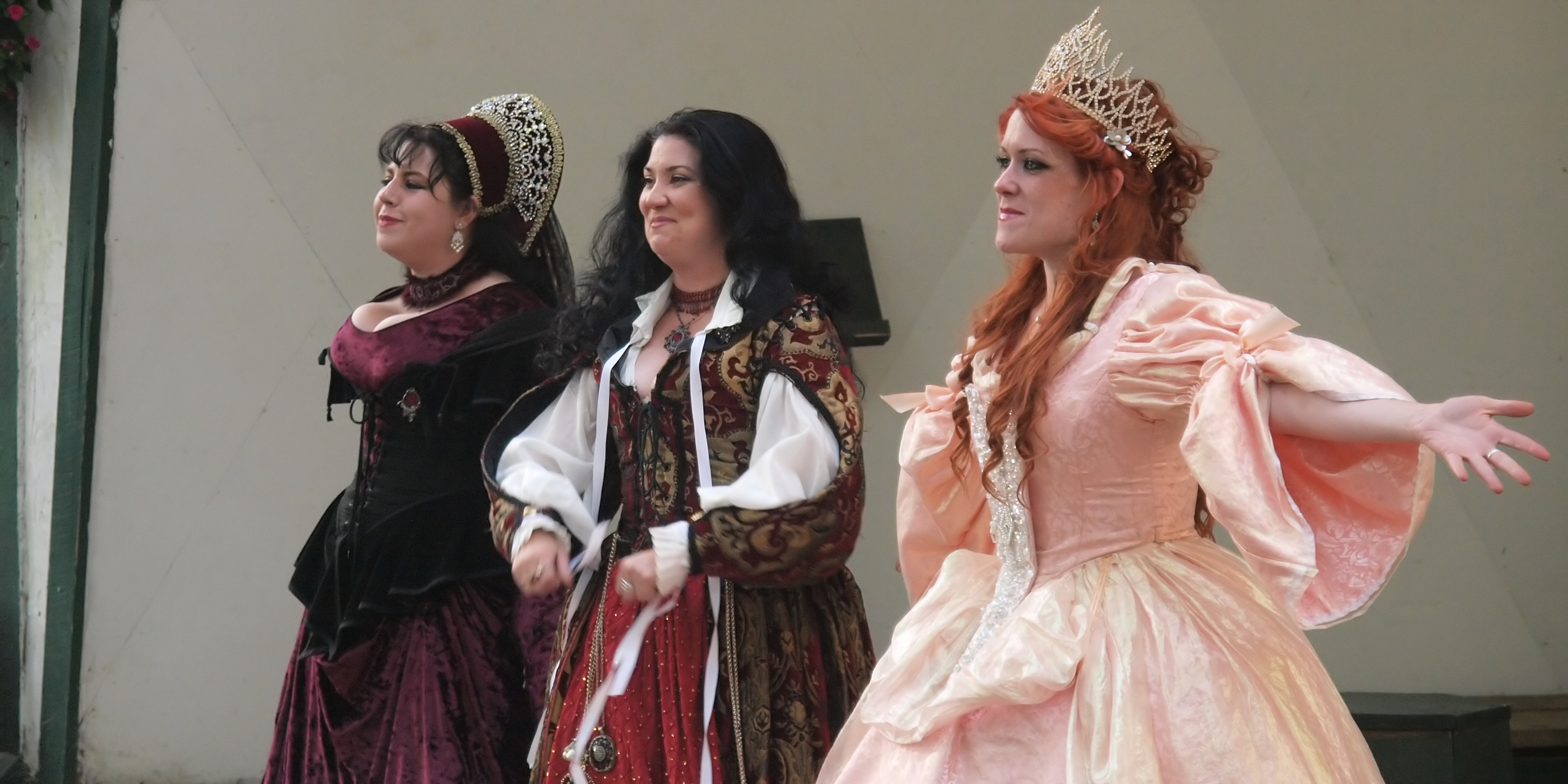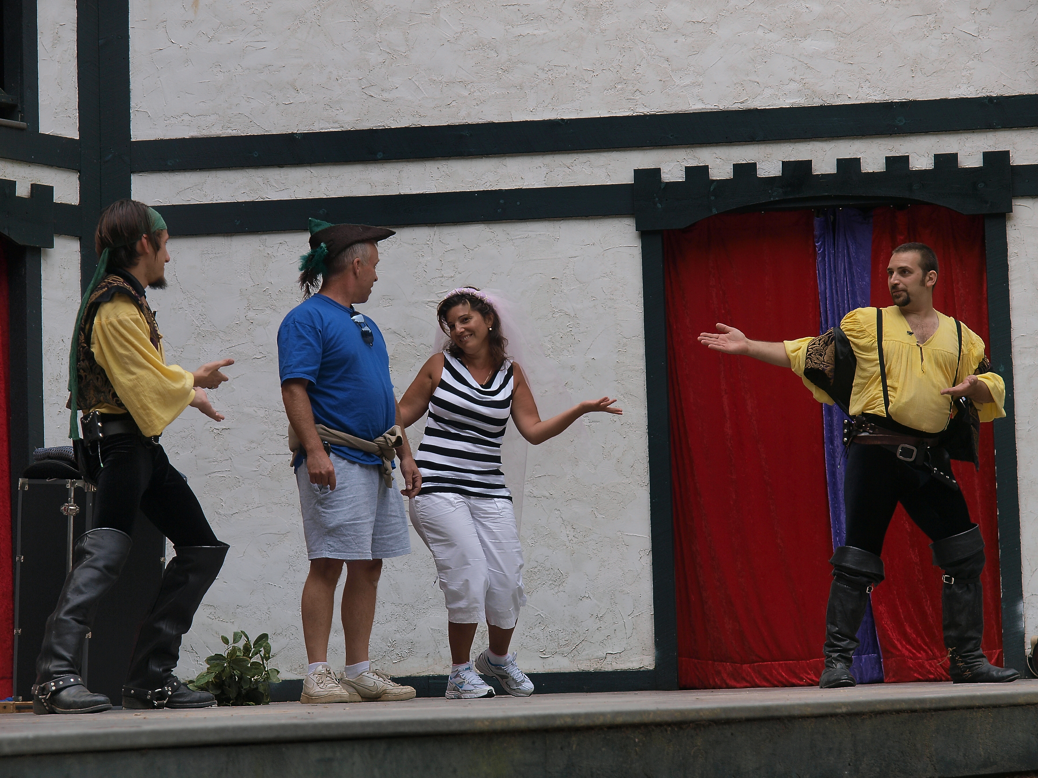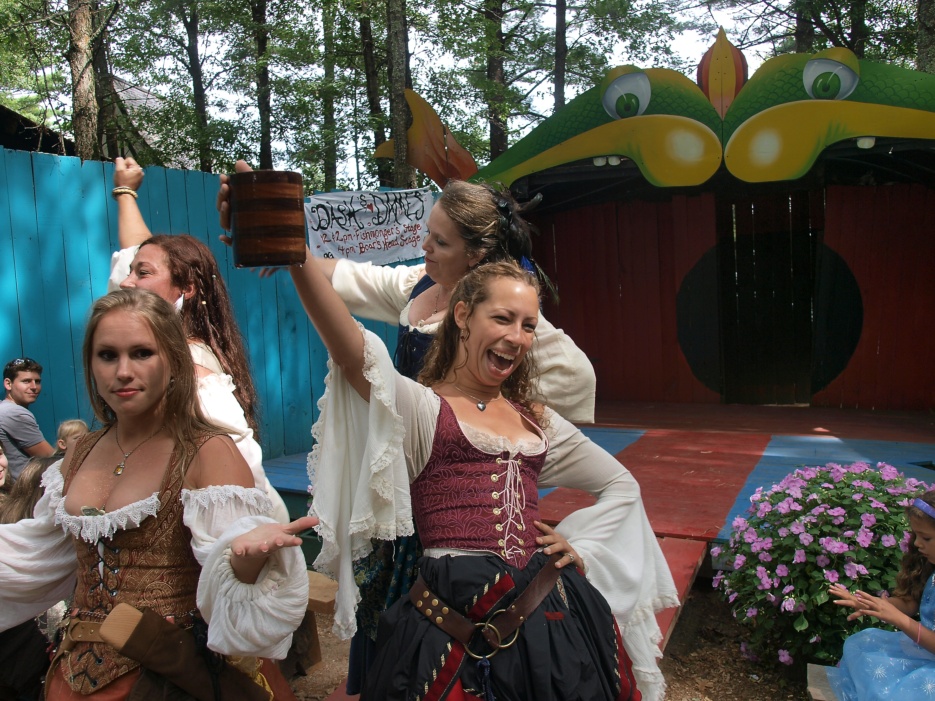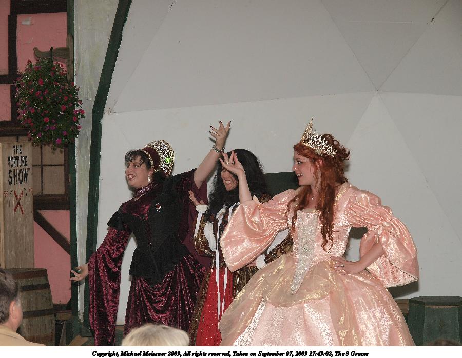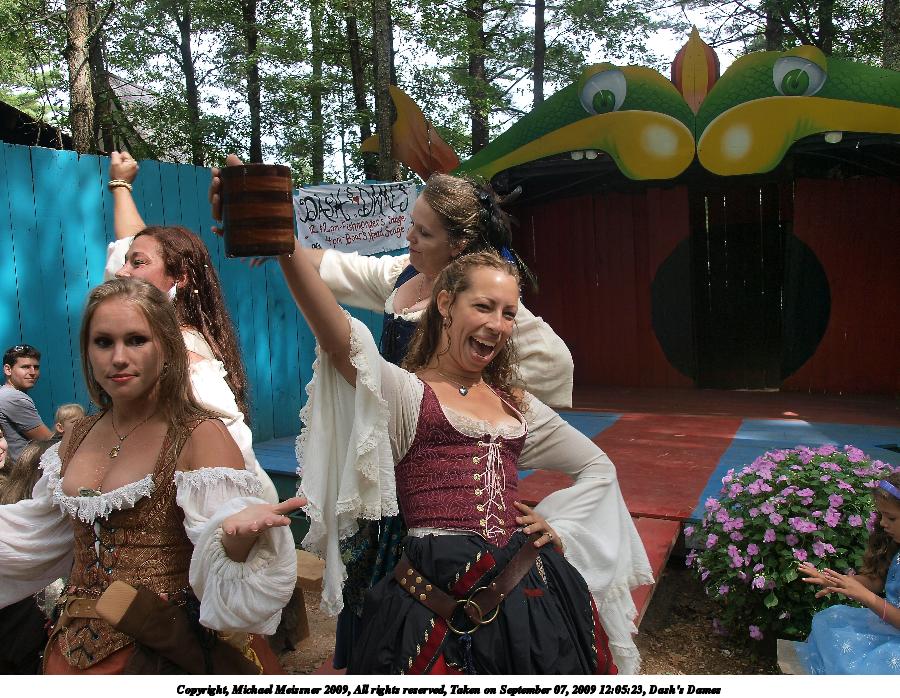 Picture #2: The 3 Graces Thumb: 400x200, 29,676 bytes (29K) Small: 800x423, 59,790 bytes (59K), (html file) Large: 3200x1600, 3,150,127 bytes (3.0M), (html file) Copyright, Michael Meissner 2009, All rights reserved Olympus E-3 camera with Olympus 14-54mm f/2.8-3.5 lens f/3.5, ISO 800, 1/100 sec, 52.0mm, auto mode, natural color, auto gradation, SHQ, center weight metering, IS1 (All Direction Shake IS), noise filter low 35mm equivalent focal length 104.0mm Programs used: gimp, neatimage Taken by Michael Meissner on September 07, 2009 17:47:13 Last modified on January 31, 2011 at 22:05 The 3 Graces now perform at other faires. In 2009, the middle actor was no longer with King Richards, but she came as a patron and they were asked to come up to the finale to do a number. |