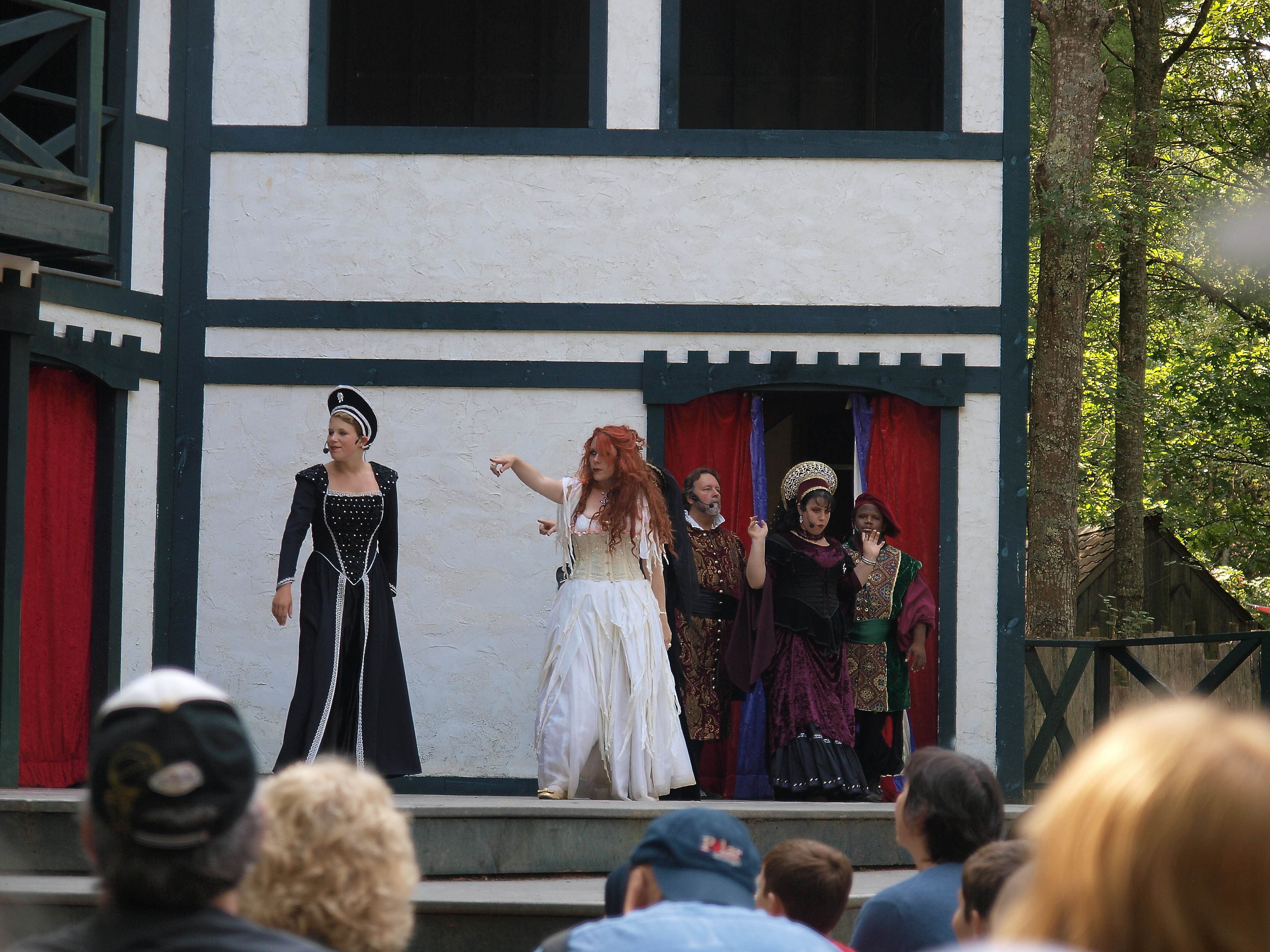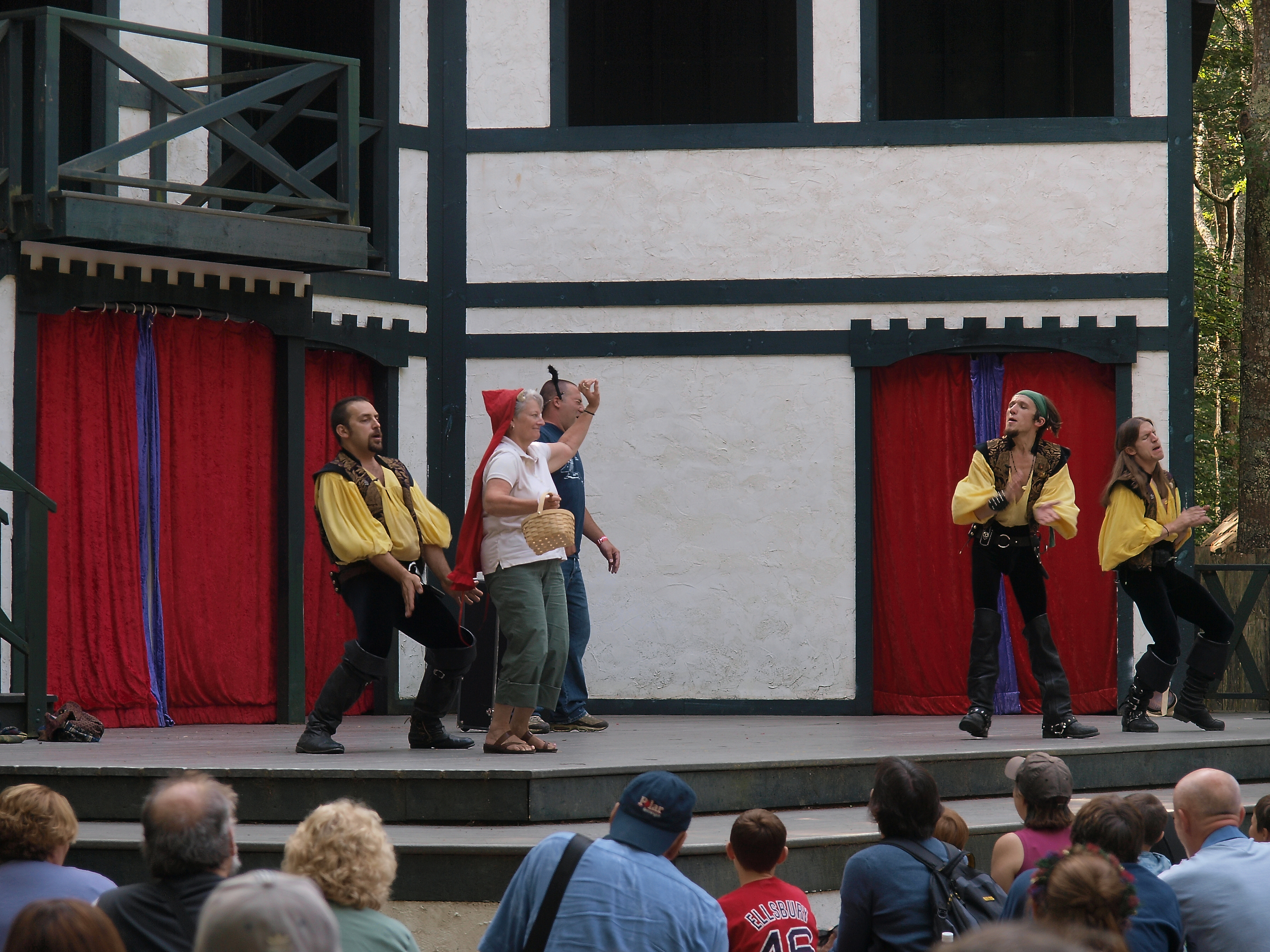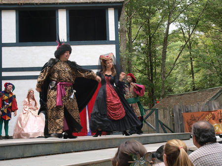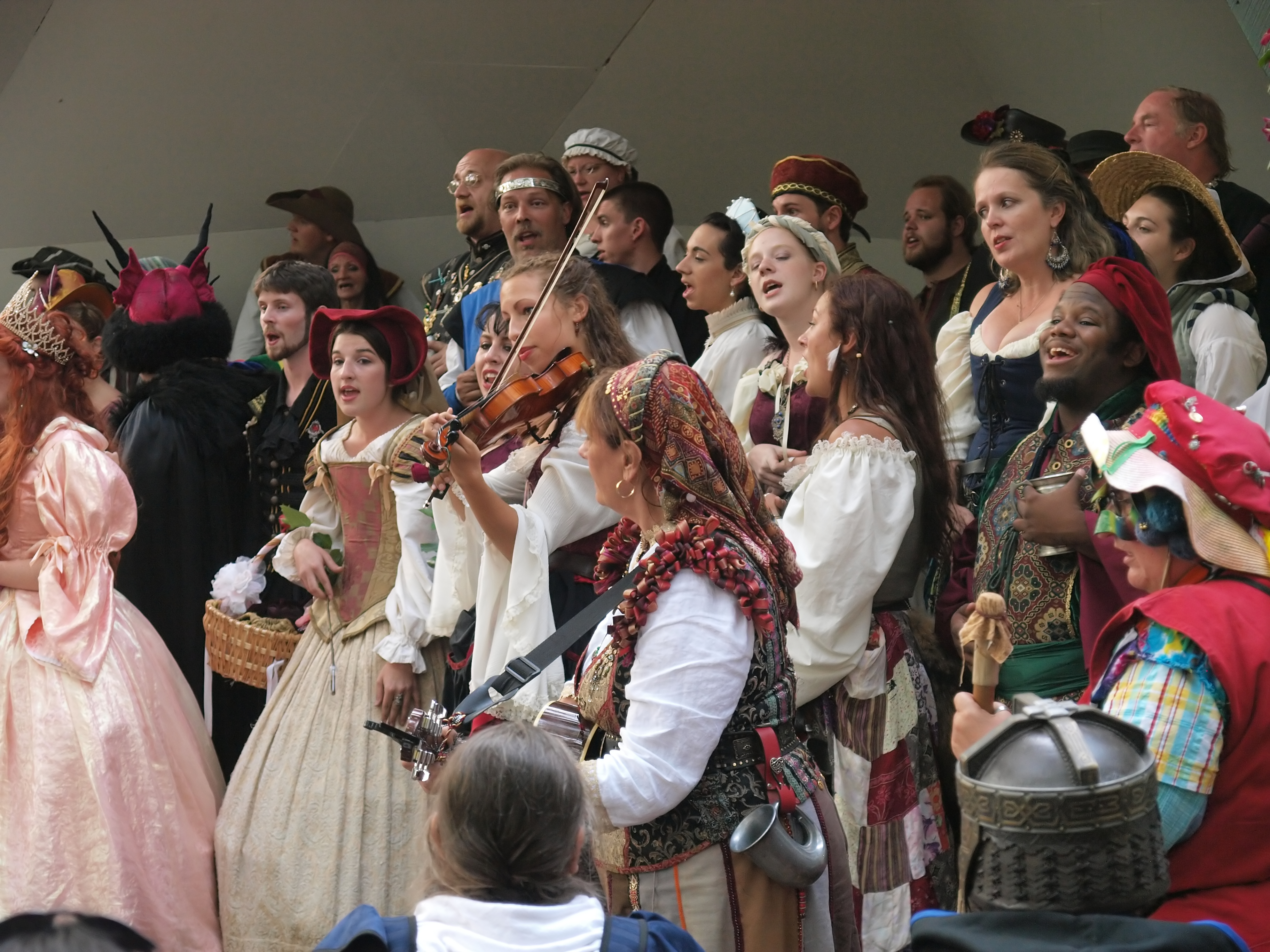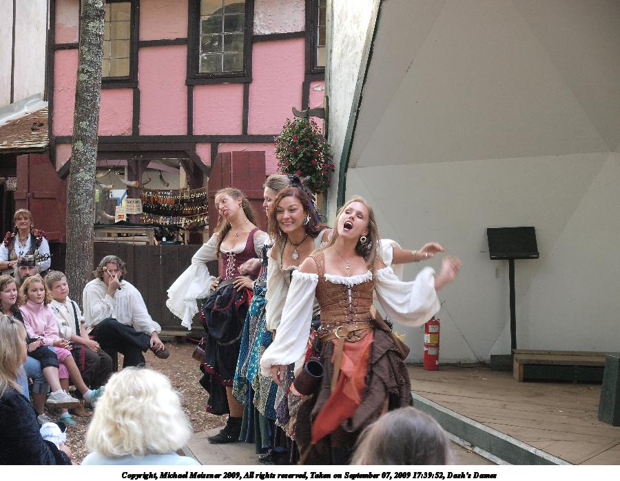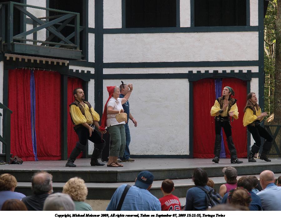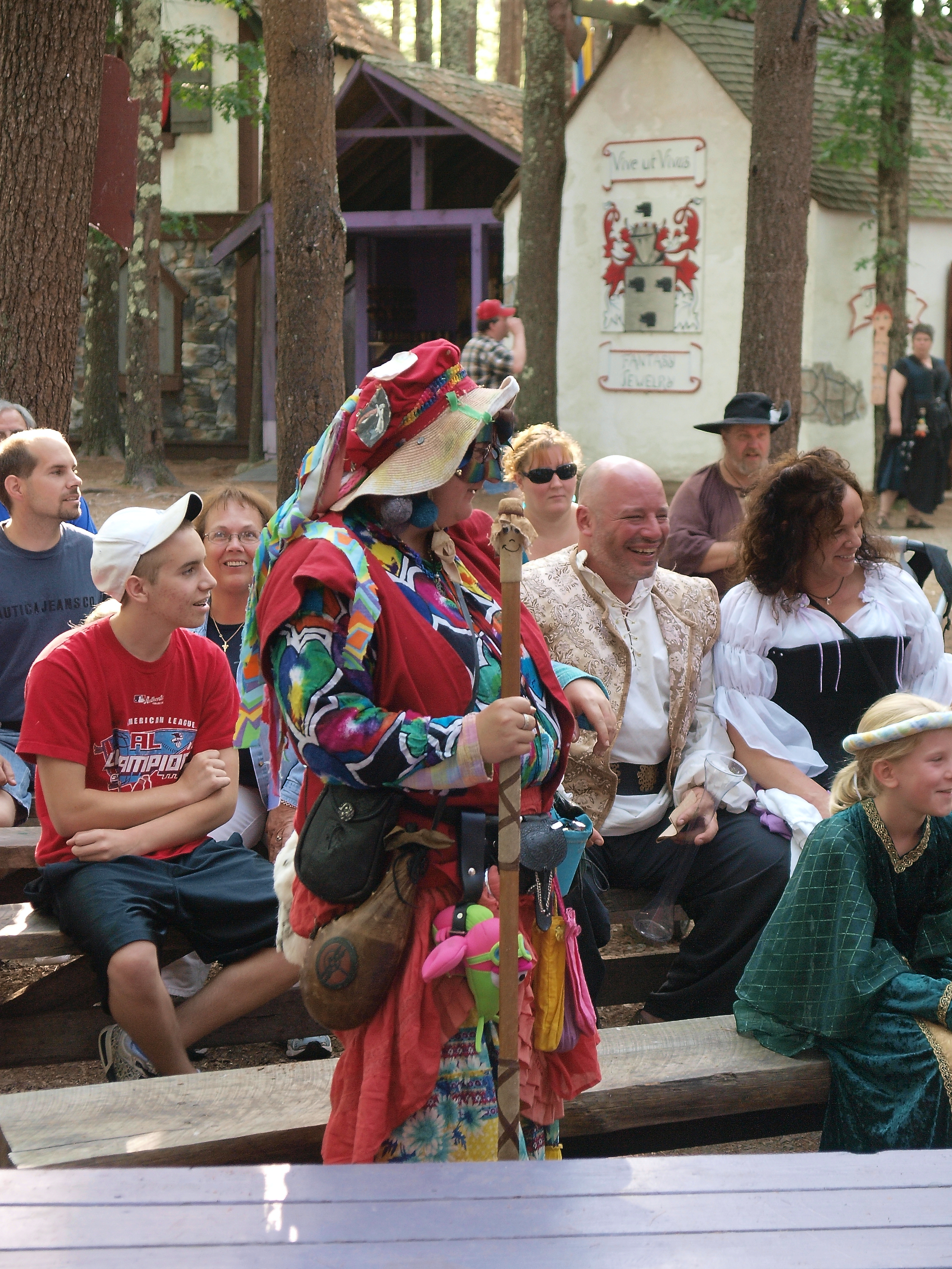 Picture #2: The 3 Graces Thumb: 400x200, 29,676 bytes (29K) Small: 800x423, 59,790 bytes (59K), (html file) Large: 3200x1600, 3,150,127 bytes (3.0M), (html file) Copyright, Michael Meissner 2009, All rights reserved Olympus E-3 camera with Olympus 14-54mm f/2.8-3.5 lens f/3.5, ISO 800, 1/100 sec, 52.0mm, auto mode, natural color, auto gradation, SHQ, center weight metering, IS1 (All Direction Shake IS), noise filter low 35mm equivalent focal length 104.0mm Programs used: gimp, neatimage Taken by Michael Meissner on September 07, 2009 17:47:13 Last modified on January 31, 2011 at 22:05 The 3 Graces now perform at other faires. In 2009, the middle actor was no longer with King Richards, but she came as a patron and they were asked to come up to the finale to do a number. |