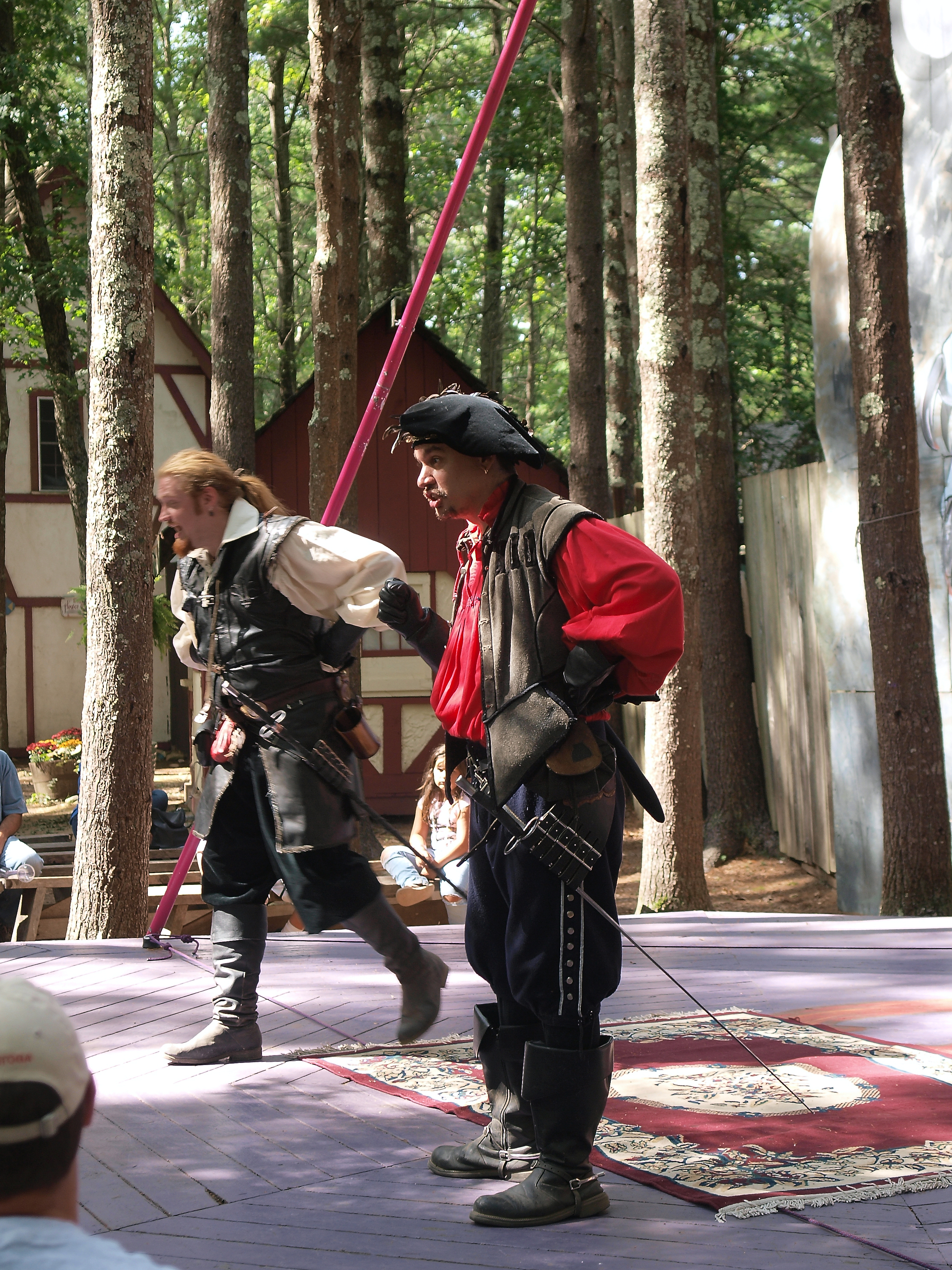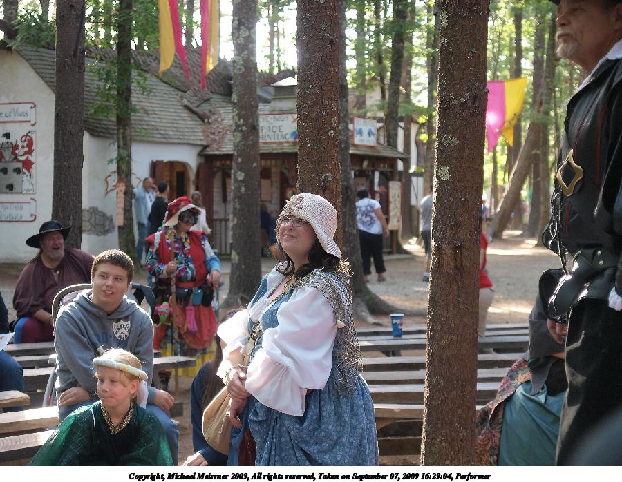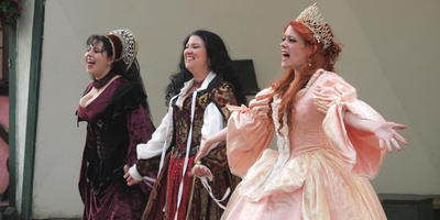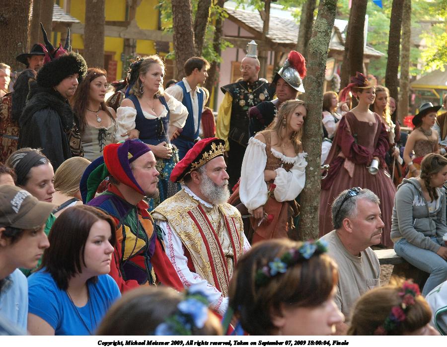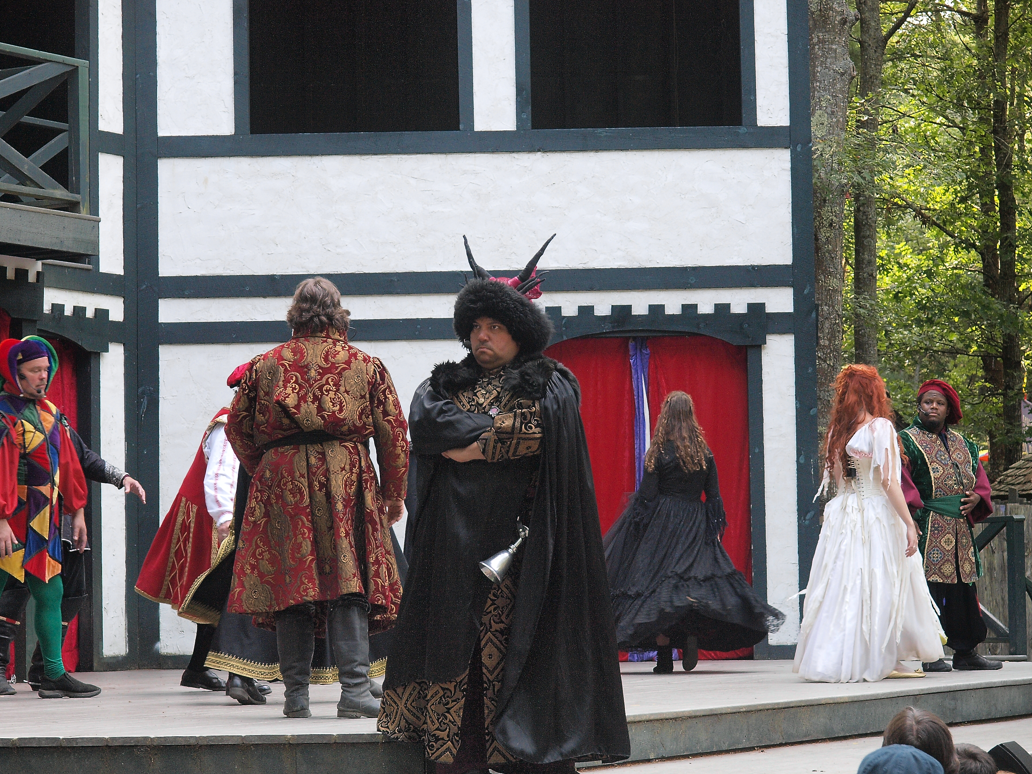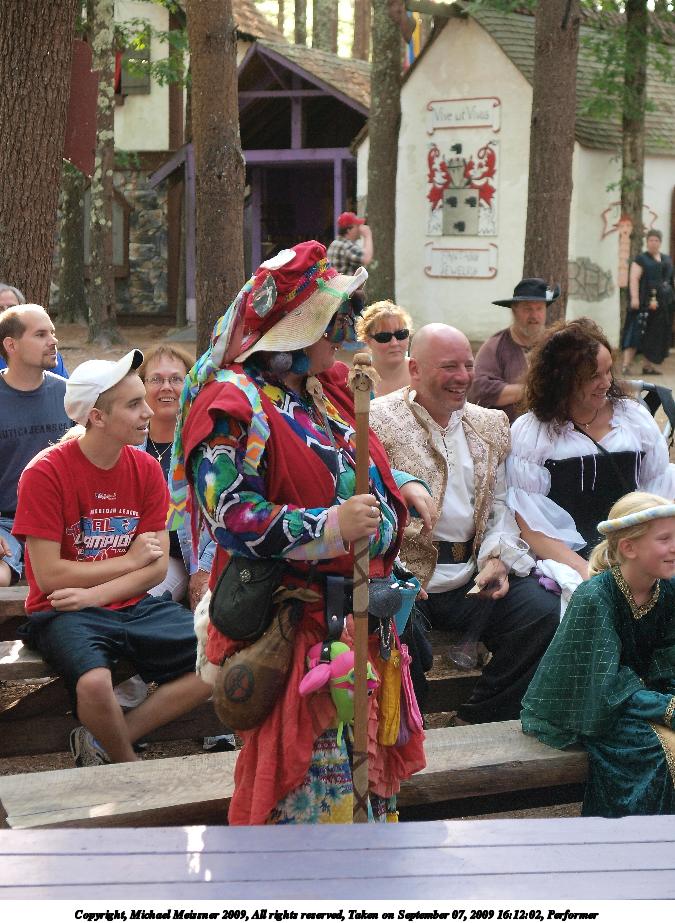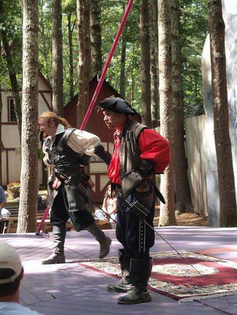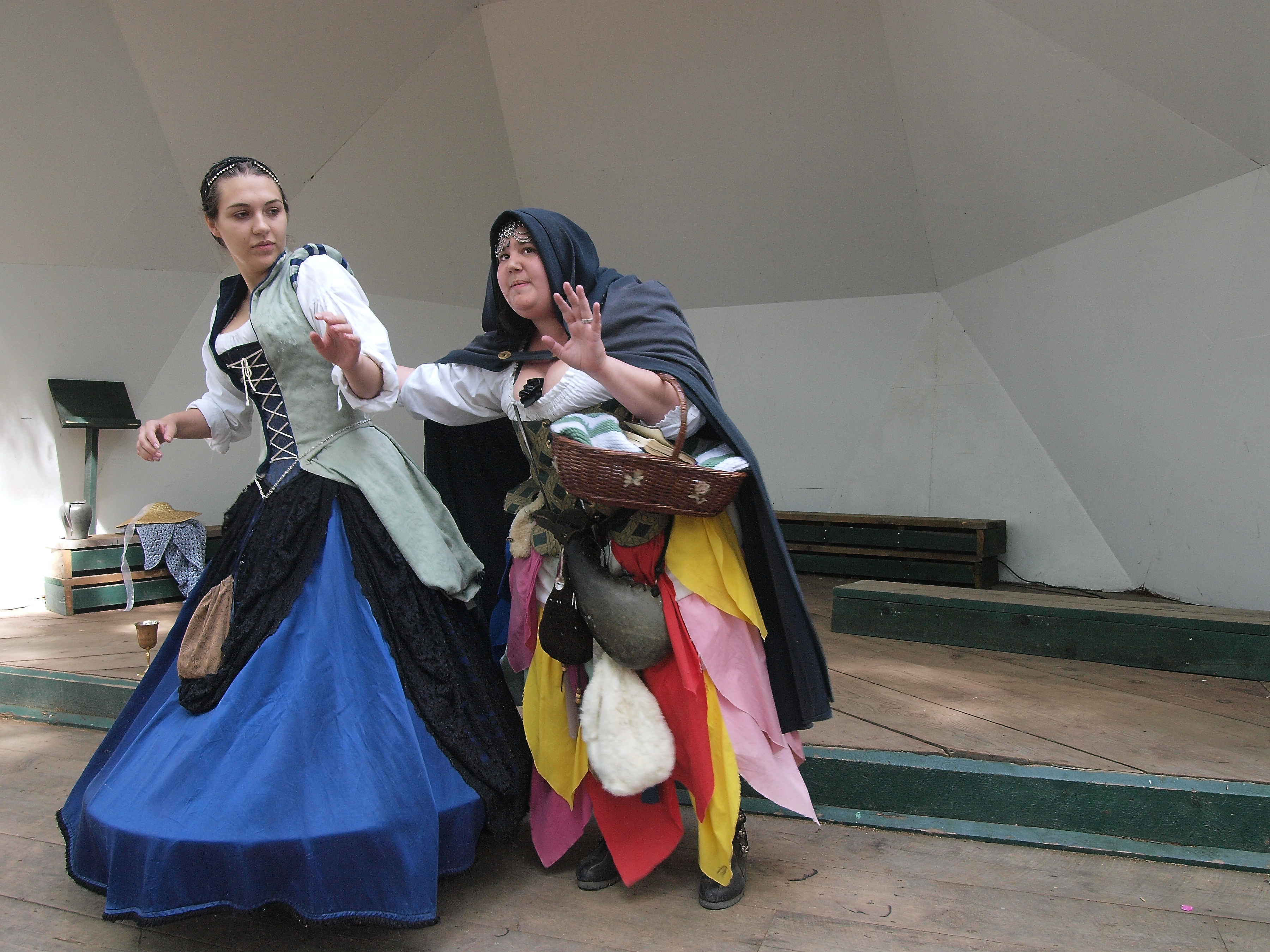 Picture #2: The 3 Graces Thumb: 400x200, 29,676 bytes (29K) Small: 800x423, 59,790 bytes (59K), (html file) Large: 3200x1600, 3,150,127 bytes (3.0M), (html file) Copyright, Michael Meissner 2009, All rights reserved Olympus E-3 camera with Olympus 14-54mm f/2.8-3.5 lens f/3.5, ISO 800, 1/100 sec, 52.0mm, auto mode, natural color, auto gradation, SHQ, center weight metering, IS1 (All Direction Shake IS), noise filter low 35mm equivalent focal length 104.0mm Programs used: gimp, neatimage Taken by Michael Meissner on September 07, 2009 17:47:13 Last modified on January 31, 2011 at 22:05 The 3 Graces now perform at other faires. In 2009, the middle actor was no longer with King Richards, but she came as a patron and they were asked to come up to the finale to do a number. |