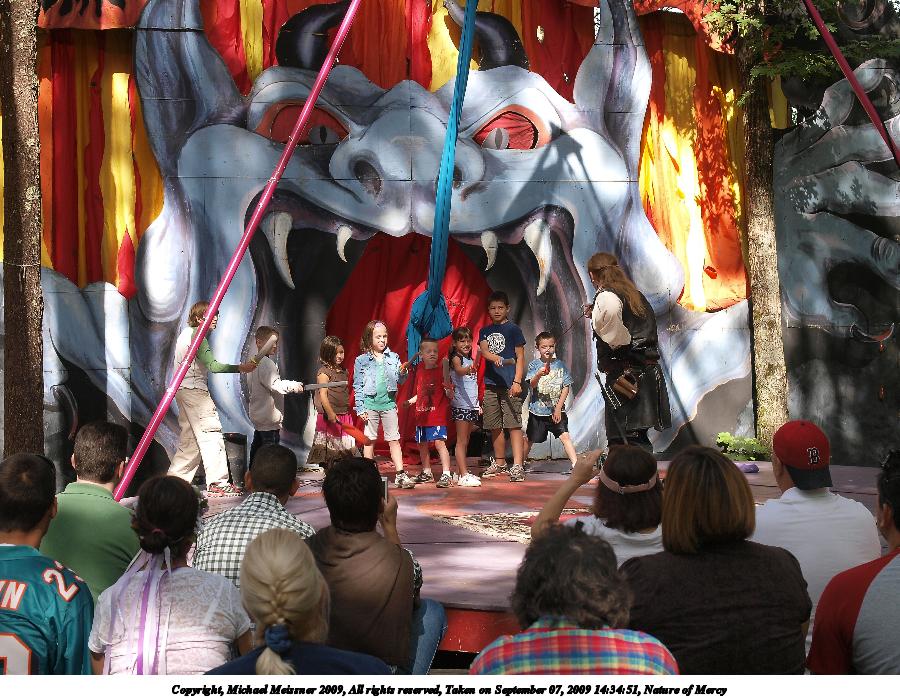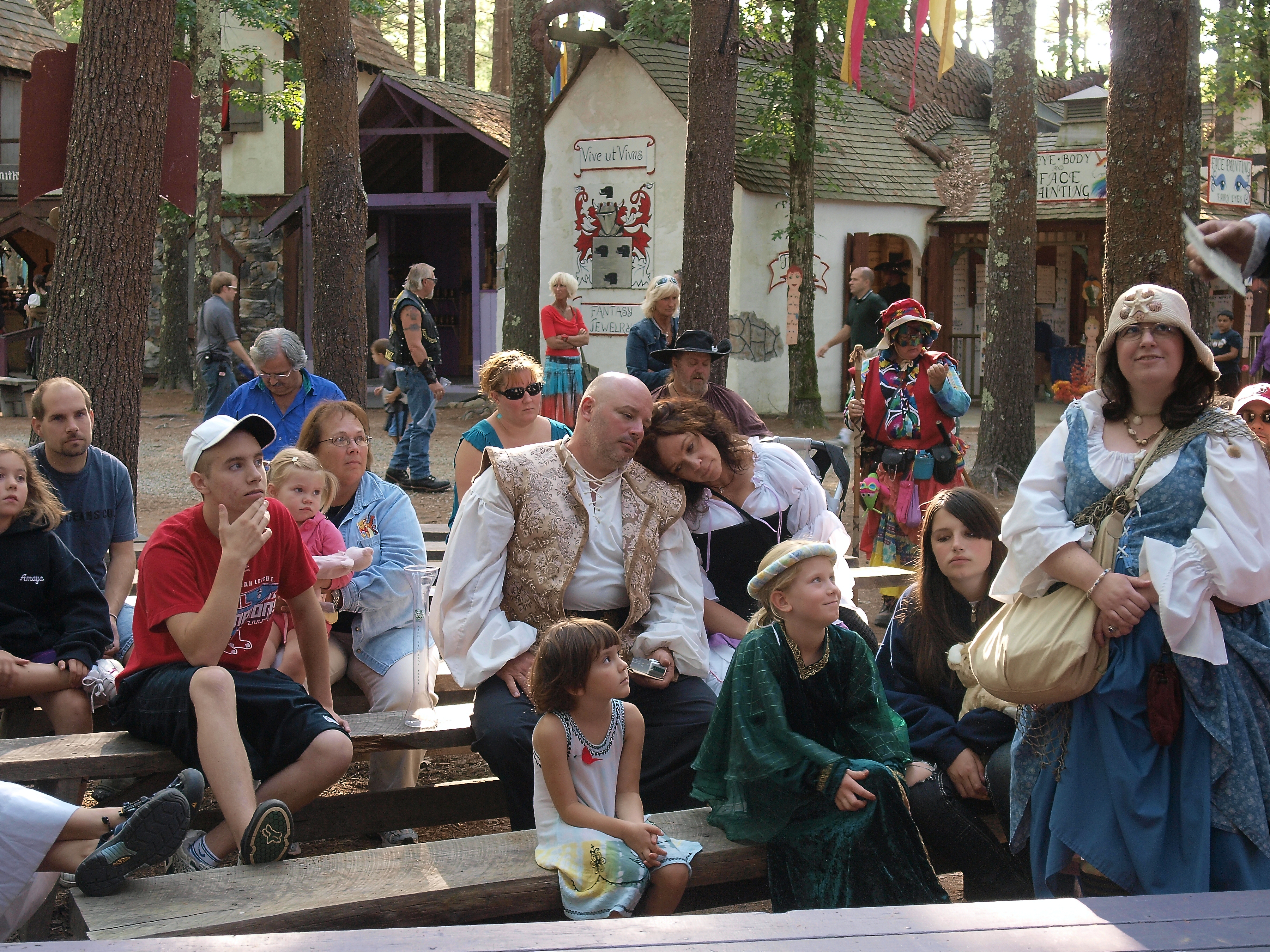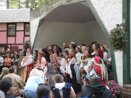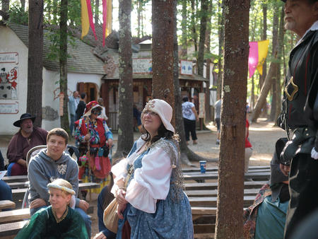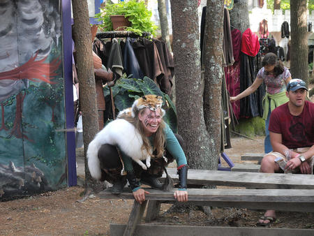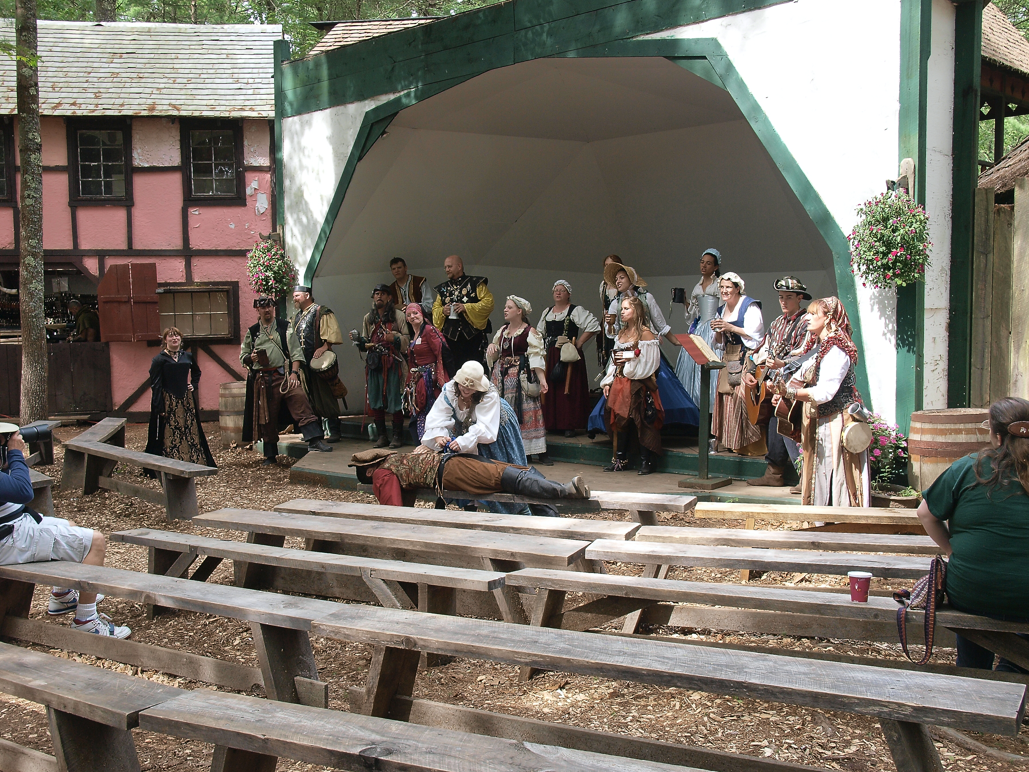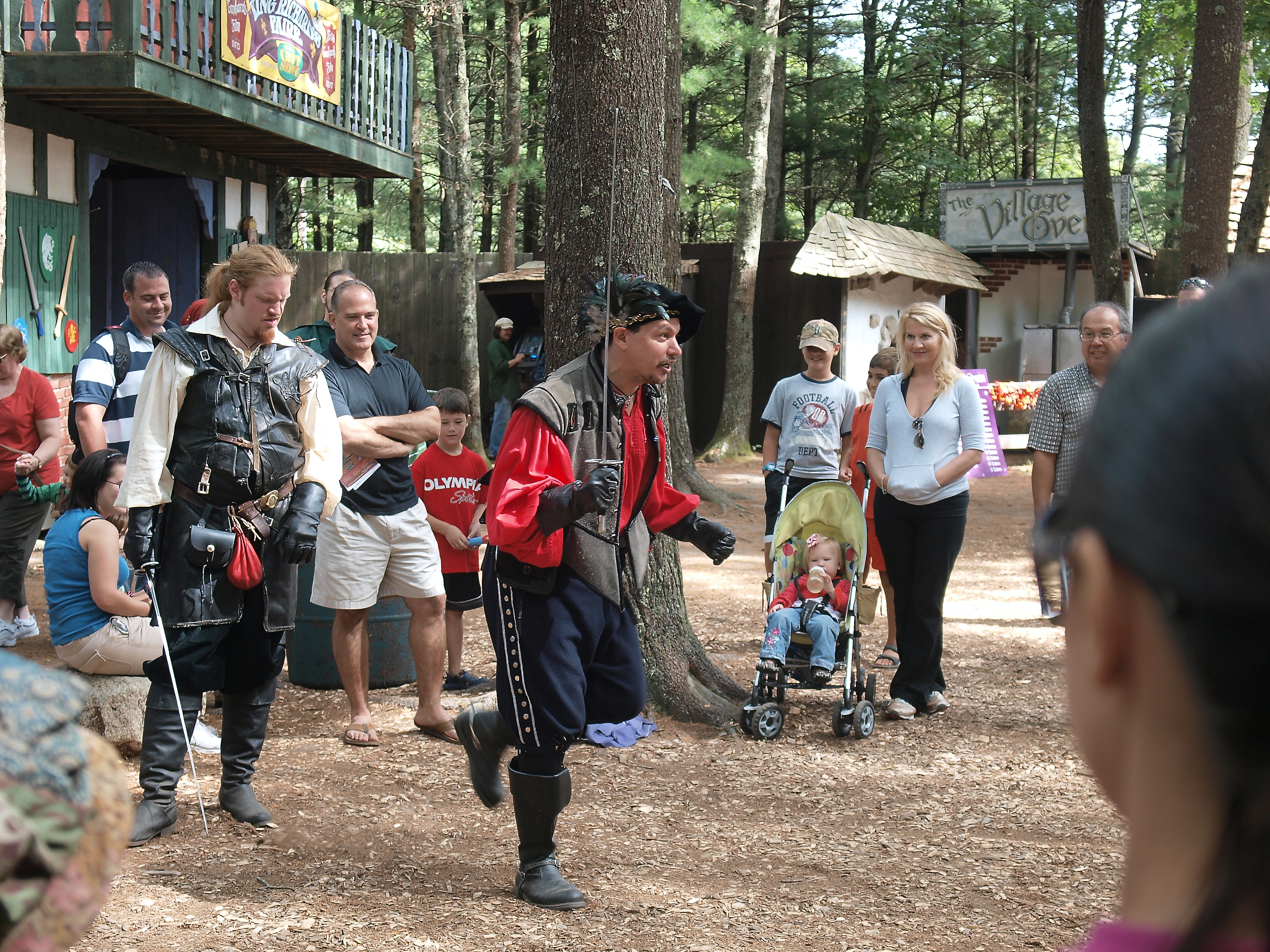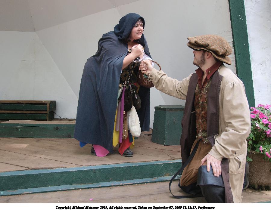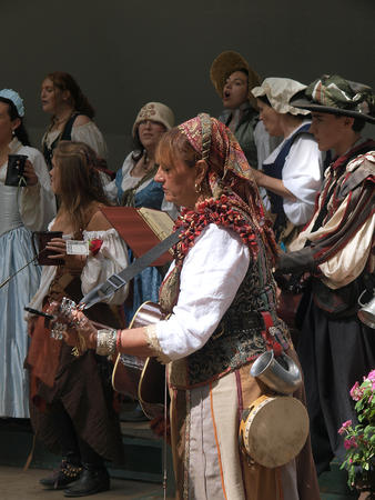 Picture #2: The 3 Graces Thumb: 400x200, 29,676 bytes (29K) Small: 800x423, 59,790 bytes (59K), (html file) Large: 3200x1600, 3,150,127 bytes (3.0M), (html file) Copyright, Michael Meissner 2009, All rights reserved Olympus E-3 camera with Olympus 14-54mm f/2.8-3.5 lens f/3.5, ISO 800, 1/100 sec, 52.0mm, auto mode, natural color, auto gradation, SHQ, center weight metering, IS1 (All Direction Shake IS), noise filter low 35mm equivalent focal length 104.0mm Programs used: gimp, neatimage Taken by Michael Meissner on September 07, 2009 17:47:13 Last modified on January 31, 2011 at 22:05 The 3 Graces now perform at other faires. In 2009, the middle actor was no longer with King Richards, but she came as a patron and they were asked to come up to the finale to do a number. |