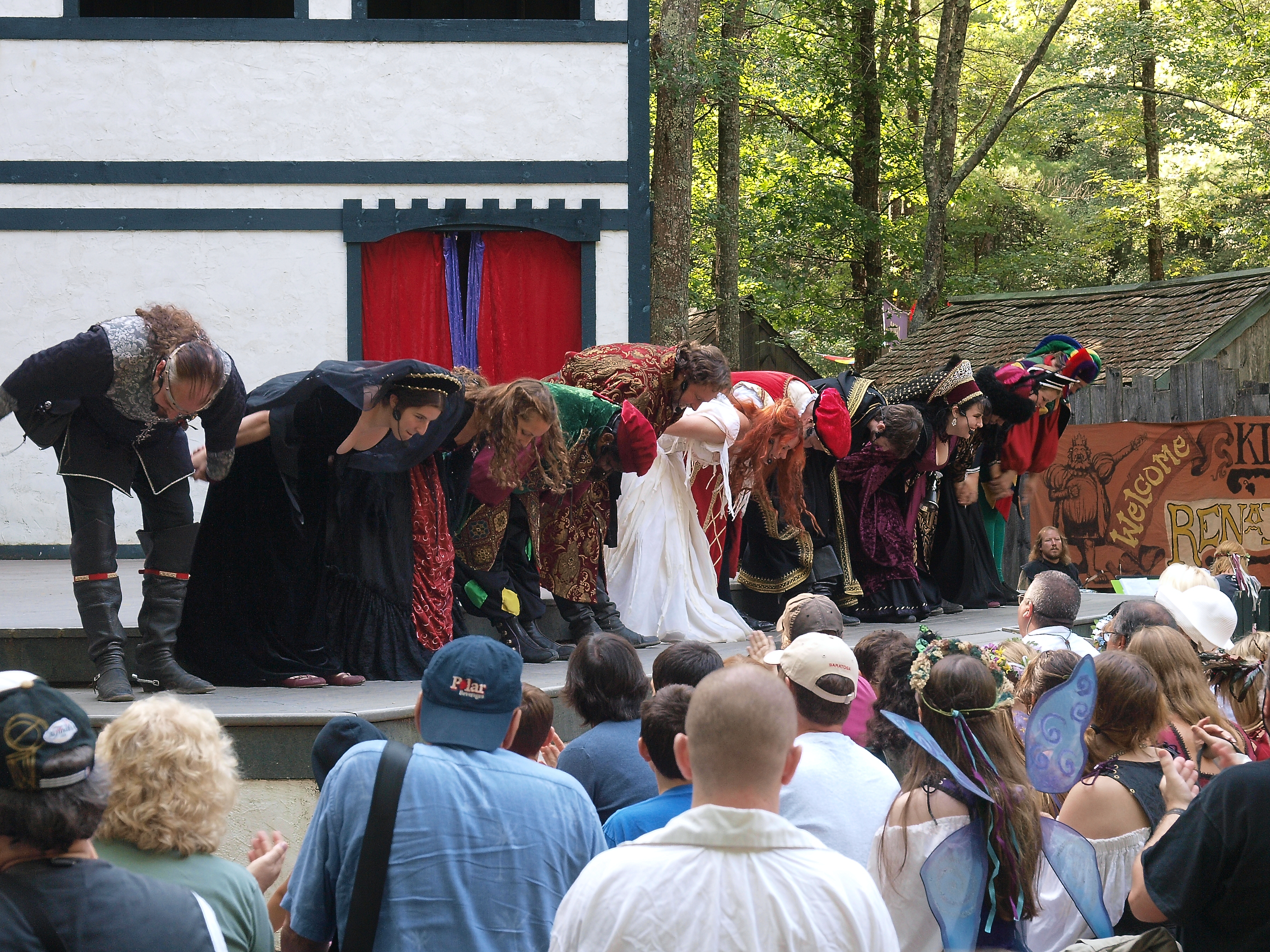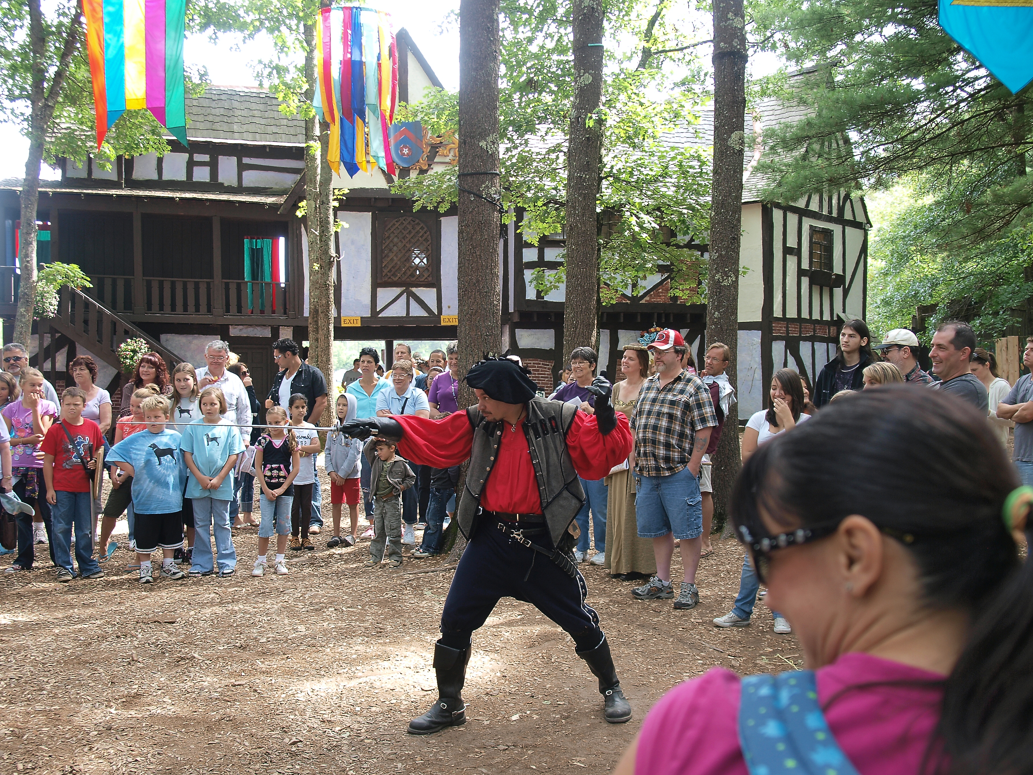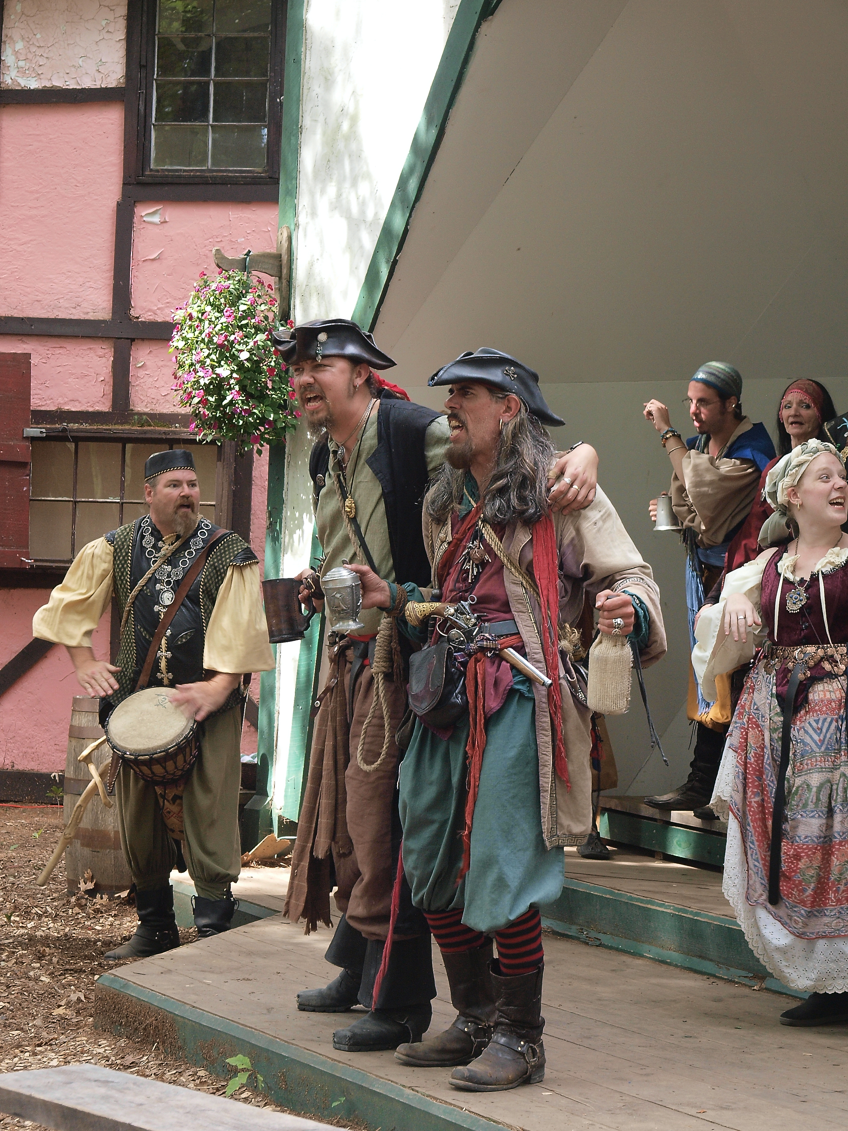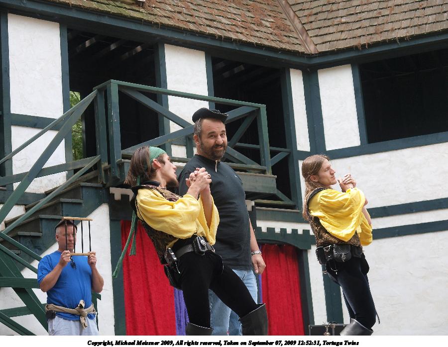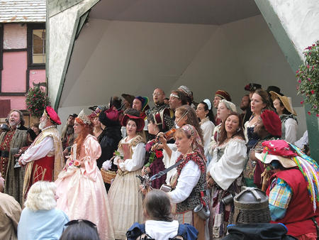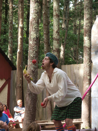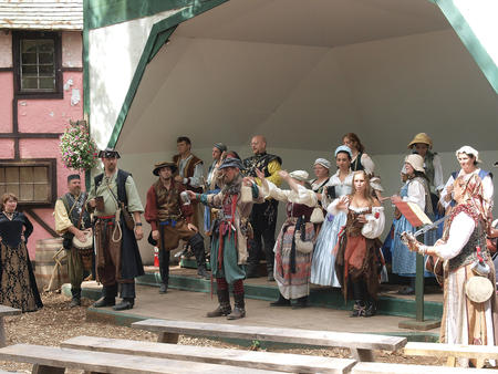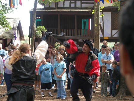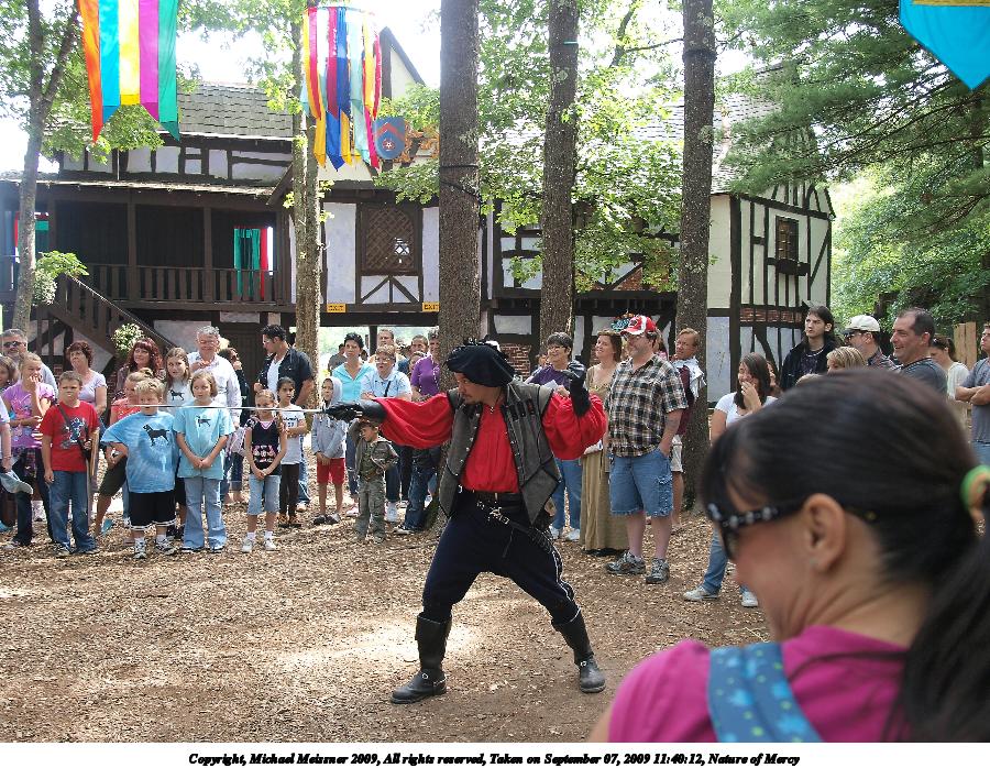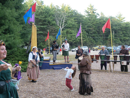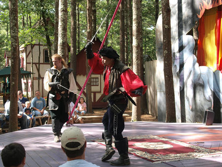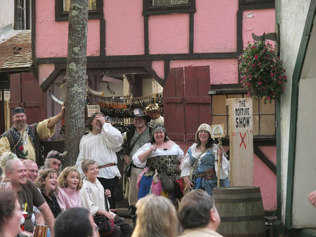 Picture #2: The 3 Graces Thumb: 400x200, 29,676 bytes (29K) Small: 800x423, 59,790 bytes (59K), (html file) Large: 3200x1600, 3,150,127 bytes (3.0M), (html file) Copyright, Michael Meissner 2009, All rights reserved Olympus E-3 camera with Olympus 14-54mm f/2.8-3.5 lens f/3.5, ISO 800, 1/100 sec, 52.0mm, auto mode, natural color, auto gradation, SHQ, center weight metering, IS1 (All Direction Shake IS), noise filter low 35mm equivalent focal length 104.0mm Programs used: gimp, neatimage Taken by Michael Meissner on September 07, 2009 17:47:13 Last modified on January 31, 2011 at 22:05 The 3 Graces now perform at other faires. In 2009, the middle actor was no longer with King Richards, but she came as a patron and they were asked to come up to the finale to do a number. |