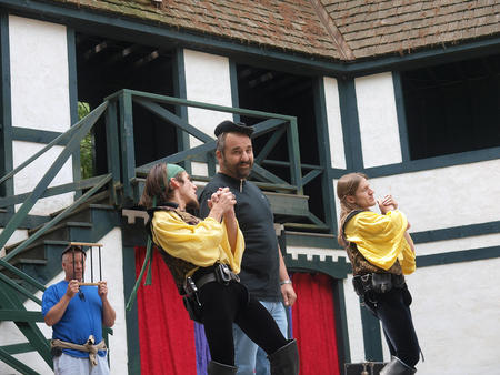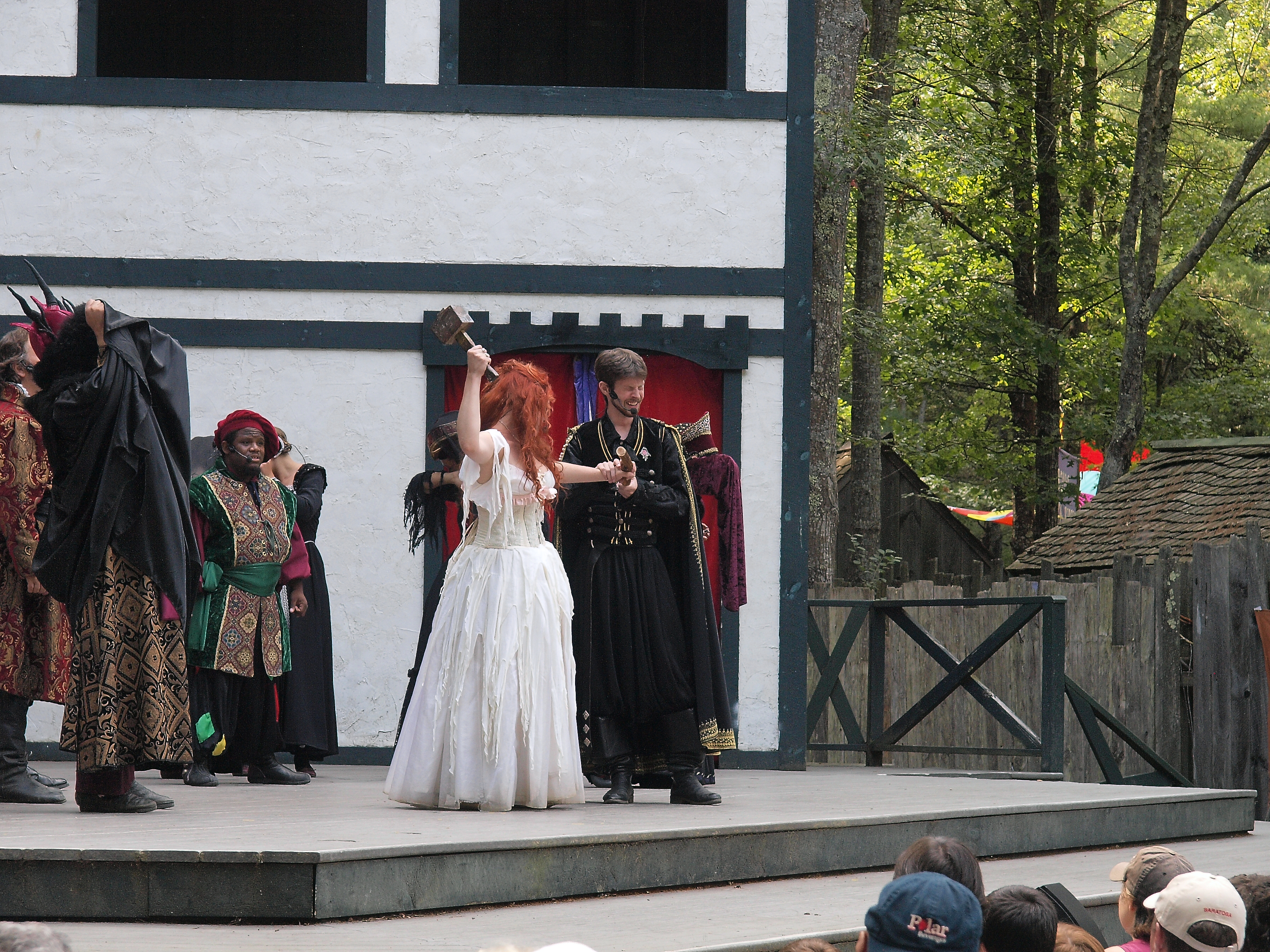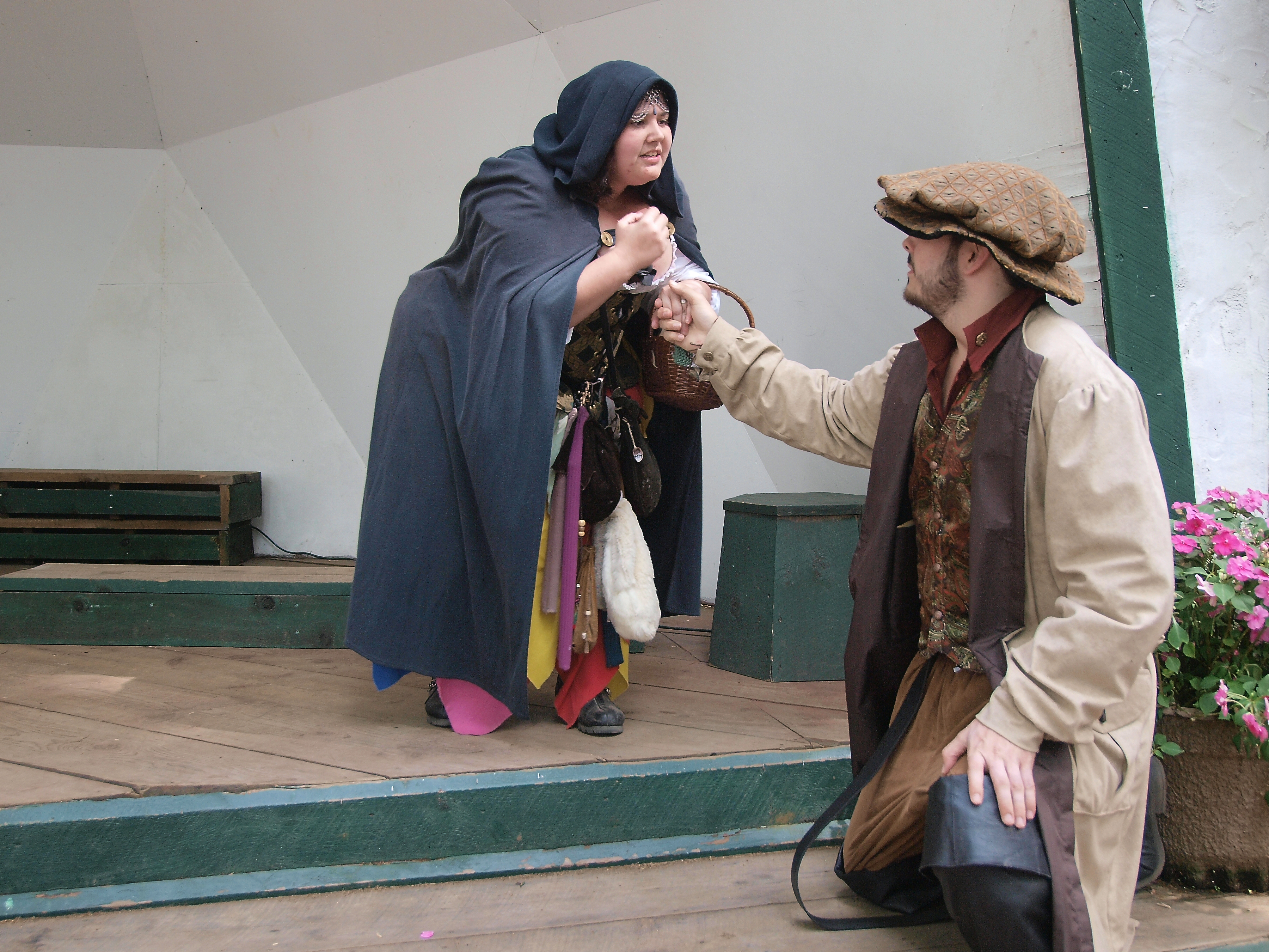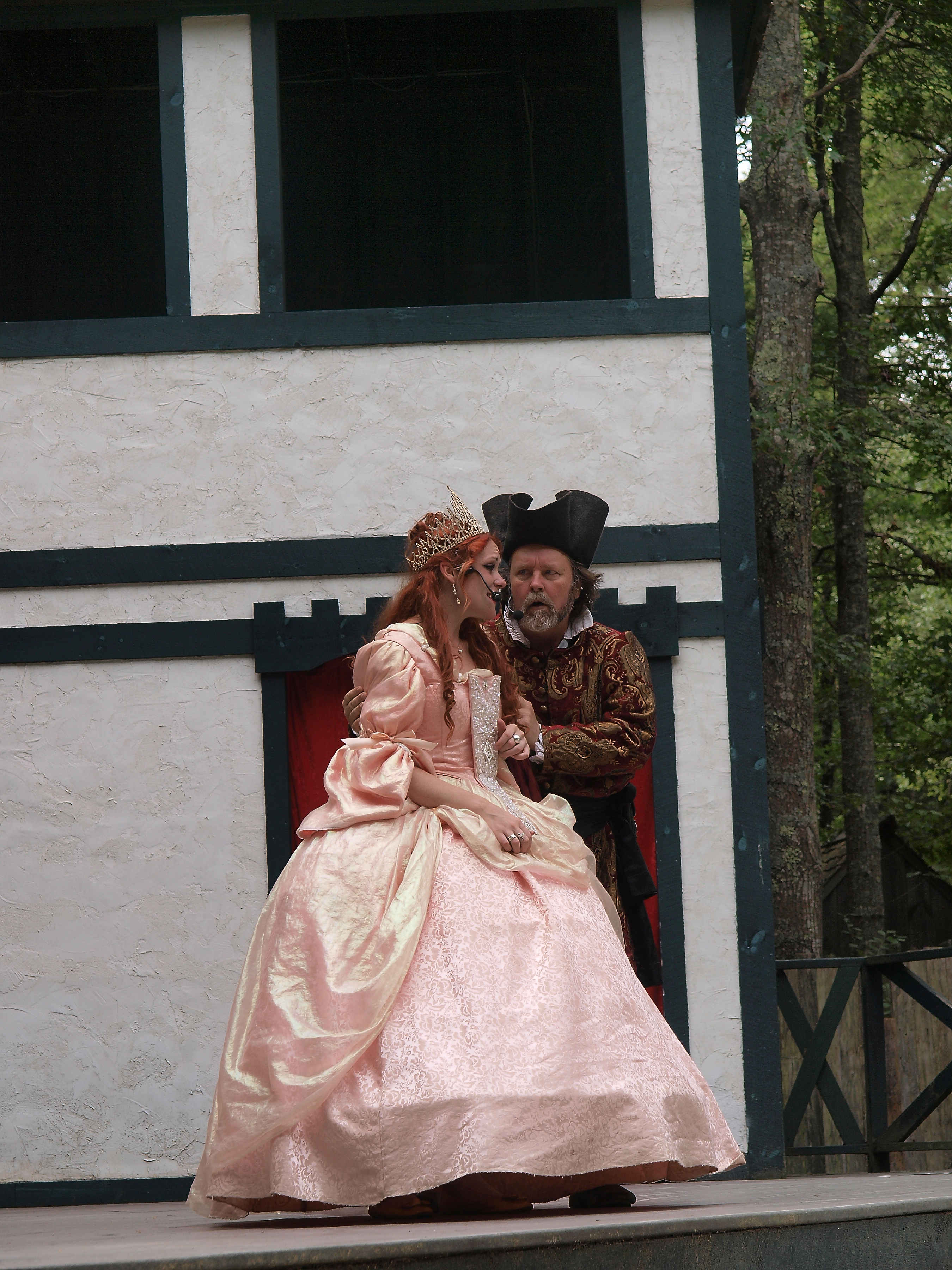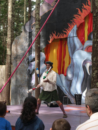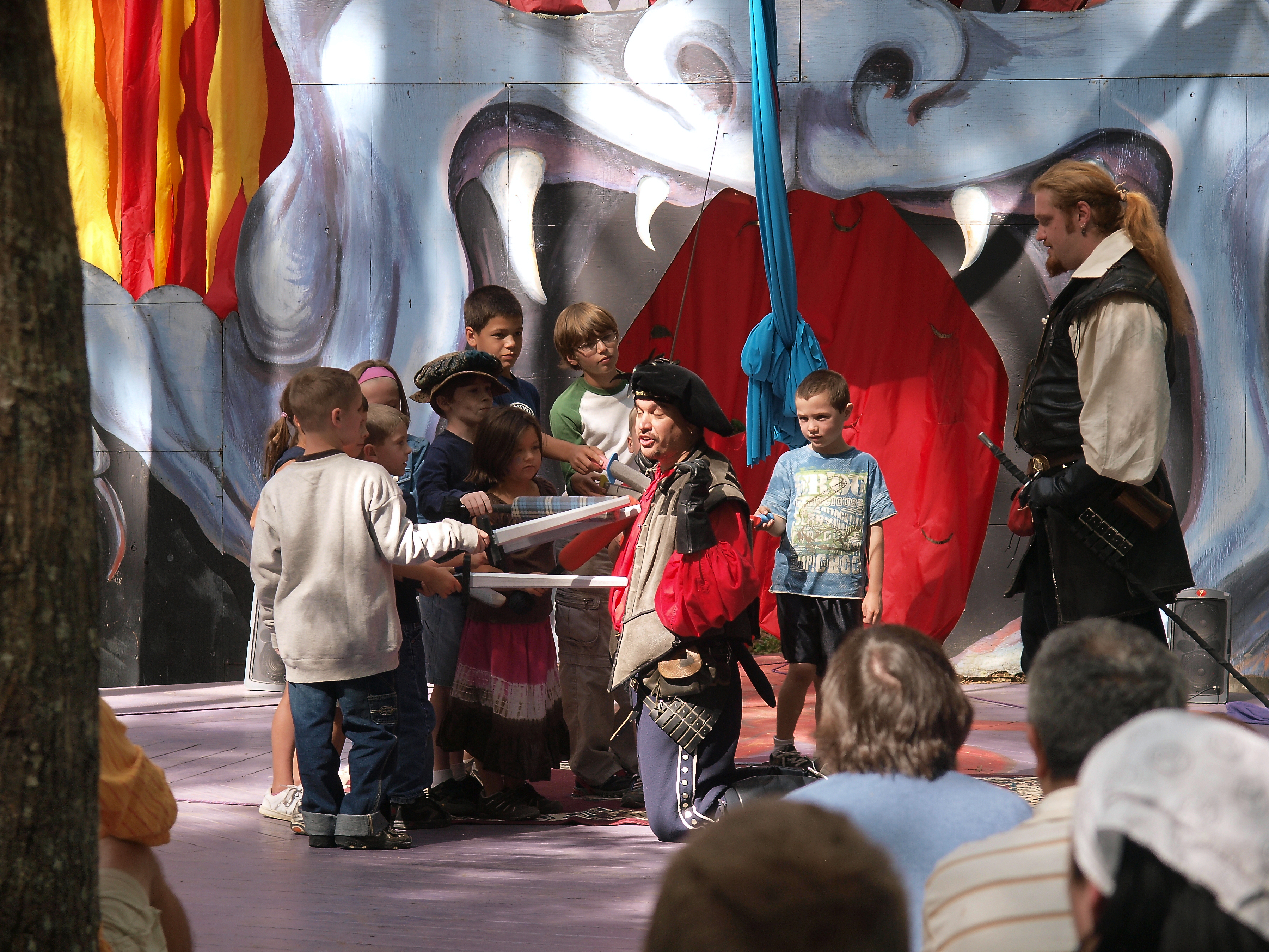 Picture #2: The 3 Graces Thumb: 400x200, 29,676 bytes (29K) Small: 800x423, 59,790 bytes (59K), (html file) Large: 3200x1600, 3,150,127 bytes (3.0M), (html file) Copyright, Michael Meissner 2009, All rights reserved Olympus E-3 camera with Olympus 14-54mm f/2.8-3.5 lens f/3.5, ISO 800, 1/100 sec, 52.0mm, auto mode, natural color, auto gradation, SHQ, center weight metering, IS1 (All Direction Shake IS), noise filter low 35mm equivalent focal length 104.0mm Programs used: gimp, neatimage Taken by Michael Meissner on September 07, 2009 17:47:13 Last modified on January 31, 2011 at 22:05 The 3 Graces now perform at other faires. In 2009, the middle actor was no longer with King Richards, but she came as a patron and they were asked to come up to the finale to do a number. |