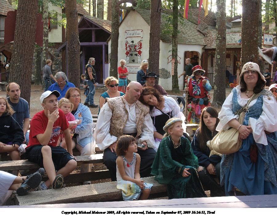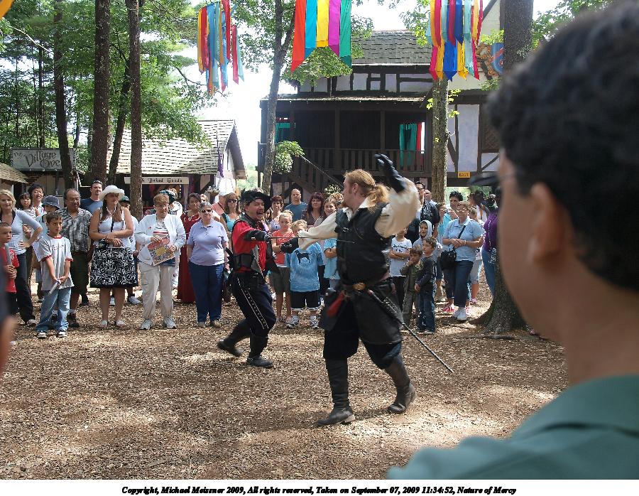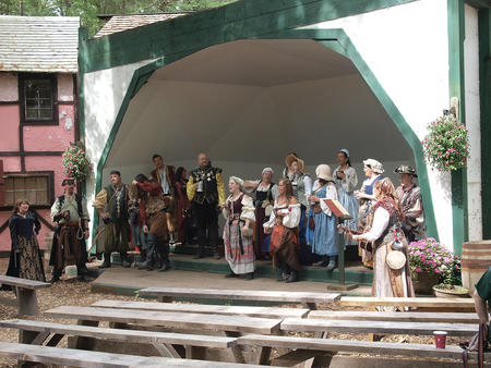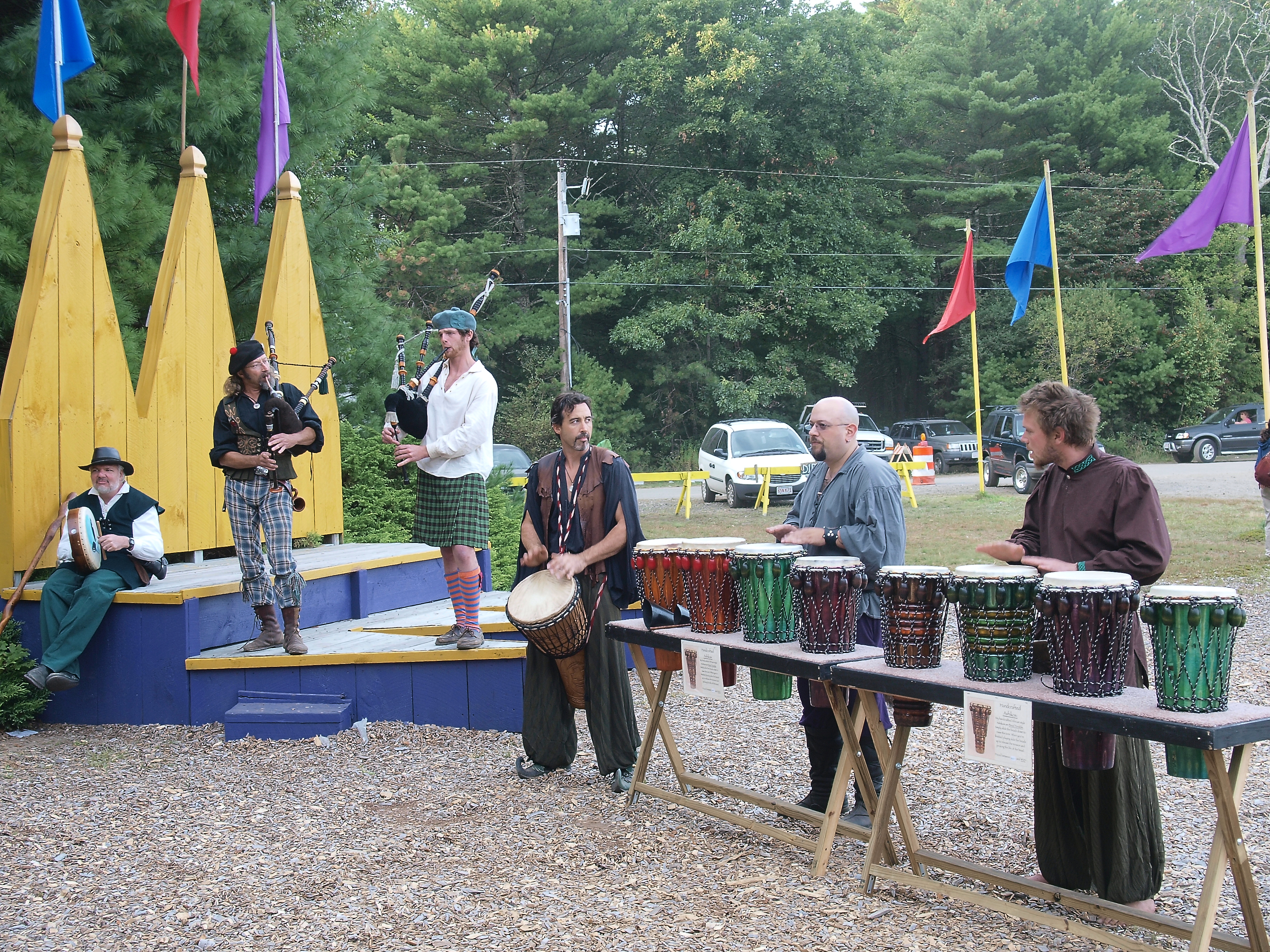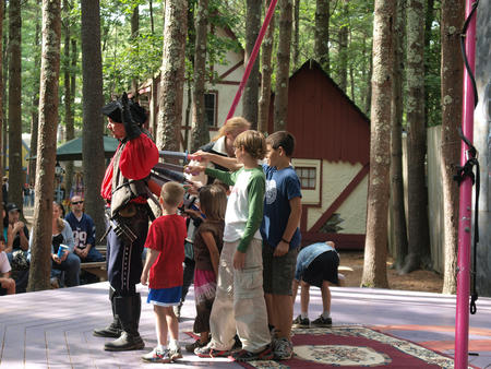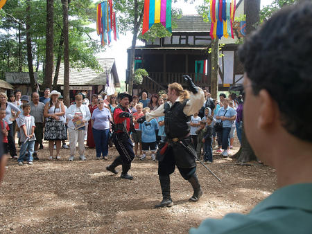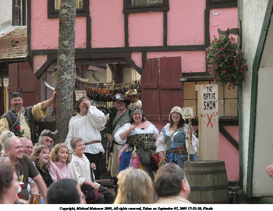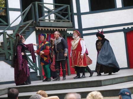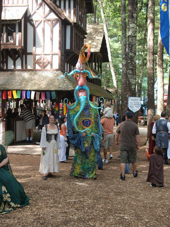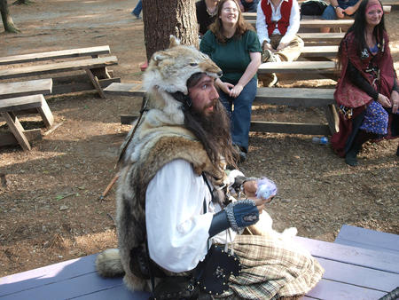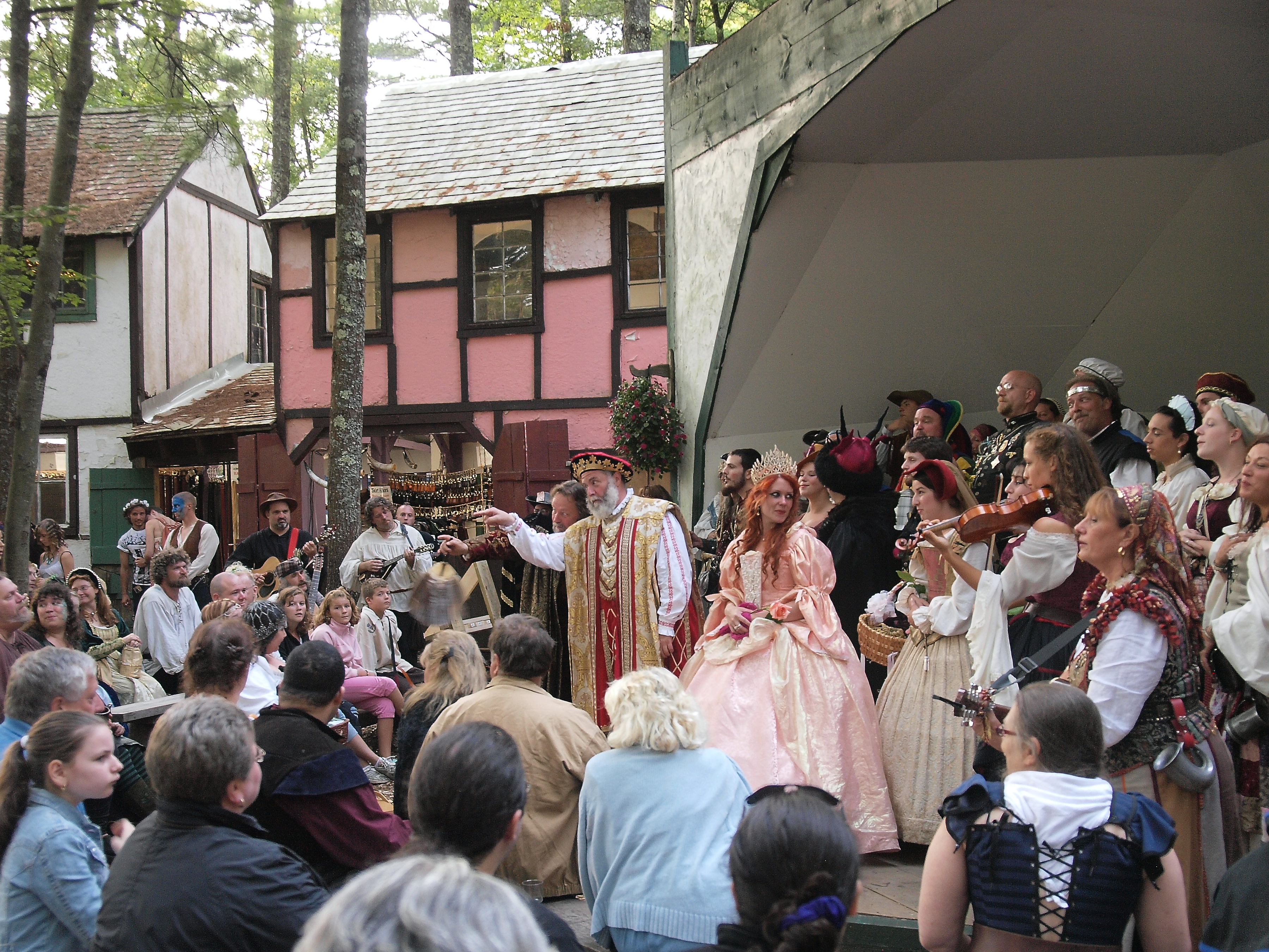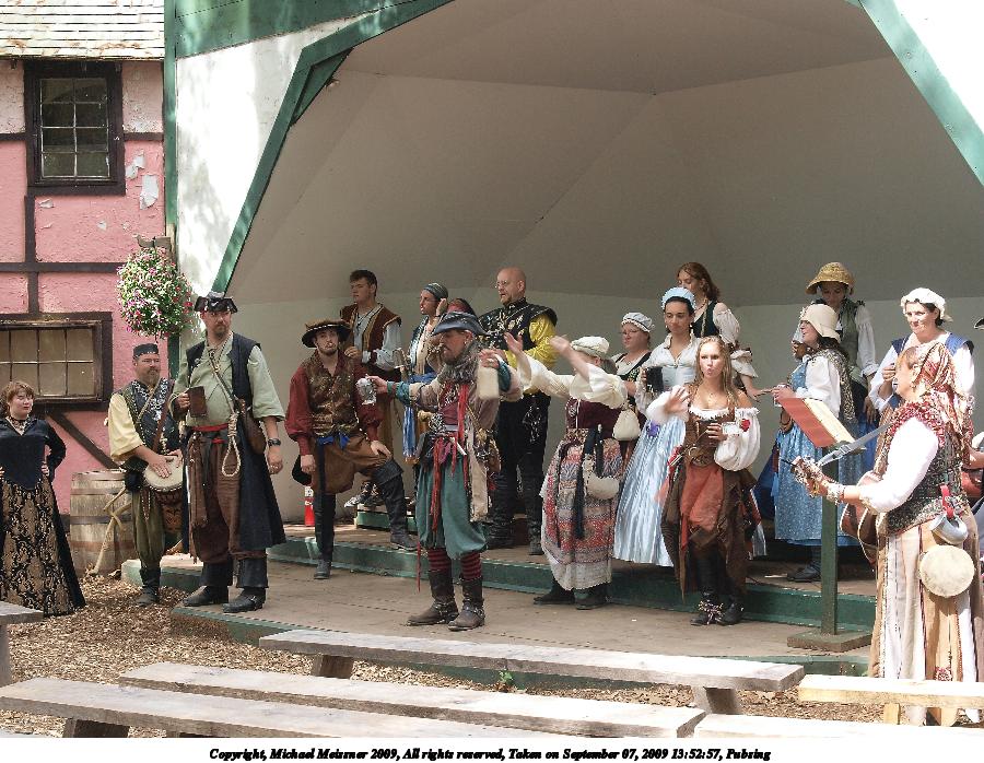 Picture #2: The 3 Graces Thumb: 400x200, 29,676 bytes (29K) Small: 800x423, 59,790 bytes (59K), (html file) Large: 3200x1600, 3,150,127 bytes (3.0M), (html file) Copyright, Michael Meissner 2009, All rights reserved Olympus E-3 camera with Olympus 14-54mm f/2.8-3.5 lens f/3.5, ISO 800, 1/100 sec, 52.0mm, auto mode, natural color, auto gradation, SHQ, center weight metering, IS1 (All Direction Shake IS), noise filter low 35mm equivalent focal length 104.0mm Programs used: gimp, neatimage Taken by Michael Meissner on September 07, 2009 17:47:13 Last modified on January 31, 2011 at 22:05 The 3 Graces now perform at other faires. In 2009, the middle actor was no longer with King Richards, but she came as a patron and they were asked to come up to the finale to do a number. |