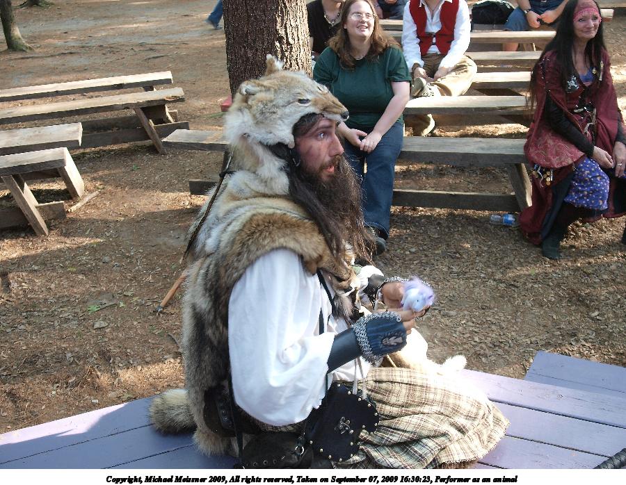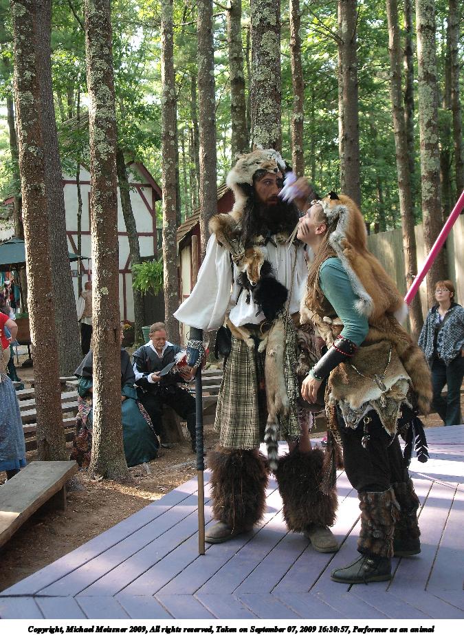 Picture #18: Performer as an animal Thumb: 450x338, 57,949 bytes (57K) Small: 900x698, 185,952 bytes (182K), (html file) Large: 3600x2700, 10,824,806 bytes (11M), (html file) Copyright, Michael Meissner 2009, All rights reserved Olympus E-3 camera with Olympus 14-54mm f/2.8-3.5 lens f/3.3, ISO 500, 1/80 sec, 37.0mm, auto mode, natural color, auto gradation, SHQ, matrix metering, IS1 (All Direction Shake IS), noise filter low 35mm equivalent focal length 74.0mm Programs used: default crop, gimp Taken by Michael Meissner on September 07, 2009 16:06:13 Last modified on January 30, 2011 at 22:32 |