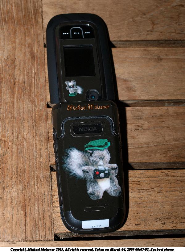 Picture #3: Squirrel phone #3 600x816, 120,654 bytes (118K), (html file) Copyright, Michael Meissner 2009, All rights reserved Olympus E-3 camera with Olympus 50mm f/2.0 lens f/8.0, ISO 100, FL-50 flash, 1/100 sec, 50.0mm, aperture priority, natural color, auto gradation, matrix metering, IS1 (All Direction Shake IS) 35mm equivalent focal length 100.0mm Extra equipment used: FL-50 flash Programs used: gimp, rotate Taken by Michael Meissner on March 04, 2009 00:07:02 Last modified on March 04, 2009 at 00:25 |