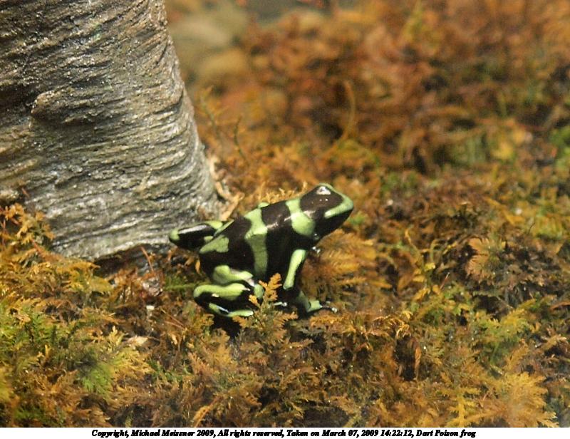 Picture #3: Dart Poison frog 800x616, 131,772 bytes (129K), (html file) Copyright, Michael Meissner 2009, All rights reserved Olympus E-3 camera with Olympus 14-54mm f/2.8-3.5 lens f/3.5, ISO 1250, 1/100 sec, 54.0mm, auto mode, natural color, auto gradation, matrix metering, IS1 (All Direction Shake IS) 35mm equivalent focal length 108.0mm Extra equipment used: shot through glass Programs used: gimp Taken by Michael Meissner on March 07, 2009 14:22:12 Last modified on March 08, 2009 at 09:05 |