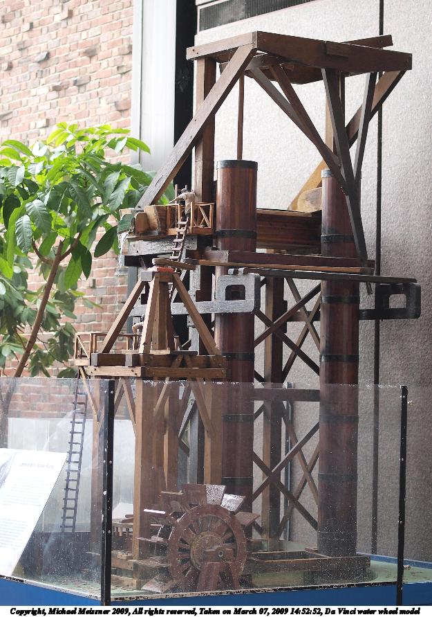 Picture #1: Da Vinci water wheel model 625x891, 154,253 bytes (151K), (html file) Copyright, Michael Meissner 2009, All rights reserved Olympus E-3 camera with Olympus 50mm f/2.0 lens f/2.0, ISO 200, 1/100 sec, 50.0mm, auto mode, natural color, auto gradation, matrix metering, IS1 (All Direction Shake IS) 35mm equivalent focal length 100.0mm Programs used: gimp, rotate Taken by Michael Meissner on March 07, 2009 14:52:52 Last modified on March 08, 2009 at 19:49 |