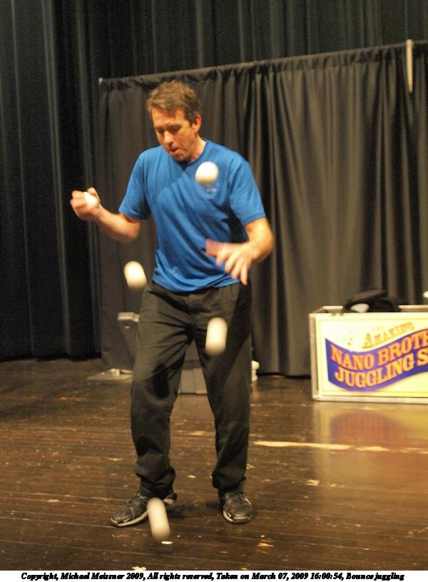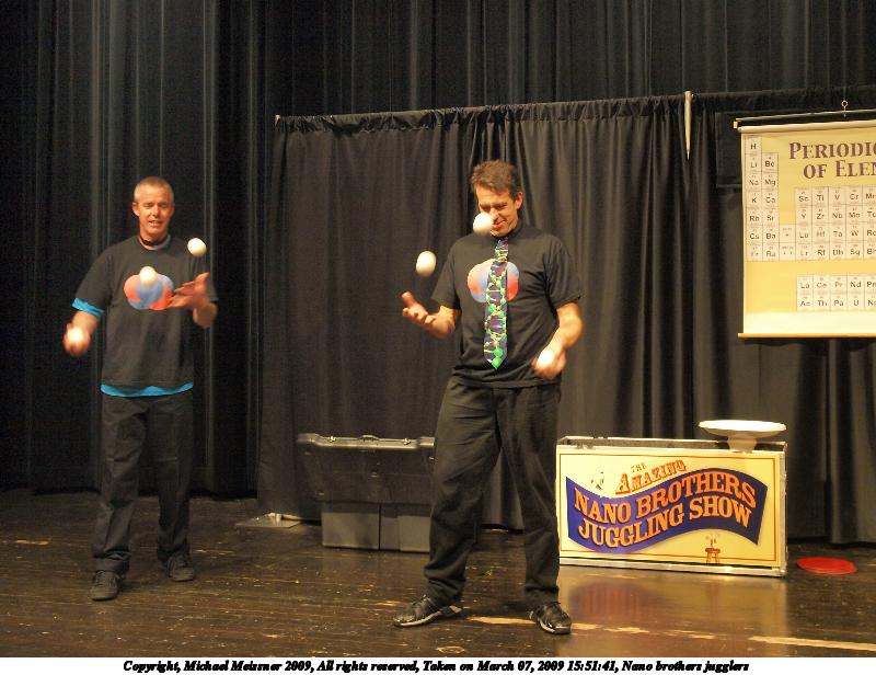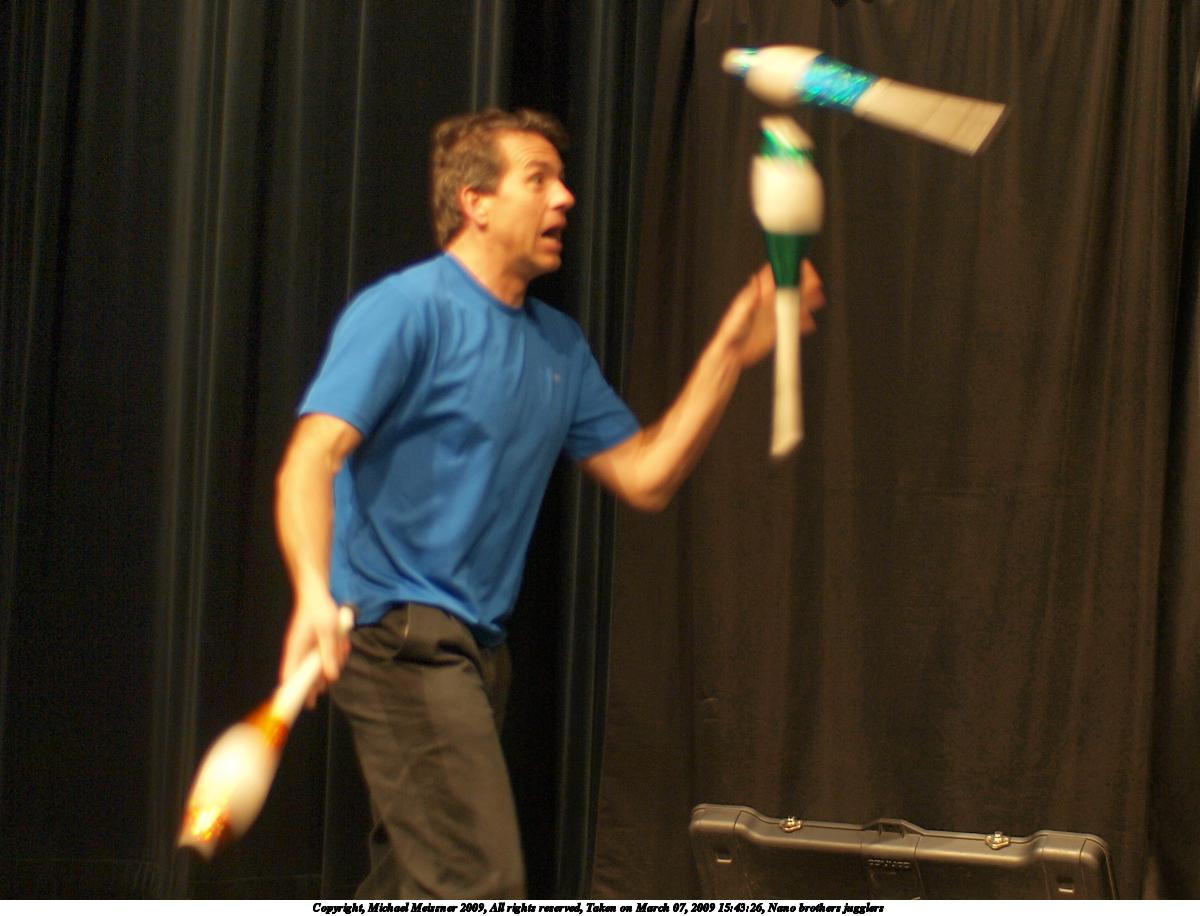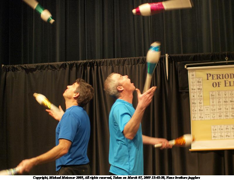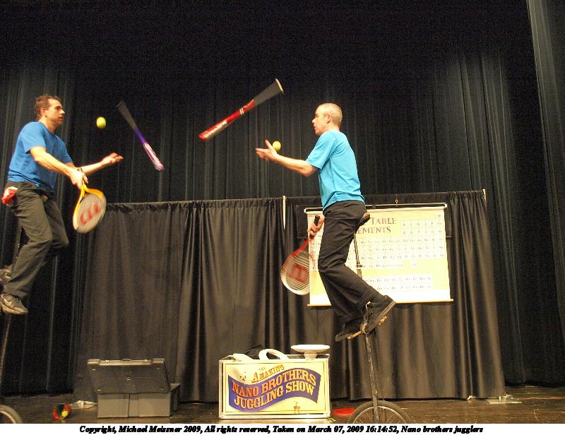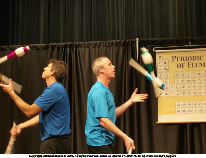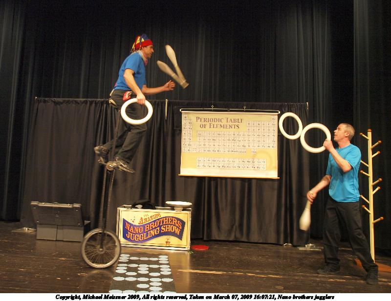 Picture #17: Nano brothers jugglers #6 800x616, 117,028 bytes (115K), (html file) Copyright, Michael Meissner 2009, All rights reserved Olympus E-3 camera with Olympus 14-54mm f/2.8-3.5 lens f/2.8, ISO 1250, 1/60 sec, 14.0mm, auto mode, natural color, auto gradation, matrix metering, IS1 (All Direction Shake IS) 35mm equivalent focal length 28.0mm Programs used: gimp Taken by Michael Meissner on March 07, 2009 16:14:52 Last modified on March 08, 2009 at 22:31 |