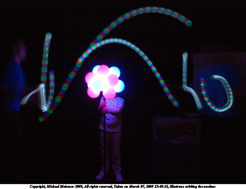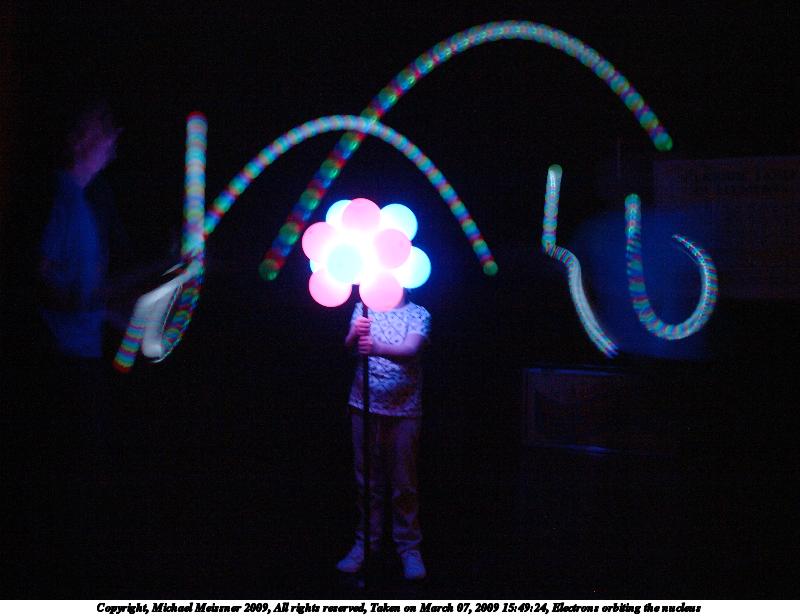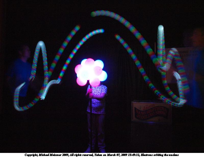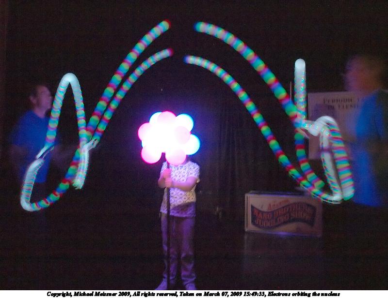 Picture #5: Electrons orbiting the nucleus 800x616, 74,237 bytes (73K), (html file) Copyright, Michael Meissner 2009, All rights reserved Olympus E-3 camera with Olympus 14-54mm f/2.8-3.5 lens f/2.8, ISO 1250, 0.6 sec, 14.0mm, auto mode, natural color, auto gradation, matrix metering, IS1 (All Direction Shake IS) 35mm equivalent focal length 28.0mm Programs used: NoiseNinja, gimp Taken by Michael Meissner on March 07, 2009 15:48:52 Last modified on March 08, 2009 at 20:04 These pictures were to demonstrate the electrons orbiting the nucleus of an atom. They were taken hand held with image stabalization on and at high ISO. The stage was darkened, except for the nucleus and the juggling balls that changed colors. I must say, I was surprised at how well these shots came out, given the conditions. |