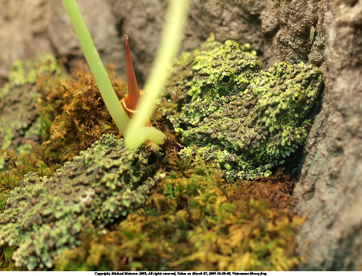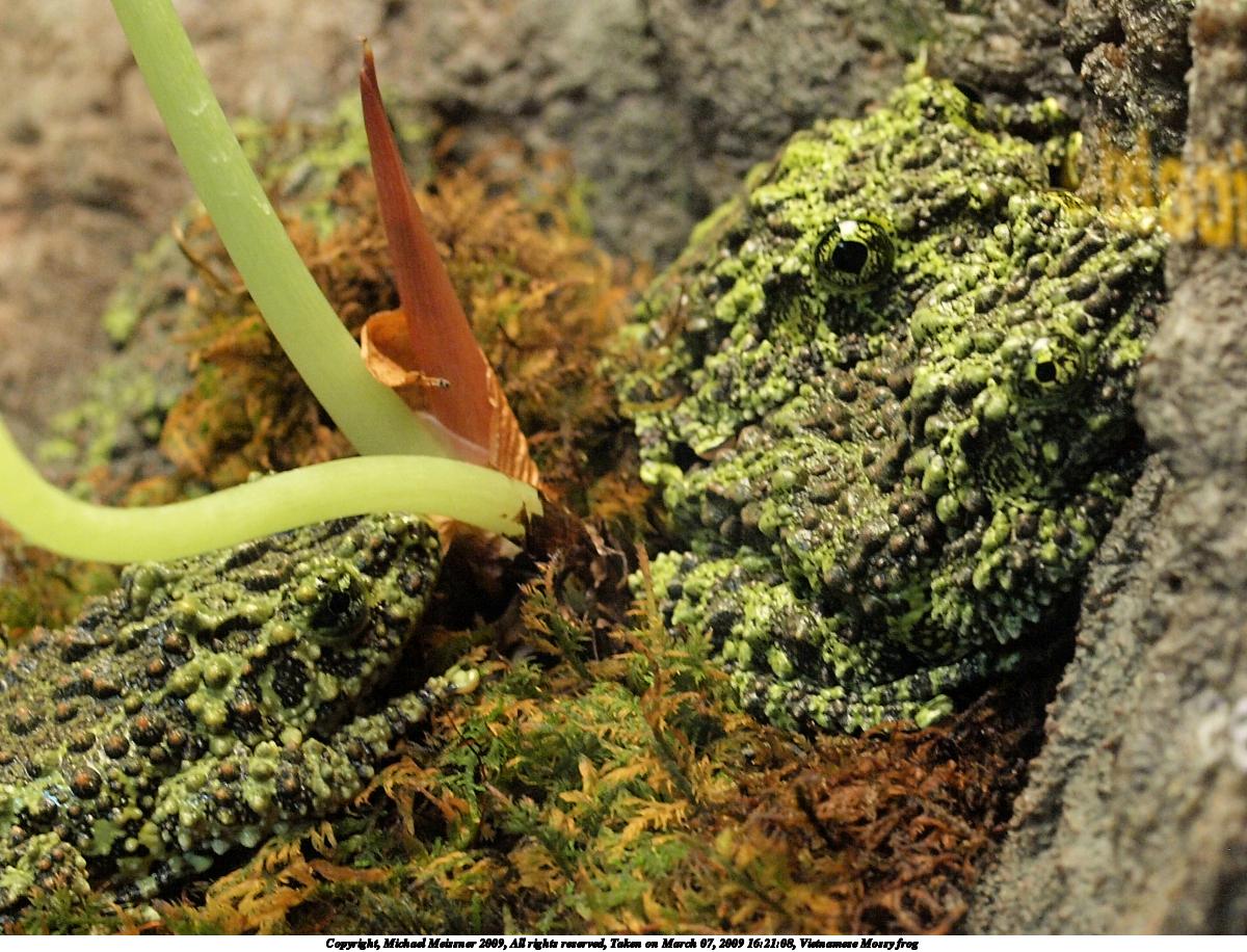 Picture #5: Vietnamese Mossy frog #2 1200x916, 236,956 bytes (232K), (html file) Copyright, Michael Meissner 2009, All rights reserved Olympus E-3 camera with Olympus 50mm f/2.0 lens f/5.6, ISO 1250, 1/50 sec, 50.0mm, aperture priority, natural color, auto gradation, matrix metering, IS1 (All Direction Shake IS) 35mm equivalent focal length 100.0mm Extra equipment used: shot through glass Programs used: gimp Taken by Michael Meissner on March 07, 2009 16:21:08 Last modified on March 08, 2009 at 09:16 |