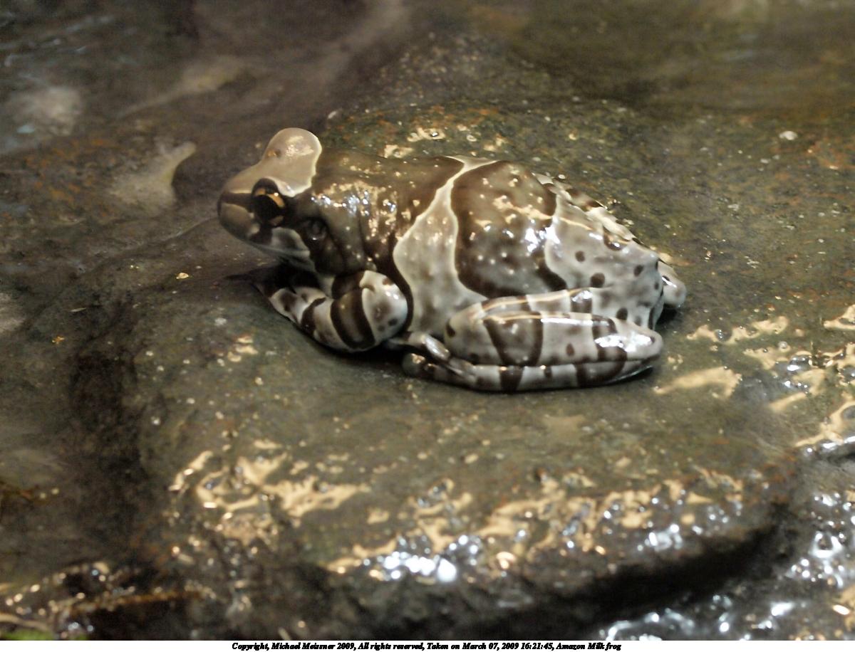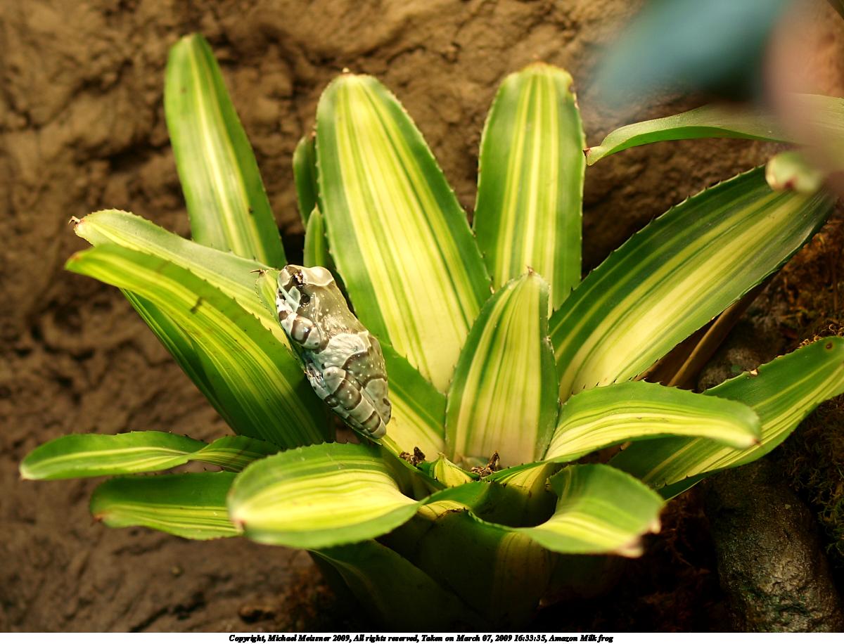 Picture #6: Amazon Milk frog 1200x916, 159,459 bytes (156K), (html file) Copyright, Michael Meissner 2009, All rights reserved Olympus E-3 camera with Olympus 50mm f/2.0 lens f/5.6, ISO 1000, 1/100 sec, 50.0mm, aperture priority, natural color, auto gradation, matrix metering, IS1 (All Direction Shake IS) 35mm equivalent focal length 100.0mm Extra equipment used: shot through glass Programs used: gimp Taken by Michael Meissner on March 07, 2009 16:21:45 Last modified on March 08, 2009 at 09:19 |